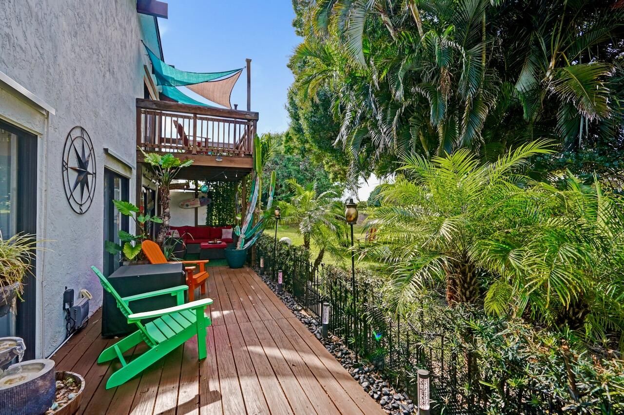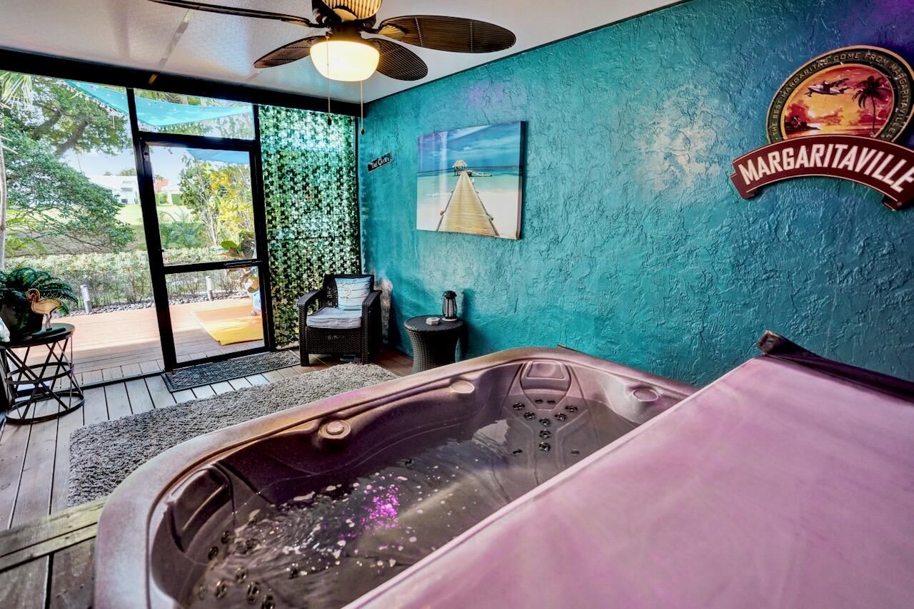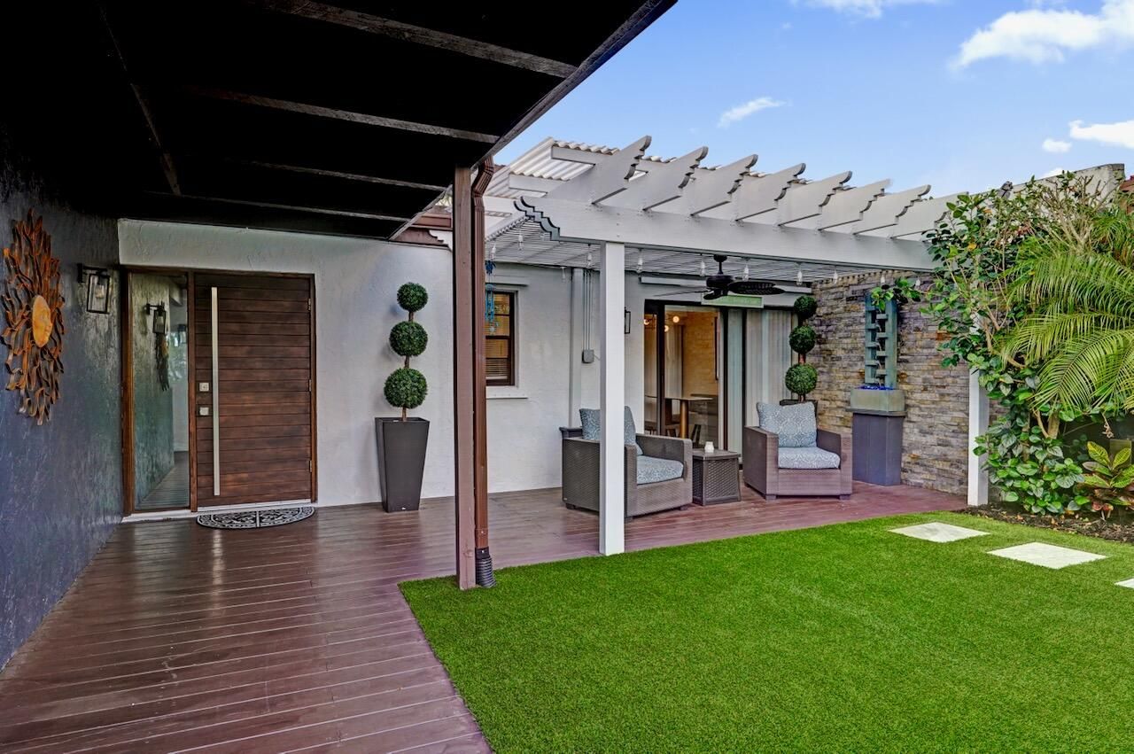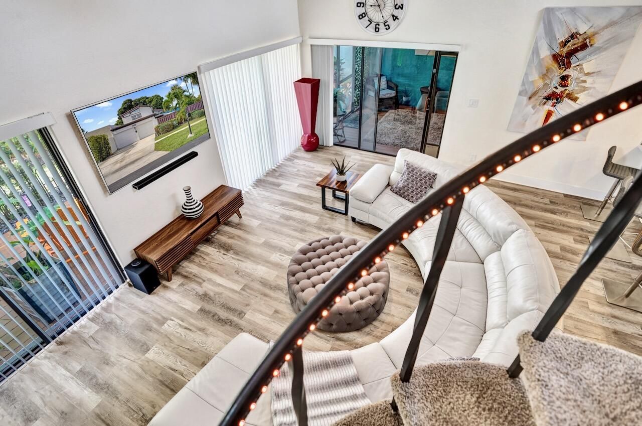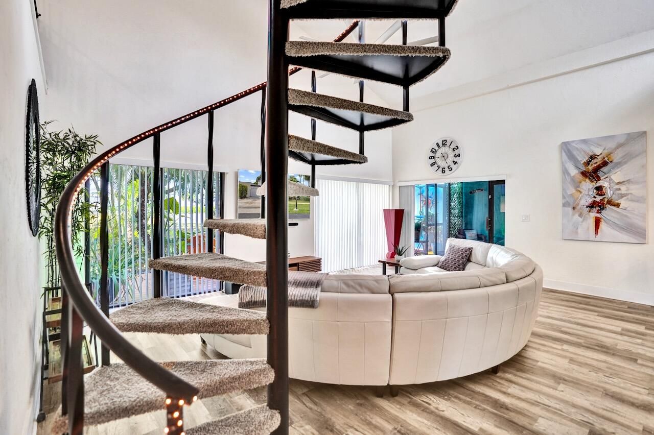 Welcome home to this bright and beautifully updated townhome in the J & J Patio Homes subdivision of the highly desirable 55+ community of Indian Spring! This unique 3-bedroom, 3-bathroom 2-story home has the most incredible vibe, beautiful updates and the best outdoor space in Indian Spring! The first floor living area features plank vinyl flooring, fresh paint, high ceilings and tons of natural light. The kitchen has been completely updated with white shaker cabinets, quartz countertops and newer stainless-steel appliances and includes an eat-in dining area looking out into the serene courtyard. The main floor boasts a large living room that looks out onto the golf course, a full bedroom suite with a walk-in closet and updated vanity, in addition to another bedroom and full bathroom with an updated vanity. Up the spiral staircase, there is a huge loft overlooking the living room with plank tile flooring, perfect for entertainment with an outdoor balcony overlooking the golf course. Also upstairs is the primary bedroom suite with a fully updated bathroom, and a huge walk-in closet with built-ins. The outdoor living space of this home will not disappoint! The front courtyard features custom lighting, turf grass, lush landscaping including a mango tree, zen-style artwork and accents, a deck patio with a covered pergola, misting system and waterfall wall. But that's not all! The back, screened-in patio features a large hot-tub space, and then leads out to beautiful decking. The back deck includes a grilling area, in addition to a covered deck area. The entire deck area is fenced in, includes landscape lighting and looks out onto the Indian Spring golf course. This home is truly move-in ready with major updates throughout: 2019 roof, brand new gutters, 2019 A/C and 2019 water heater. Furniture is negotiable, and the home can be sold turnkey. Indian Spring is a vibrant, active 55+ community with a manned guard gate and low HOA fees that include cable and security. Membership to the Indian Spring Country Club is optional. This home is truly one of a kind and will not last long! INFORMATION HEREIN NOT GUARANTEED AND SUBJECT TO ERRORS & OMISSIONS. ALL MEASUREMENTS APPROXIMATE.