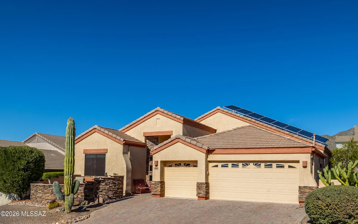 The Everest Model - a true 3 car garage & a 3 or 4 bedroom w/grand great room area + bonus/family room & a huge gourmet kitchen. The model names says it all- Everest - majestic! The 3 car garage is highly desirable - the useable space is great - NO carpet. A relaxing front courtyard + a fabulous backyard w/firepit, outdoor galley kitchen & an ground set relaxing spa. Peak-a-boo mountain views and a peaceful setting. Another great asset: owned outright solar system. Electric bills are basically non-existent! Majority of kitchen appliances replaced recently, hot water heater replaced in 2025. Fenced yard. Stacked stone front veneers add much character. This is a lovely home - very spacious home - with great storage and useful rooms. Floor plan posted in MLS Documents. Call to view.
