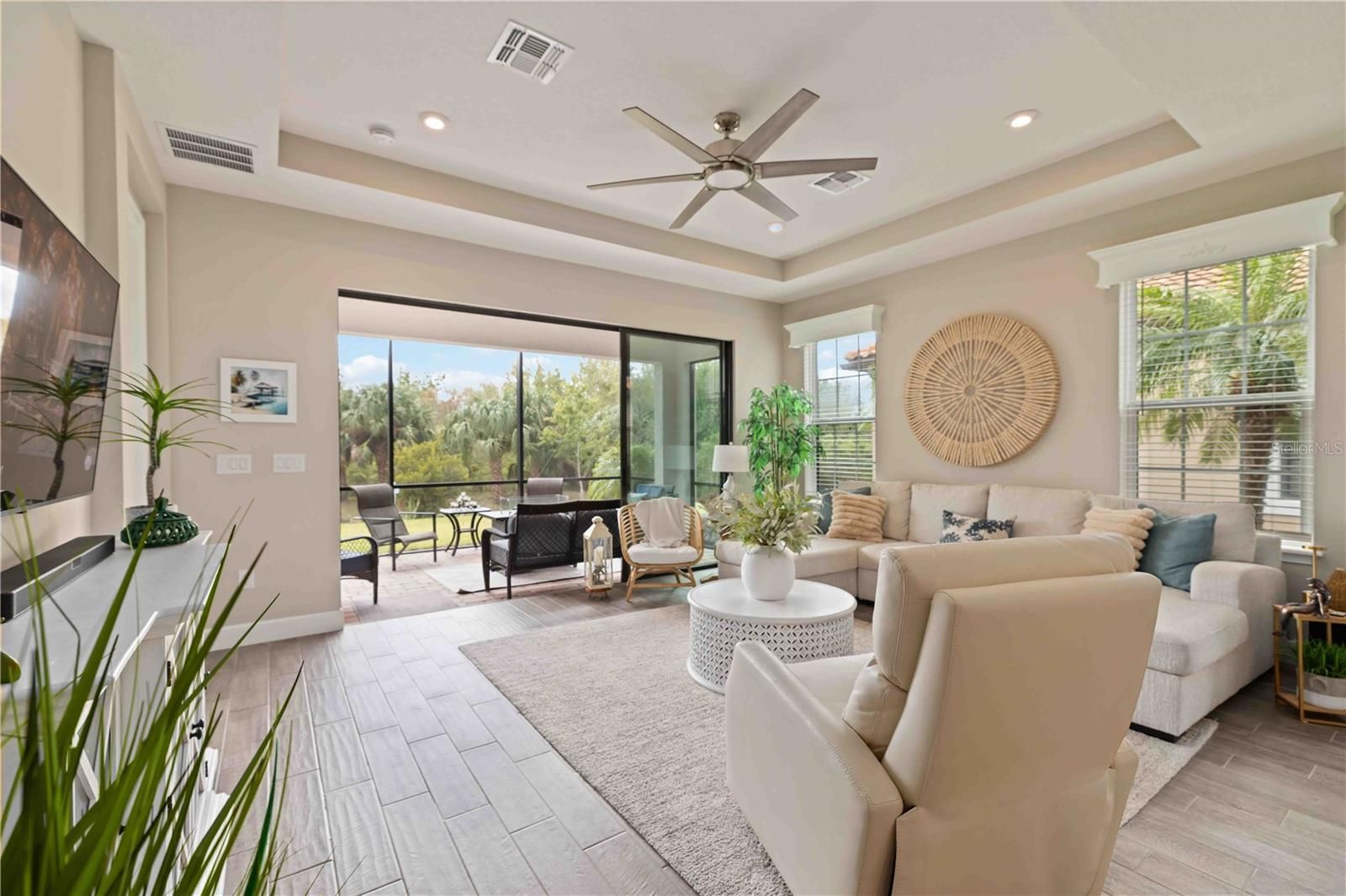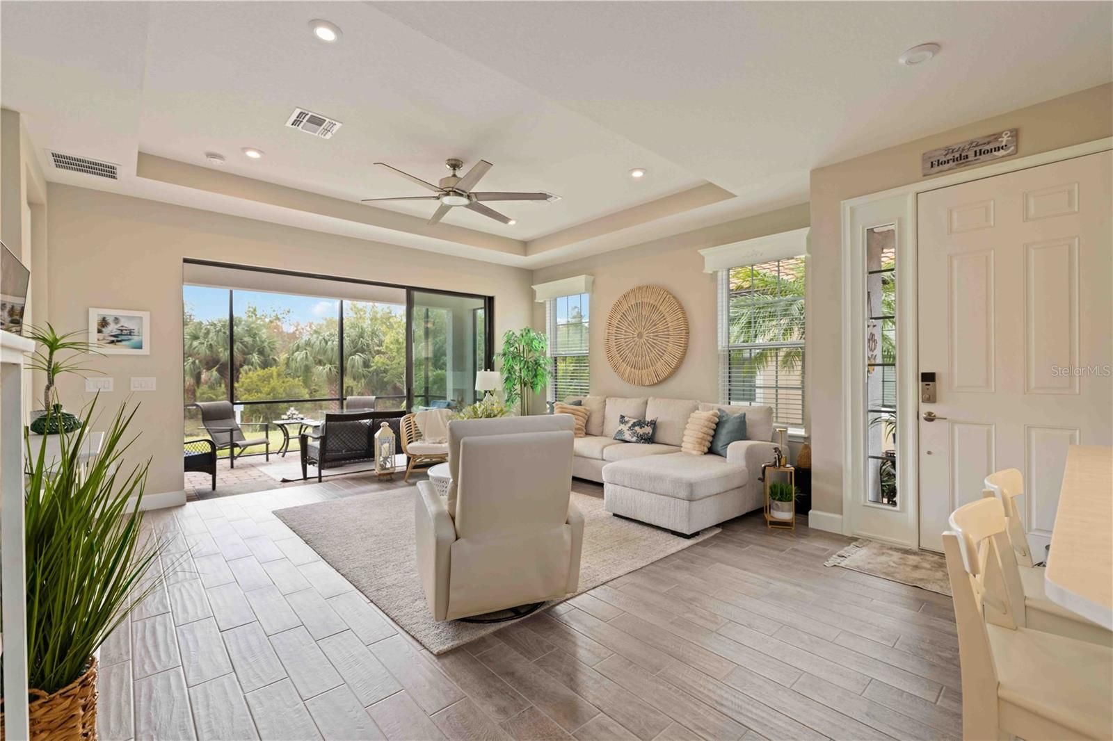 Welcome to Your Dream Lakeview Retreat Located at 5335 Rushmere court in the prestigious Artisan Lakes Esplanade—a resort-style, maintenance-free gated community in Palmetto, FL—this villa offers the ultimate in luxury living. Nestled on a preserve lot with a side view of the pond. The extended screened lanai is an entertainer’s dream to sit out and sip coffee while taking in nature views and the pond. Elegant Interior Features, Step inside to a bright, open-concept floor plan with soaring 10' ceilings, elegant tray details, and 8' doors throughout. Highlights include: 2 Bedrooms + Den/Office with pocket doors and a custom murphy bed, along with a separate dining area, 2.5 Bathrooms. Luxury wood-look plank tile flooring, large set of sliding glass doors for abundant natural light. Beautiful kitchen with custom glass backsplash, stainless steel appliances, 42” upper white cabinets with multi colored lighting remote for above cabinetry and below, Cambria Quartz countertops, and a gas cooktop for precision cooking. Serene Primary Suite, Retreat to your primary bedroom Nature preserve views. a large walk-in closet for optimal storage. Home has custom window treatment and balances throughout. Extended large laundry room with cabinetry, utilitiy sink and window for natural light. Primary bedroom closet wood organizer installed. Luxury lighting through out home comes with dimmers. Home has gutters installed and recently had the driveway pavers sealed. 2-Car Garage with custom paint, epoxy and custom shelving above the garage door and the perimeter with hooks for all your storage needs., Hurricane Shutters Included. Live the Esplanade Lifestyle From lush landscaping and scenic lakes to high-end amenities and a vibrant social calendar, Artisan Lakes Esplanade offers a lifestyle like no other—designed for those who appreciate elegance, comfort, and convenience. With easy access to I-75, you're just a short drive from the Gulf of Mexico beaches, shopping, dining, and Tampa, St. Petersburg, Bradenton, and Sarasota. Experience the perfect blend of luxury and location in this pet-friendly oasis. Living in the HOA maintained community, Artisan Lakes at Esplanade means indulging in an array of amenities, including a state-of-the-art fitness center, tennis courts, pickleball courts, bocce ball, a resort-style pool with cabanas, a hot tub, and a resistance pool. Nature lovers will appreciate the walking trails, dog parks, playground, and butterfly garden. The HOA provides cable TV, internet service, and yard maintenance, ensuring a convenient and enjoyable living experience. No evacuation zone, No flood insurance required, 40 feet elevation. 2 large pools, lap swim lanes, spa, resistance pool, pickleball, tennis, bocce, shuffleboard, full fitness enter, lots of classes, clubs and events for all interests. Enjoy the best of Florida living and schedule your showing today to make this exquisite home yours. Don't miss out on the chance to immerse yourself in the resort-style living offered by the at Artisan Lakes of Esplanade