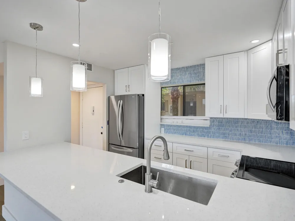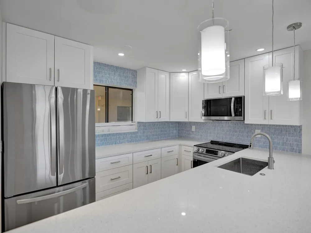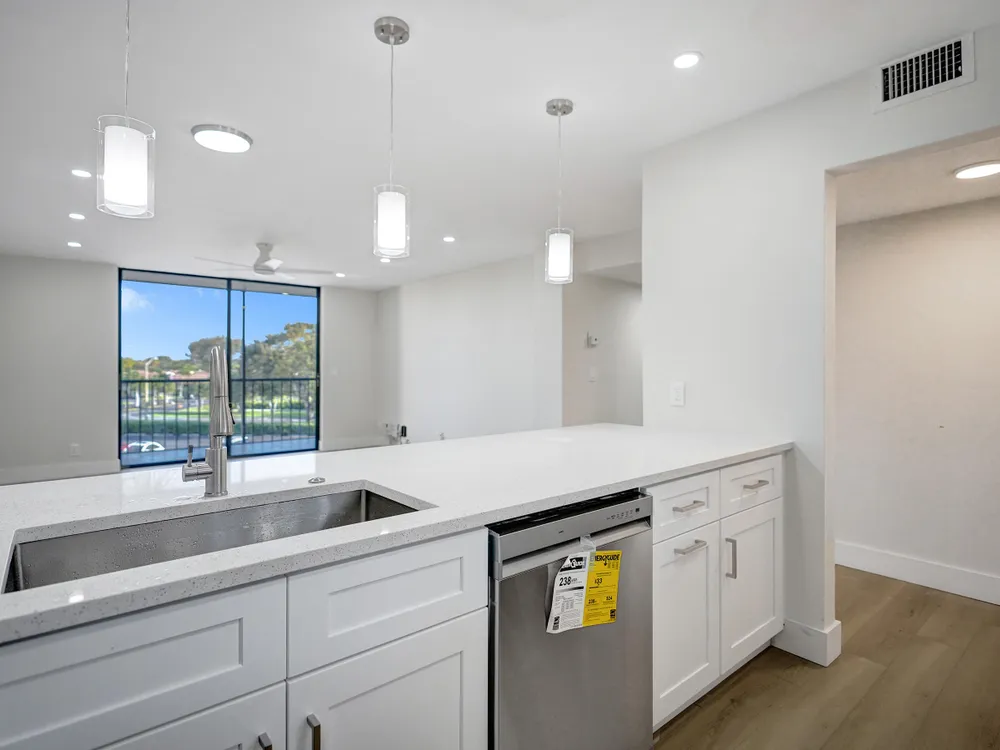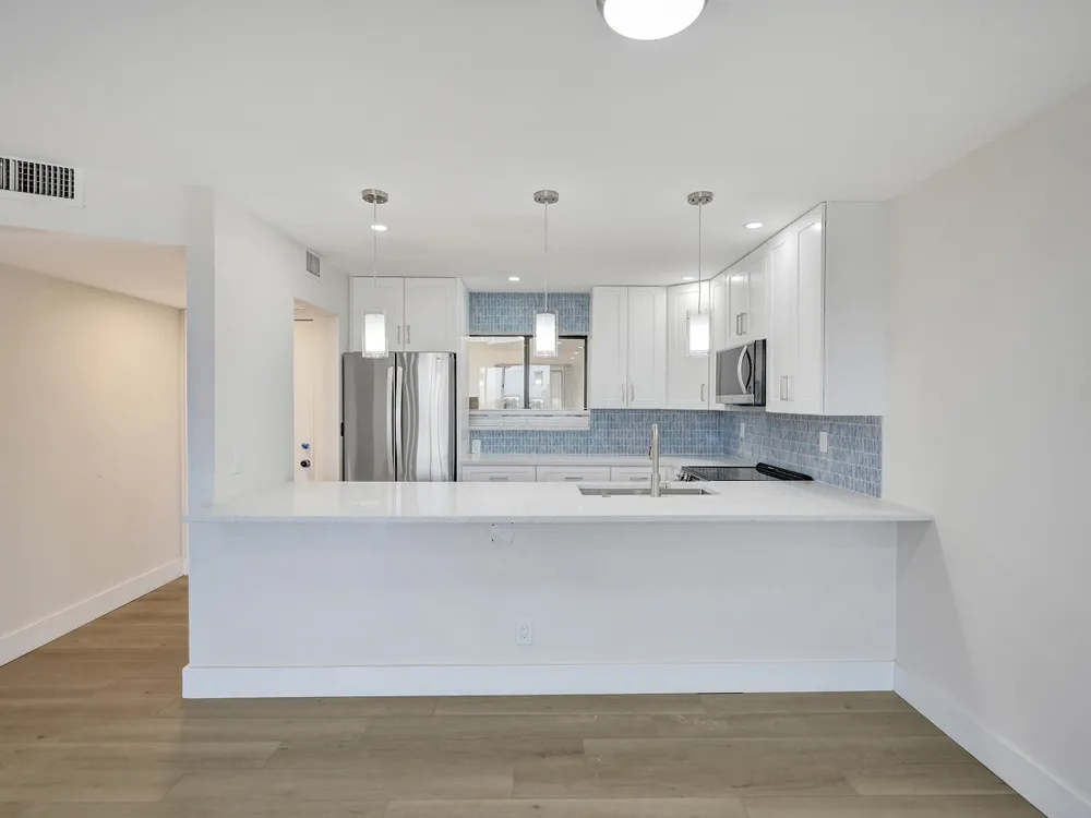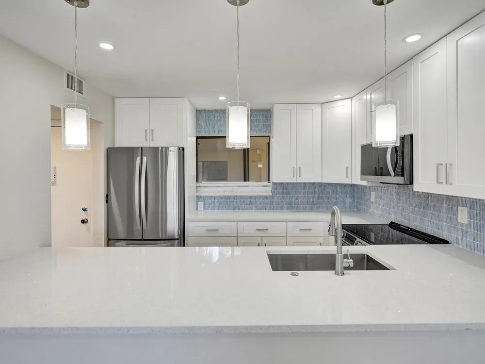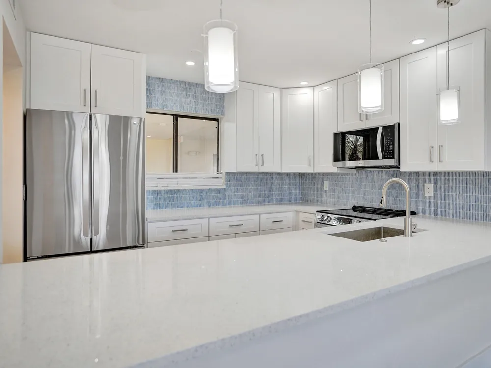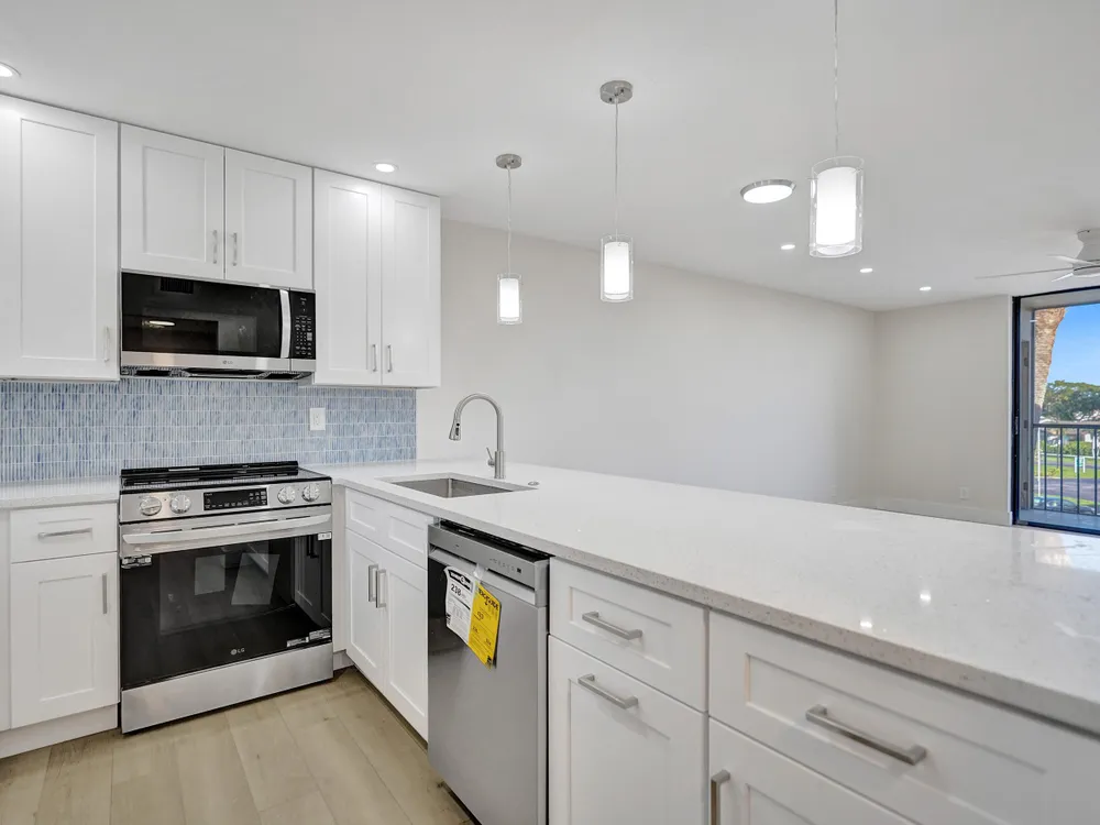 Exquisite top floor condo where modern sophistication meets attention to detail. Fully renovated from top to bottom, 2bedroom, 2-bathroom home offers fine luxury living. Ride the elevator to your oasis, where an open floor plan showcases high-end plank flooring and tons of natural light. NEW A/C System 2/7/2025 The gourmet kitchen boasts shaker cabinets, quartz countertops, stainless steel Smart Home enabled LG appliances, perfect for cooking and entertaining. Bathrooms have stunning large format tile, spa-like finishes. Recessed LED lighting throughout. Washer and dryer included. In a prestigious gated community, this condo offers a private lake, huge clubhouse and fully equipped gym. With 24/7 security.