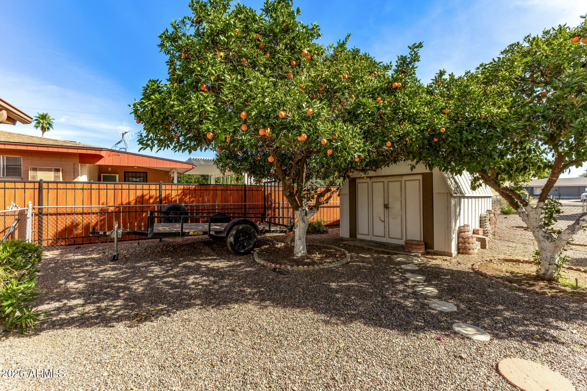 This well-maintained home has a nice open floor plan, North/South exposure. a 2-car garage and an additional covered parking spot, a large indoor laundry/hobby room with sink, desk, and lots of cabinet storage, a workshop with lots of shelves, and an Arizona room which adds to the livable space. Big fenced in back yard with 2 orange trees and a storage shed. Quiet 55+ community with no HOA, but for $270 per year you can join the optional community club. Community club features several clubs that meet weekly, woodshop, lapidary rock grinding, ceramics, gym, pool tables, and much more!