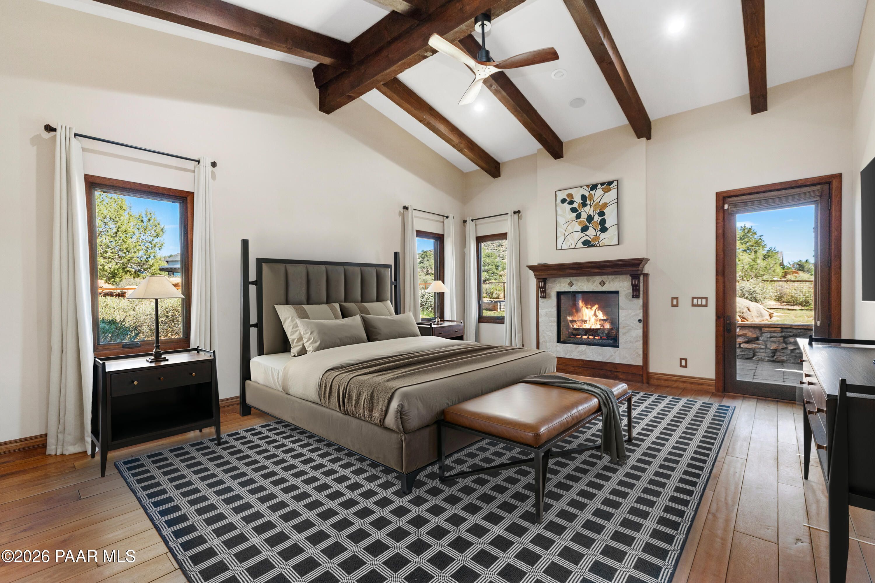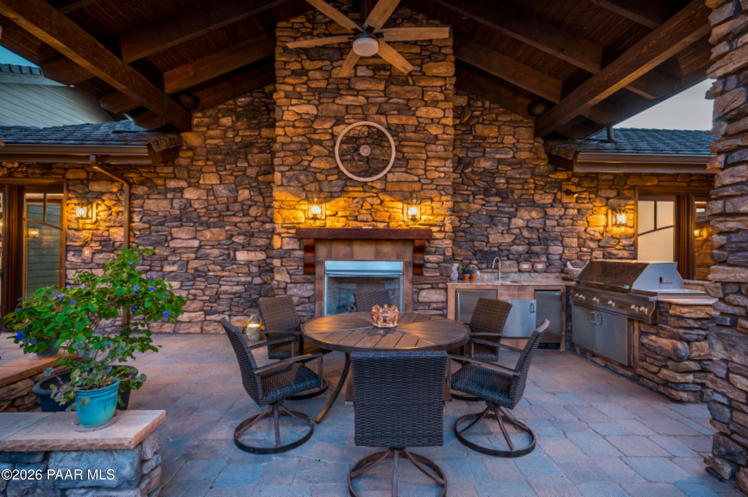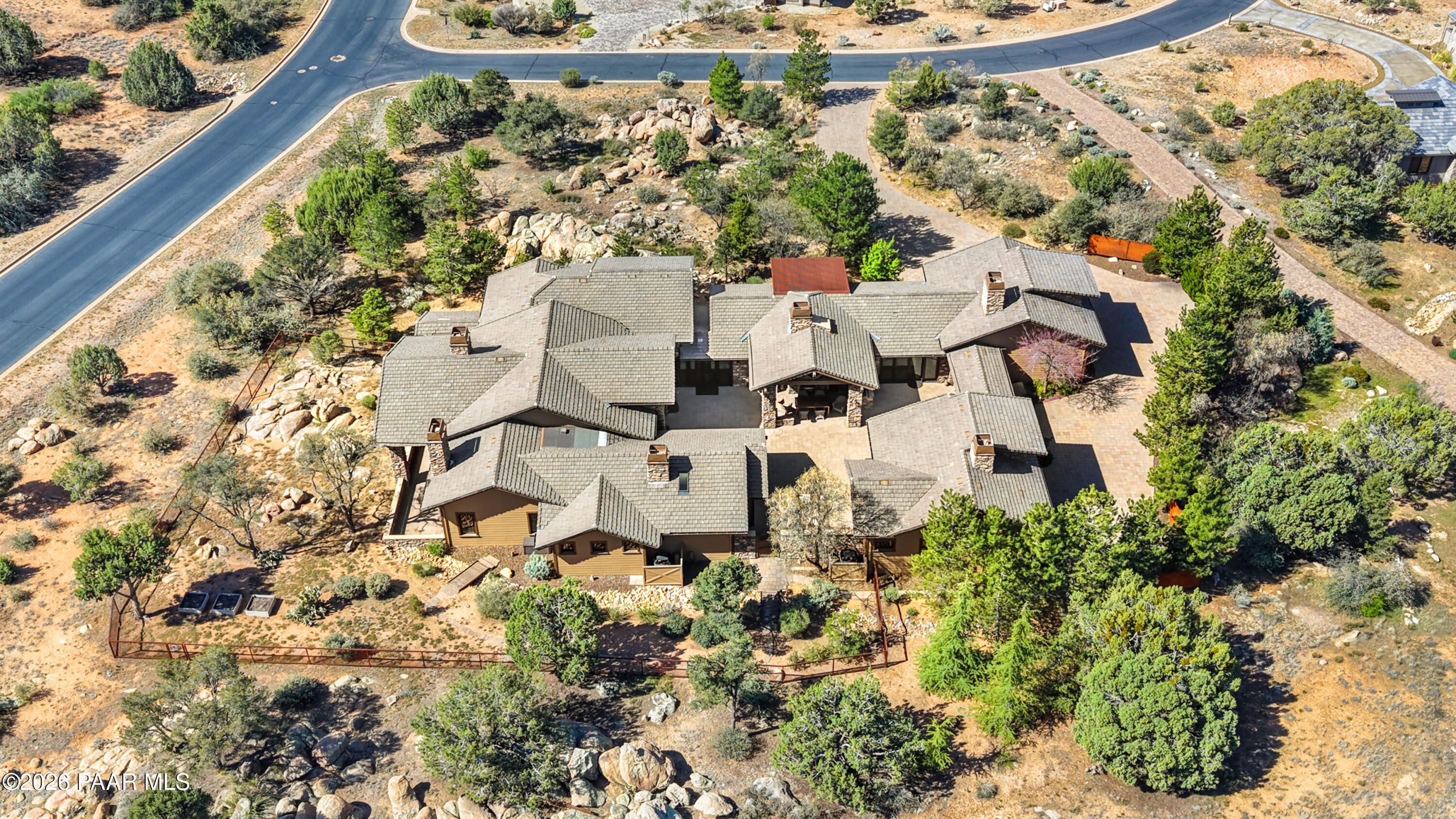 Welcome to this exceptional 5,178 SF estate, situated on a 1.35-acre corner lot in the prestigious Talking Rock Ranch located in Prescott AZ. A resort-like community with 24/7 security at the main gate and club amenities which attract even world travelers. This property perfectly exemplifies rustic mountain elegance blended with upscale, Old-World design. The 4,697 SF main residence features three spacious bedrooms with en-suite baths and high-end finishes, including walnut wood flooring, granite, onyx, and travertine. The gourmet kitchen is equipped with top-of-the-line Wolf appliances, a butler's pantry, and unique custom artwork by artist Michael Shea. The master suite offers a spa-like experience with a grand shower, spa tub, and private laundry. Reminiscent of a Tuscan villa, the home surrounds a grand inner courtyard featuring an outdoor kitchen, a fireplace, a water feature, and a gardener's potting shed. Additionally, a separate 481 SF guest casita includes a kitchenette, full bath, and its own garage and workshop, making it ideal for guests or multigenerational living. Schedule your private tour of this magnificent property today!