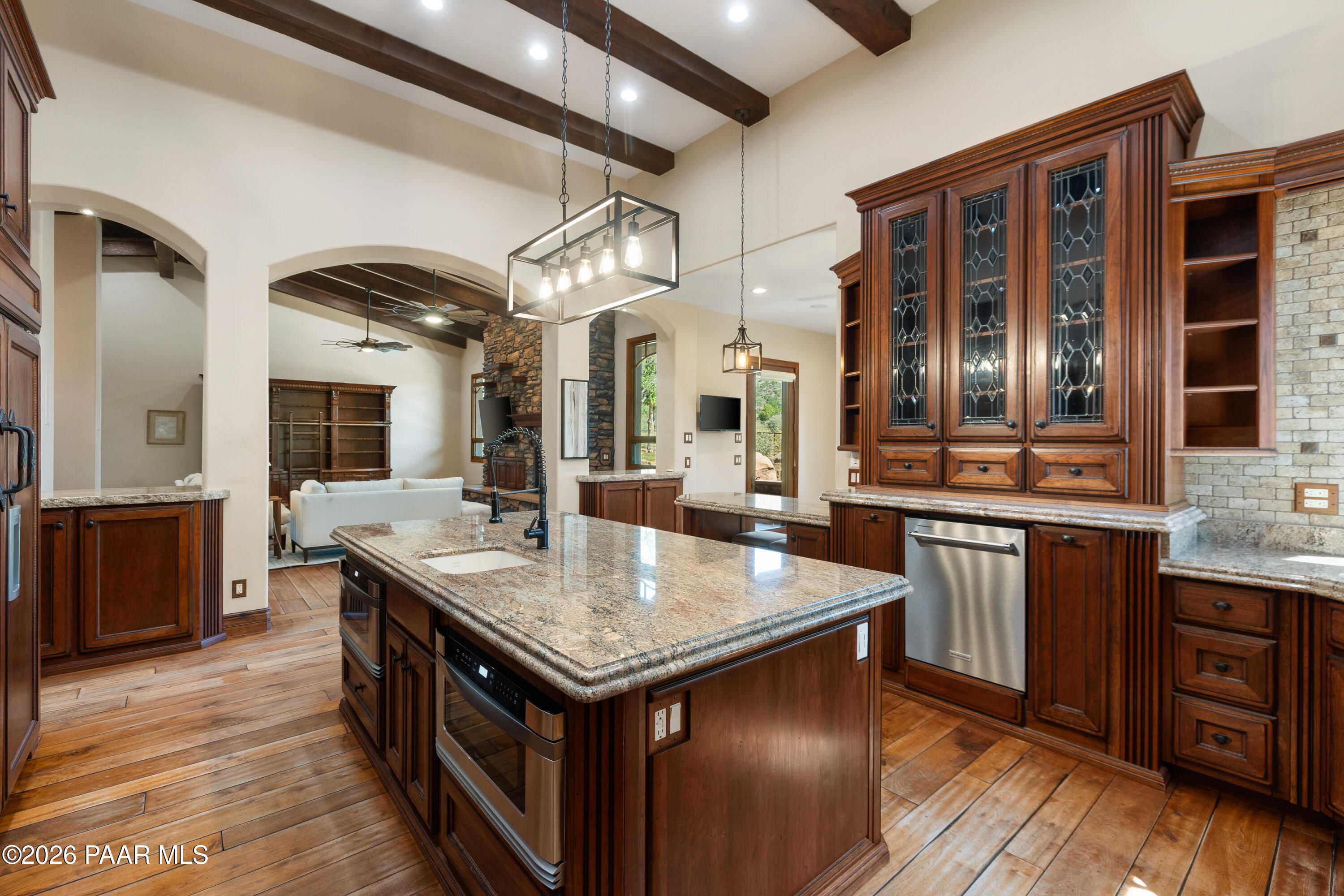 - Beamed Ceilings, Ceiling Fan(s), Wired for Data, Separate/Formal Dining Room, Granite Counters, Kitchen Island, Single Living Level, Primary Downstairs, Pantry, High Ceilings, Vaulted Ceiling(s), Walk-In Closet(s), Washer/Dryer Hookup