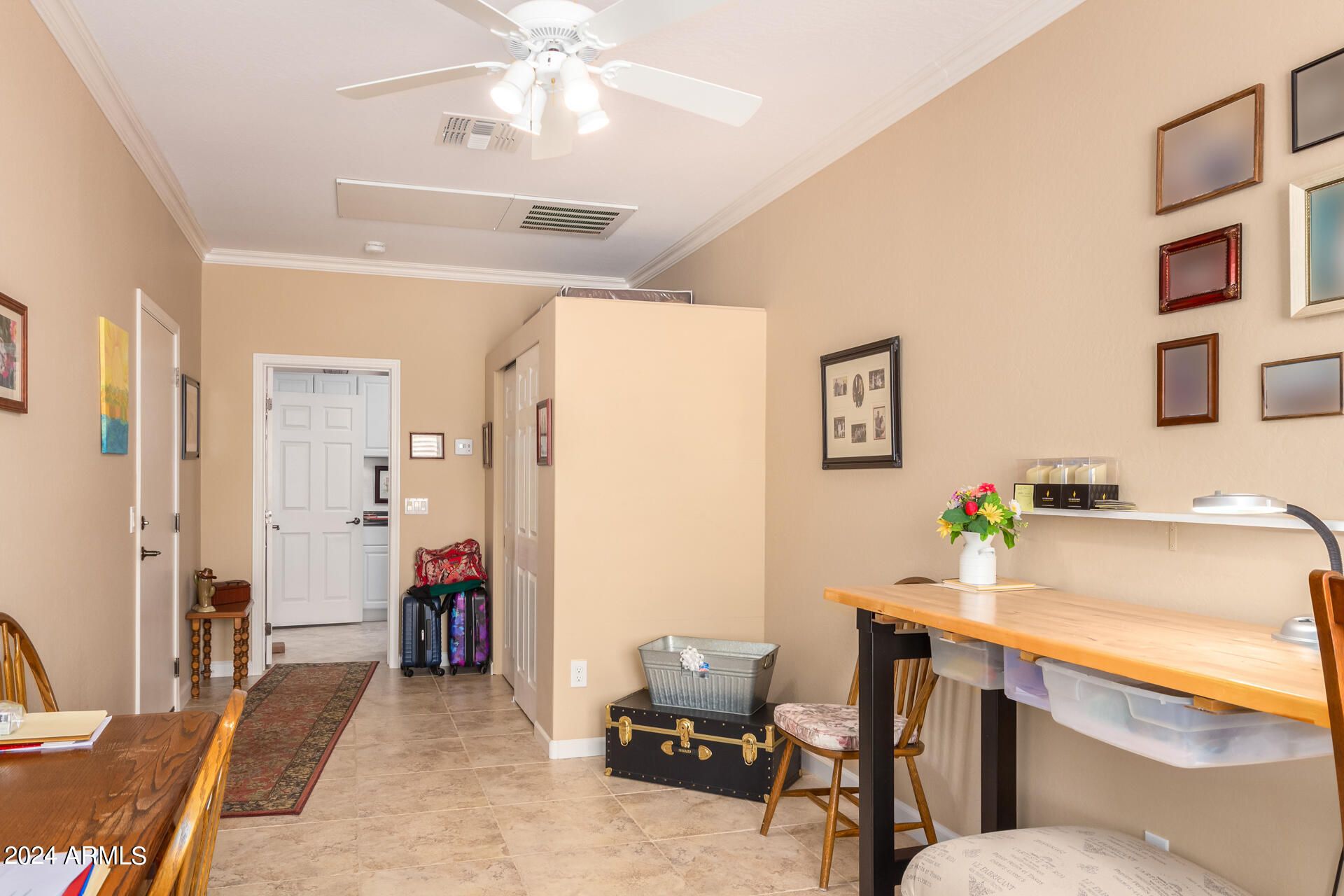 NEW EXTERIOR PAINT (SEPT 2025) This best-value Talavera Model, built with durable Integra Block construction, offers 2,530 sq ft on a beautiful North/South-facing view lot. Extended pavers lead to a private courtyard and custom knotty alder front door. Inside, enjoy tile floors, crown molding, and wood-framed windows. The kitchen boasts 42'' cabinets, granite counters, pull-out shelves, gas cooktop, touchless faucet, and new microwave. Features include 3 bedrooms, 2.5 baths, den/office, and a versatile hobby/bonus room with walk-in closet & independent AC & heat. The 2-car garage has a 4' extension, sink, and side door; golf cart conveys. Bay windows, extended patio with outdoor furniture and flowerpots, complete this stunning home.