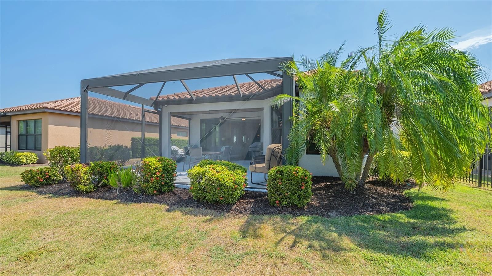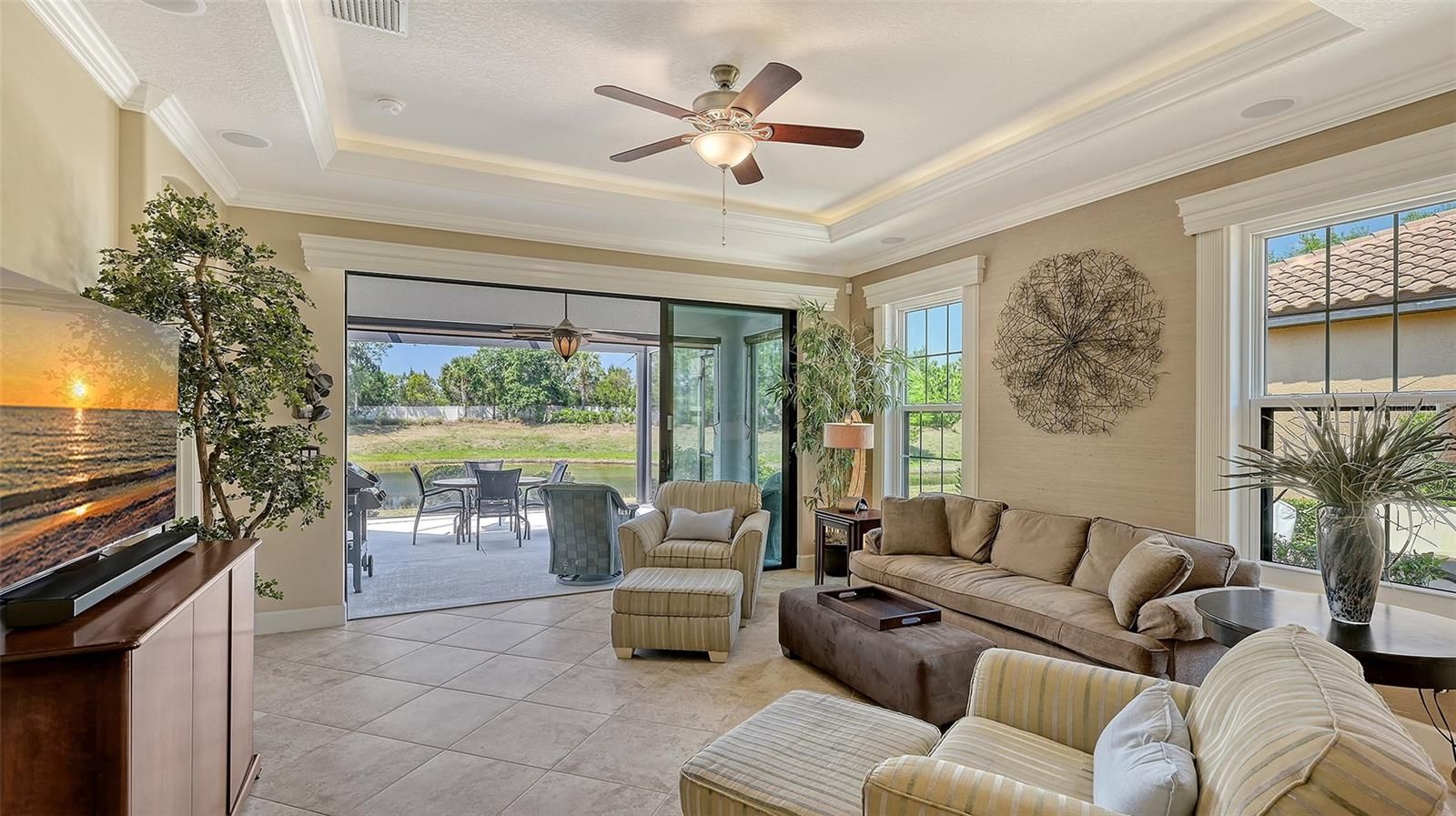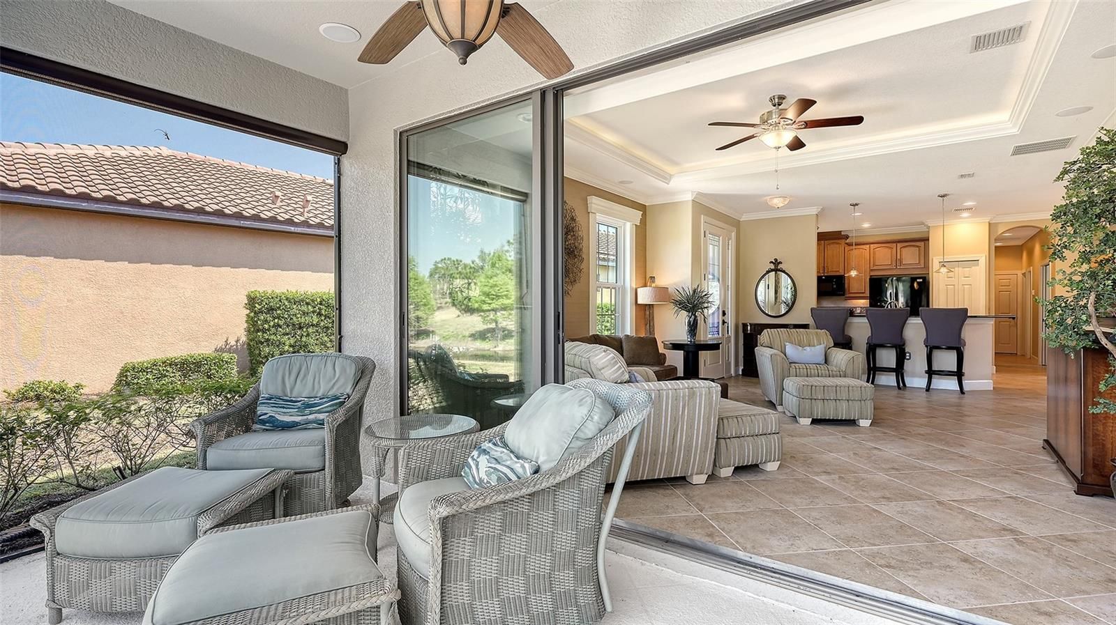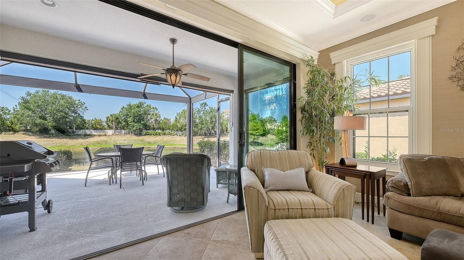Welcome to a truly one-of-a-kind opportunity to own a beautifully upgraded residence in the highly sought-after Esplanade at Lakewood Ranch, where everyday living feels like a luxury resort escape. Perfectly suited as a full-time residence or an ideal seasonal getaway to escape harsh northern winters, this stunning 2-bedroom, 2-bath home with a spacious den is ideally positioned on a private homesite with serene water views, surrounded by lush, meticulously maintained landscaping. From the moment you step inside, the pride of ownership and attention to detail are unmistakable, highlighted by an open-concept design with soaring tray ceilings, elegant crown molding, tile flooring throughout the main living areas, and abundant natural light. The gourmet kitchen serves as the heart of the home, featuring granite countertops, 42-inch upper cabinets, a tile backsplash, black stainless steel appliances including a brand-new refrigerator, a gas range, and a generous breakfast bar that flows seamlessly into the expansive living and dining spaces, making it perfect for both everyday living and entertaining. Step outside to the extended screened lanai, enhanced with premium panoramic picture-window screening, stamped concrete flooring, retractable sunshades, and beautiful Nebula LED lighting, creating an inviting space to unwind while enjoying peaceful water views. A built-in gas line is already in place for a future outdoor kitchen, making this an ideal setting for outdoor entertaining. The private owner’s suite is a tranquil retreat with a bay window sitting area, dual vanities, a large walk-in shower, and a custom-designed walk-in closet, while the guest bedroom offers comfort and privacy with its own en-suite bath. The versatile den, featuring double pocket doors and a transom window, is perfect as a home office, flex space, or optional third bedroom. This home truly stands apart with hurricane-impact glass windows installed in 2021 with a transferable warranty, an exceptional and valuable upgrade not found in many homes, providing enhanced storm protection, energy efficiency, and peace of mind. Additional improvements include a new HVAC system installed in 2022, a tankless hot water heater, central vacuum with kitchen toe-kick, surround sound speakers in the living room and lanai, and numerous thoughtful enhancements throughout. The oversized two-car garage features epoxy-coated floors, built-in shelving, and additional storage space, while the paver driveway and professionally lit walkway with uplighting add to the home’s welcoming curb appeal. The CDD bond has been paid in full, and ground maintenance is included in the HOA fees. Pets and fencing are permitted with size restrictions, offering added flexibility. Residents of Esplanade enjoy an unmatched array of resort-style amenities including tennis, pickleball, bocce ball, two fitness centers, resistance and lagoon-style pools, a full-service spa, outdoor grilling areas, fire pits, two dog parks, and the popular Tiki Bar. The state-of-the-art Culinary Center offers multiple dining options along with cooking classes, while golf enthusiasts can take advantage of the optional 18-hole championship golf course set across more than 600 acres of beautiful Florida landscape. All of this is just minutes from I-75, Lakewood Ranch Medical Center, Waterside Place, Lakewood Ranch Main Street, University Town Center, world-class shopping and dining, and the stunning Gulf Coast beaches.