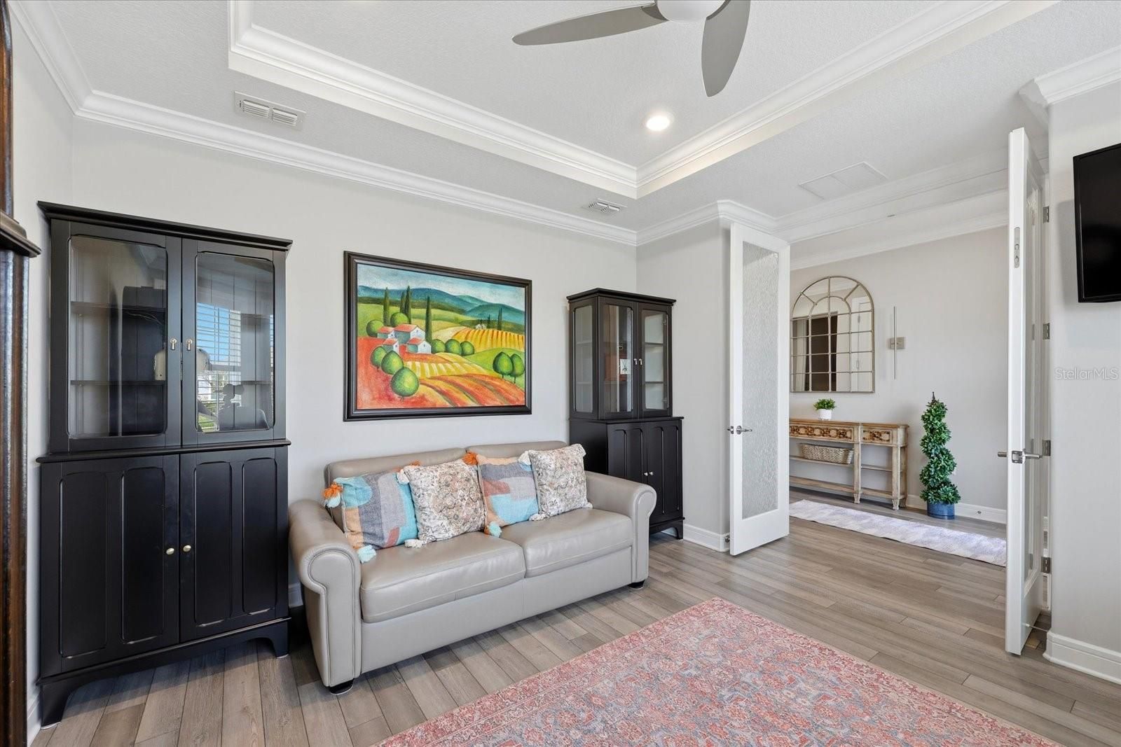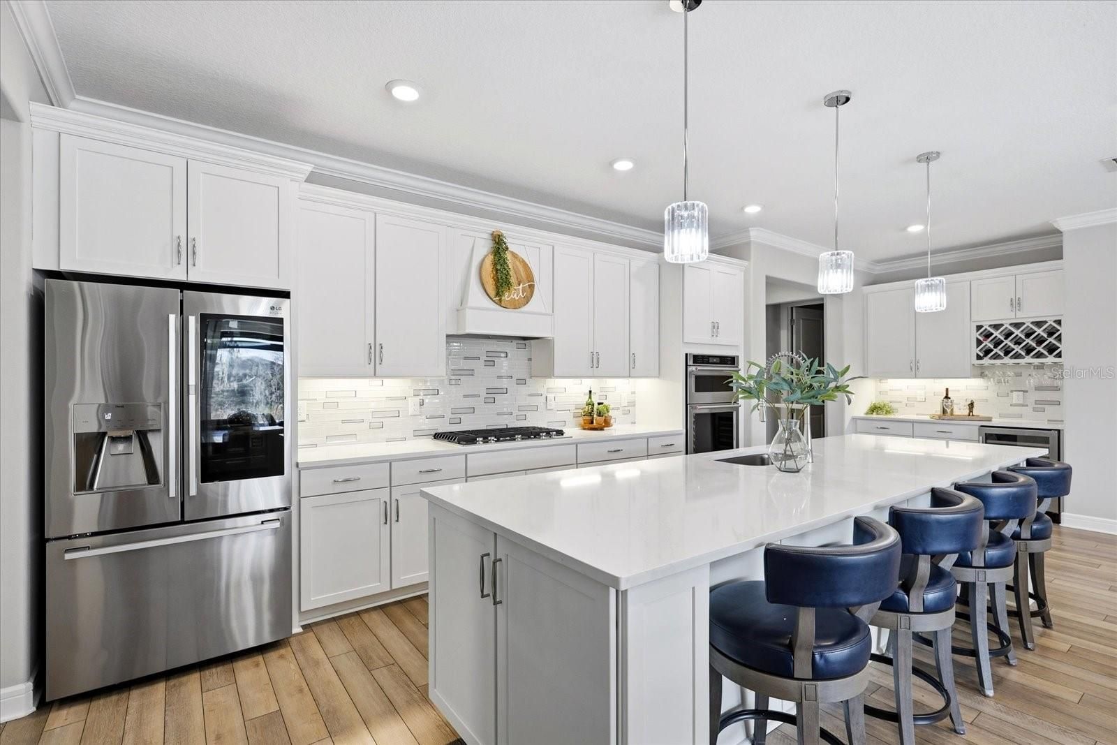 Live the Florida lifestyle in this exceptional Echelon Series home located in the highly sought-after gated Del Webb 55+ community in Land O’ Lakes. Designed for active adult living, this move-in-ready home offers luxury, connection, and resort-style amenities where neighbors become friends and every day brings the option to relax or stay socially engaged. Del Webb Land O’ Lakes features a 19,000+ sq. ft. clubhouse, resort-style pools, a state-of-the-art fitness center with classes, pickleball and tennis courts, a community garden, dog park, over 40 resident clubs and a full calendar of events coordinated by a dedicated Lifestyle Director—creating a true active adult lifestyle community. This beautifully upgraded home offers 2 bedrooms, 2.5 bathrooms, and a den with French doors, offering flexibility for a home office, third bedroom, or private retreat. The open-concept floor plan showcases coffered ceilings, 8-foot doors, custom millwork, crown molding, and designer finishes throughout. The entertainer-inspired kitchen features an oversized quartz island, upgraded appliances, soft-close cabinetry with pullouts, walk-in pantry, and a separate bar area with wine refrigerator—perfect for everyday living and effortless entertaining. The great room flows seamlessly to the outdoors through expansive pocketing sliding glass doors, creating ideal indoor-outdoor living. Step outside to the private lanai and enjoy true Florida living with a heated custom pool featuring a sun shelf, salt system, travertine pavers, cage lighting, and convienent retractable hurricane-ready screen. Overlooking an oversized conservation lot, this peaceful outdoor oasis is perfect for morning coffee, sunset cocktails, or quiet evenings. The luxurious primary suite includes plantation shutters, coffered ceilings, dual vanities, an oversized zero-entry walk-in shower, and a custom-designed walk-in closet, all complemented by serene conservation views that enhance the sense of retreat. Guests will appreciate the private ensuite bedroom featuring an expansive bathroom with walk-in shower and closet, also overlooking conservation views for added privacy and comfort. The massive laundry room is thoughtfully designed with custom built-in cabinetry on both sides, offering exceptional storage, workspace, and organization—making everyday tasks both efficient and elegant. Additional upgrades include a whole-home water softener, tankless water heater, gutters, landscape curbing, and the ease and convenience of installed roll-down hurricane shutters for peace of mind. The extended-depth three-car garage with custom epoxy flooring provides exceptional space for large vehicles, a golf cart, workshop space, or extra storage. Conveniently located near shopping, dining, golf, medical facilities, Tampa International Airport, and Florida’s beaches. Meticulously maintained and extensively upgraded, this move-in-ready Del Webb home reflects exceptional pride of ownership and thoughtful enhancements throughout, you only need to unpack and relax. Del Webb isn’t just a community—it’s a lifestyle. Your next chapter begins here.