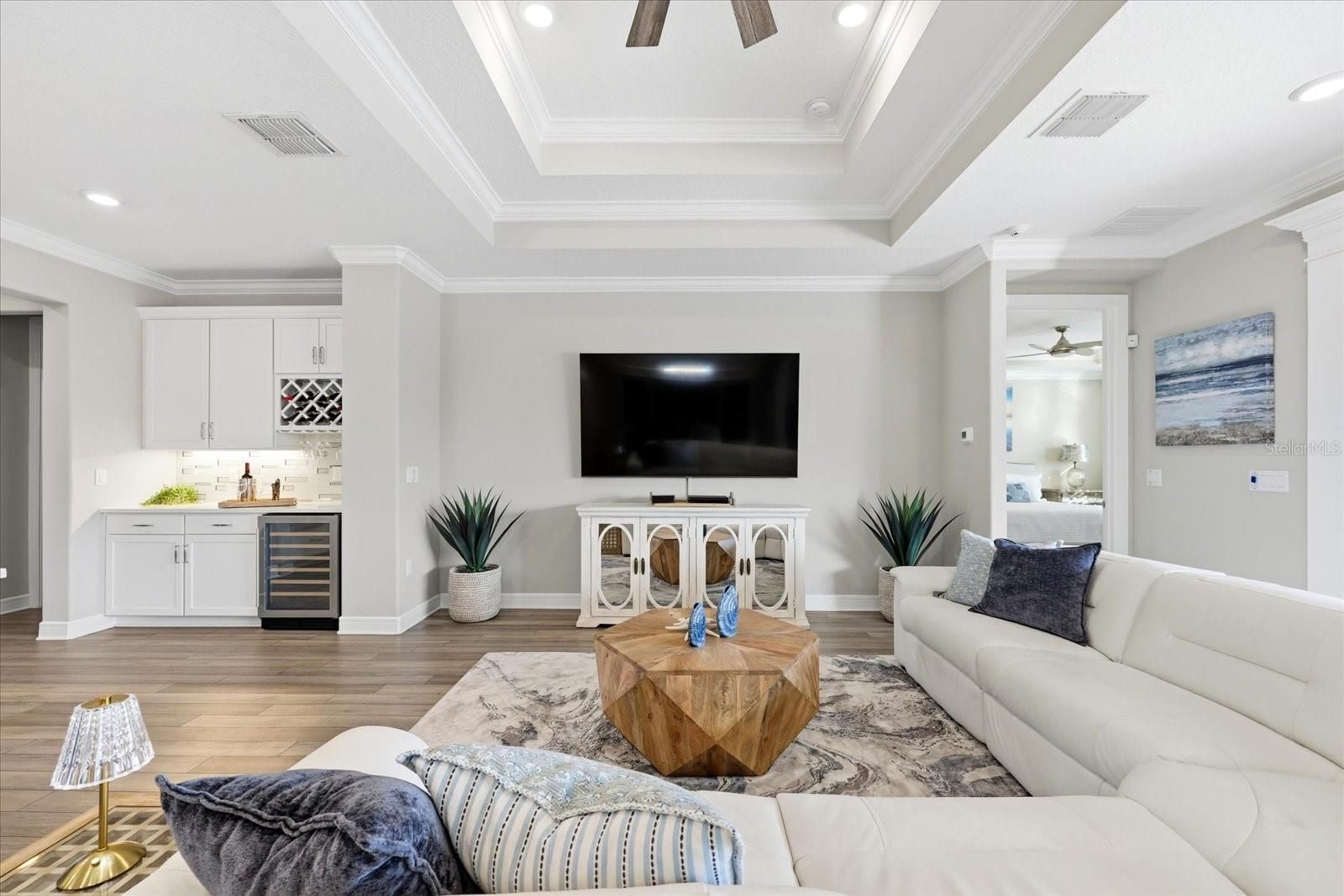 - Ceiling Fan(s), Coffered Ceiling(s), Crown Molding, Dry Bar, High Ceilings, In-Wall Pest Control, Open Floorplan, Main Level Primary, Split Bedrooms, Tray Ceiling(s), Walk-In Closet(s), Window Treatments