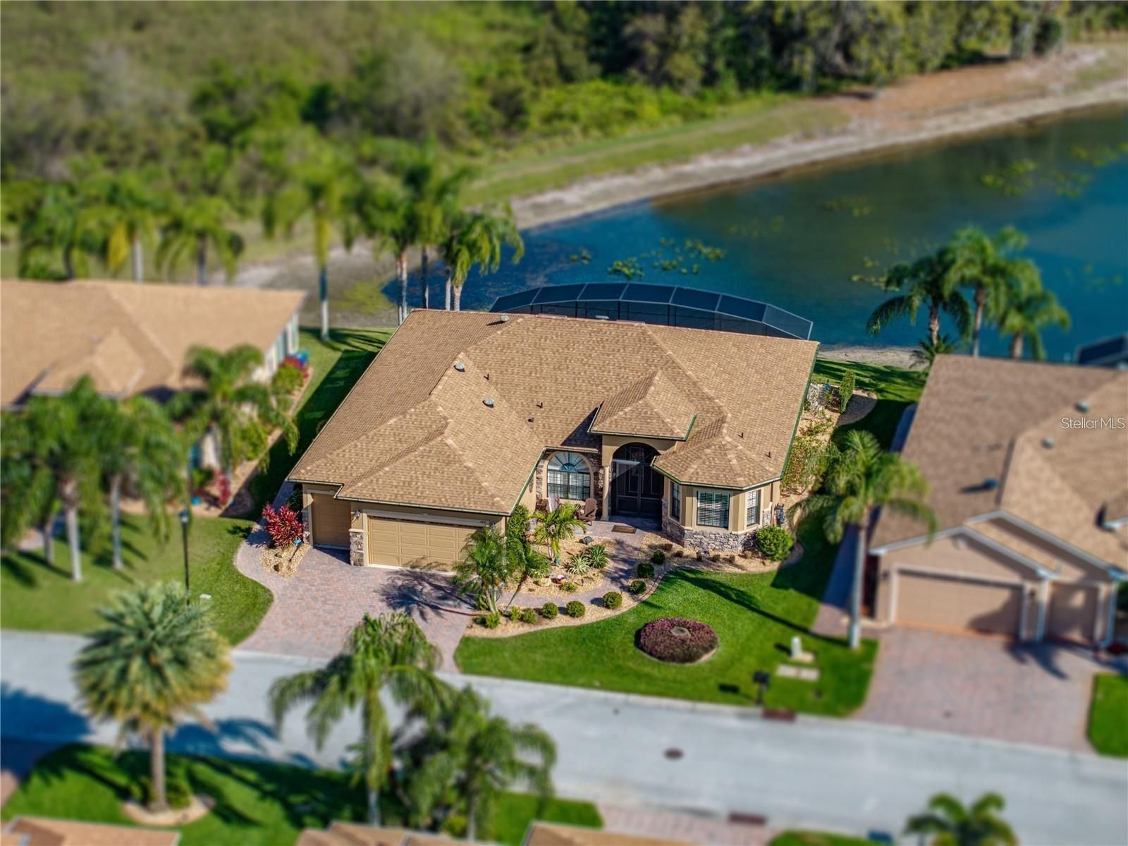One or more photo(s) has been virtually staged. WATERFRONT CUSTOM St. John floor plan with CDD bond debt PAID IN FULL! A true gem in Lake Ashton. Recent Upgrades: Kinetico whole-house water softener, refrigerator (2025), New roof (2024), AC, dishwasher, stove, additional screened room with pavers, and upgraded landscaping (2022). Experience Florida living at its finest in this beautifully upgraded 3-bedroom + den, 2-bath home, complete with an enclosed Florida room and extended screened lanai. From the moment you arrive, you’ll notice the attention to detail: custom stacked stone accents, a power screen on the garage door, golf cart garage entrance, upgraded landscaping, a front paver patio, screened entry, and elegant beveled double glass doors. Inside, round columns frame the dining area, while raised stone archways lead to the kitchen and breakfast nook. The great room features coffered ceilings with recessed lighting, a ceiling fan, and double crown molding that flows throughout the home. The kitchen boasts a bank of drawers, 42" raised-panel custom cabinets with crown molding, stainless steel appliances, a large prep island with extra storage, granite countertops, pendant lighting, and a breakfast bar. Wake up to serene views from your primary bedroom, complete with sliding doors to the lanai. The en-suite bath features two walk-in closets, a walk-in shower, double vanities, a soaking tub, and a linen closet. Enjoy two clubhouses, two 18-hole golf courses, bowling, a movie theatre, craft & card rooms, billiards, pickleball, tennis, bocce, and so much more.