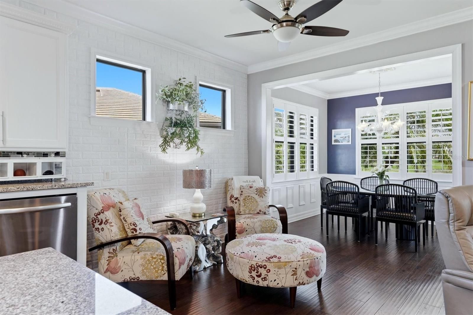 - Ceiling Fan(s), Chair Rail, Crown Molding, In-Wall Pest Control, Kitchen/Family Room Combo, Open Floorplan, Main Level Primary, Solid-Wood Cabinets, Split Bedrooms, Stone Counters, Thermostat, Tray Ceiling(s), Walk-In Closet(s), Window Treatments