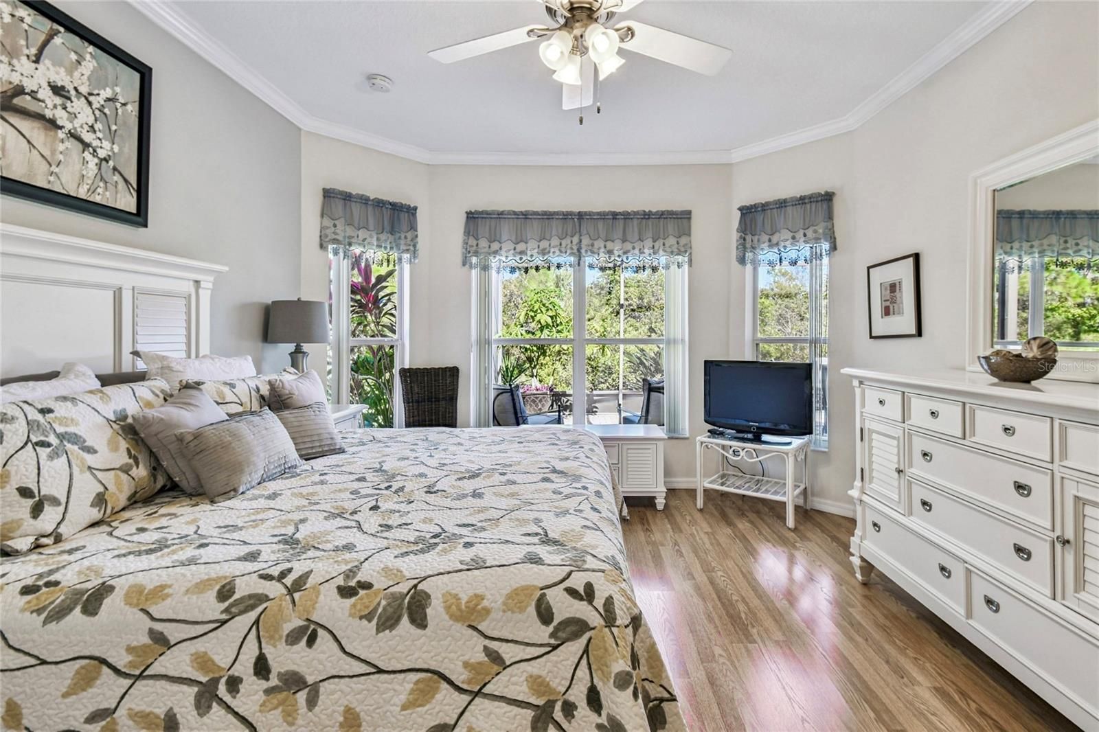 - Ceiling Fan(s), Crown Molding, High Ceilings, Open Floorplan, Solid-Wood Cabinets, Split Bedrooms, Stone Counters, Thermostat, Walk-In Closet(s), Window Treatments
