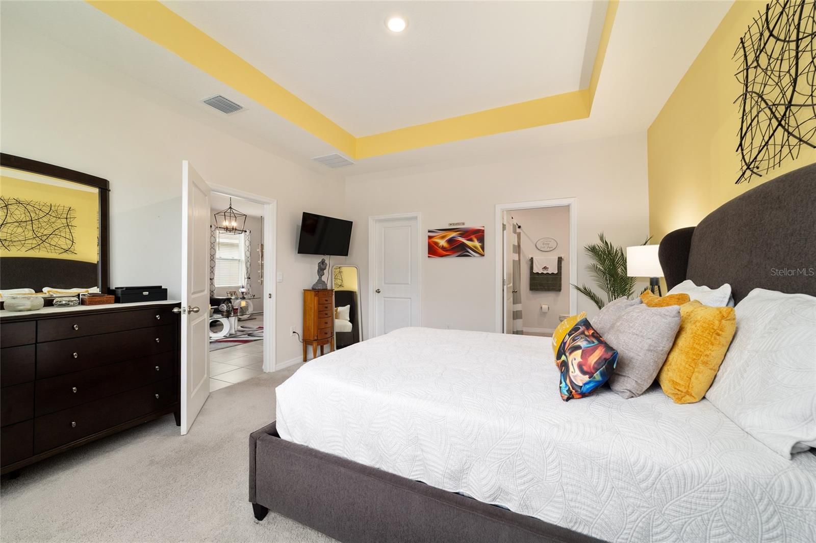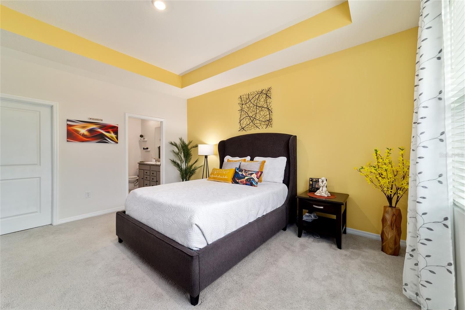 - Eat-in Kitchen, Open Floorplan, Main Level Primary, Smart Home, Solid-Wood Cabinets, Split Bedrooms, Stone Counters, Thermostat, Tray Ceiling(s), Walk-In Closet(s)