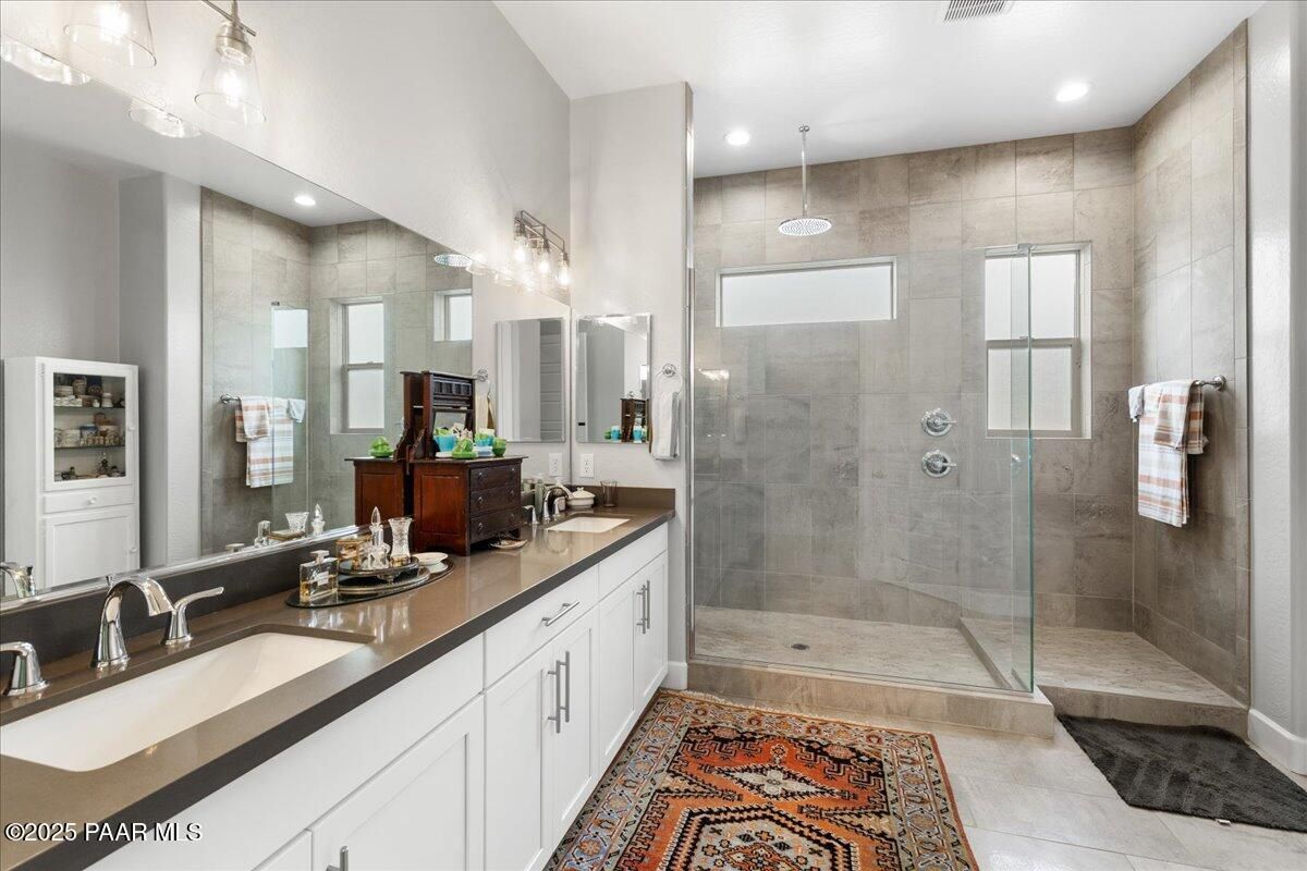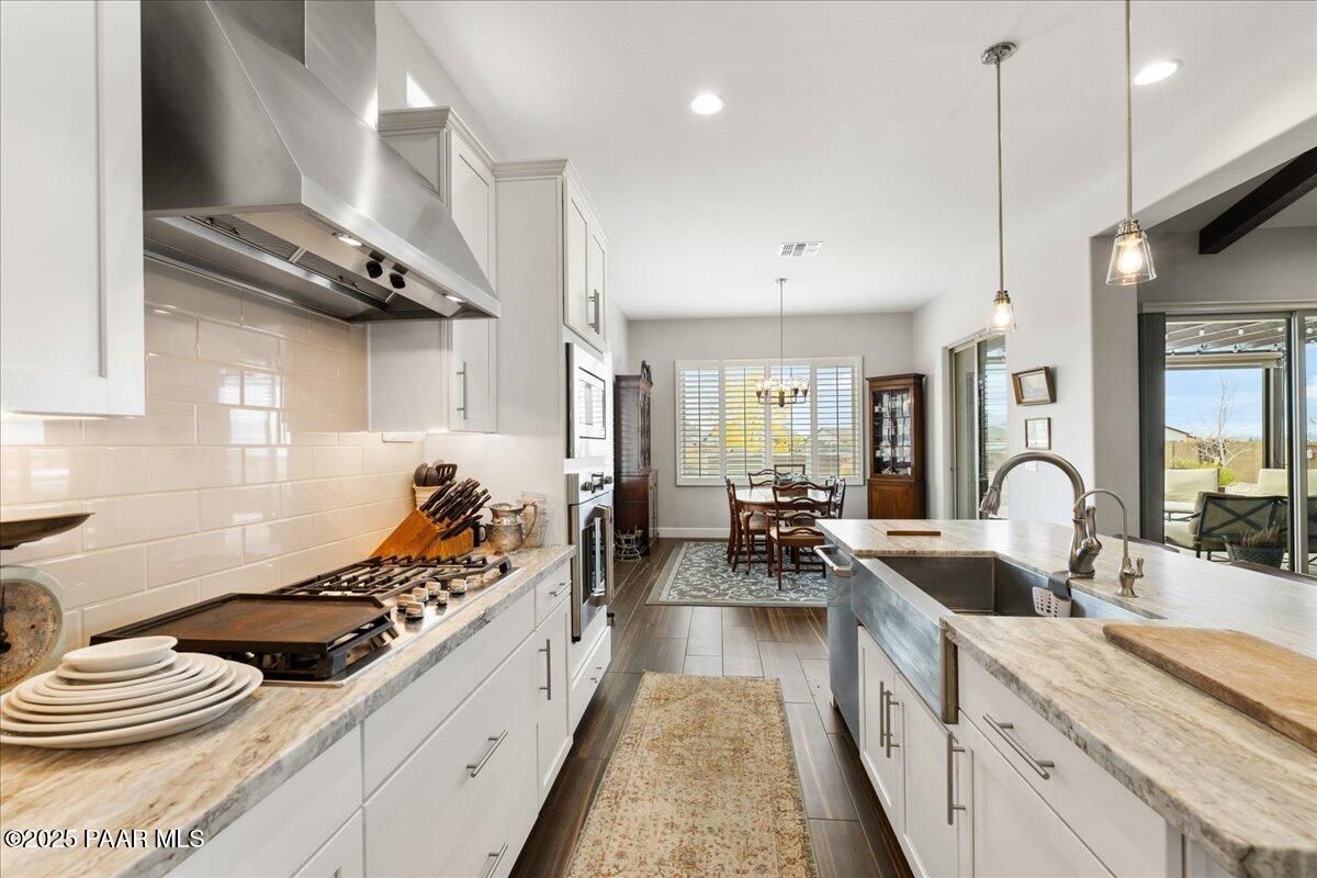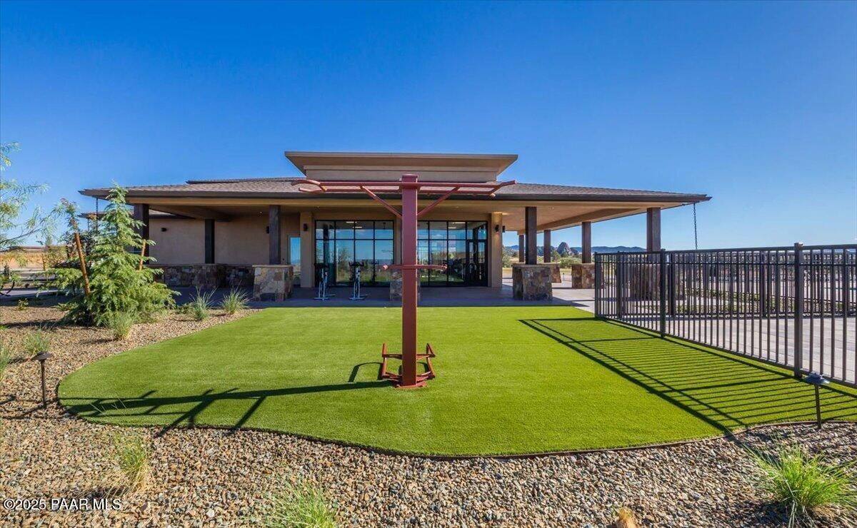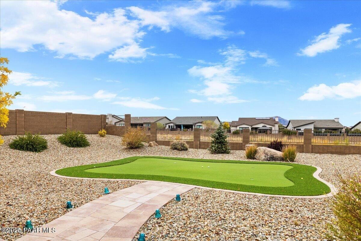 Welcome to this beautiful single-level ranch-style home in the desirable Granite Dells Estates. This thoughtfully designed floor plan offers two primary suites on the main level, along with a flexible den/office or third bedroom. The oversized 3-car garage provides 24-ft. depth and exceptional storage space.Inside, you'll find a spacious great room with a gas fireplace and tile flooring throughout the main living areas, with carpet in the bedrooms for comfort. The gourmet kitchen features high-end Cafe appliances, granite countertops, a farmhouse-style island sink, gas cooktop, tons of cabinetry, and a large walk-in pantry. Refrigerator, washer, and dryer all convey. Ten-foot ceilings and interior shutters enhance the home's quality feel.The backyard is an entertainer's retreat, offering lush landscaping, a putting green, a permanent built-in BBQ, paver patio spaces, and a gazebo over the covered back porch. Enjoy the hot tub--perfect for relaxation after a long day. The concrete tile roof provides durability and potential insurance advantages. Located on a generous lot with scenic views, this home is truly move-in ready.