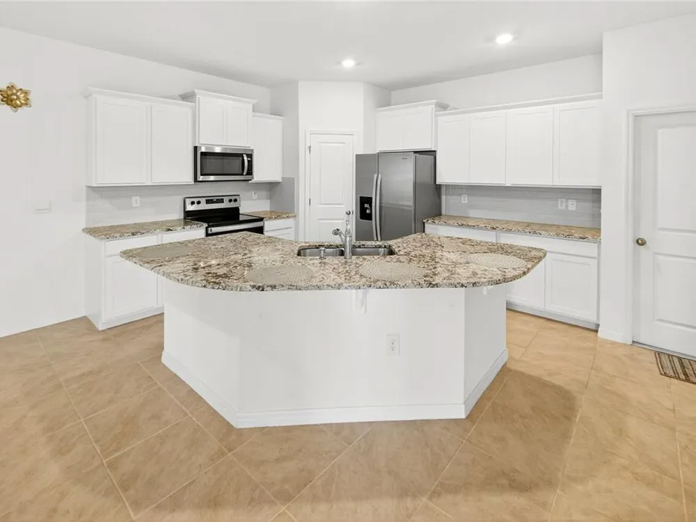 - Ceiling Fan(s), Eat-in Kitchen, High Ceilings, Kitchen/Family Room Combo, Open Floorplan, Main Level Primary, Solid Surface Counters, Solid-Wood Cabinets, Thermostat, Tray Ceiling(s), Walk-In Closet(s)