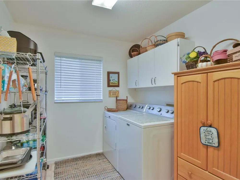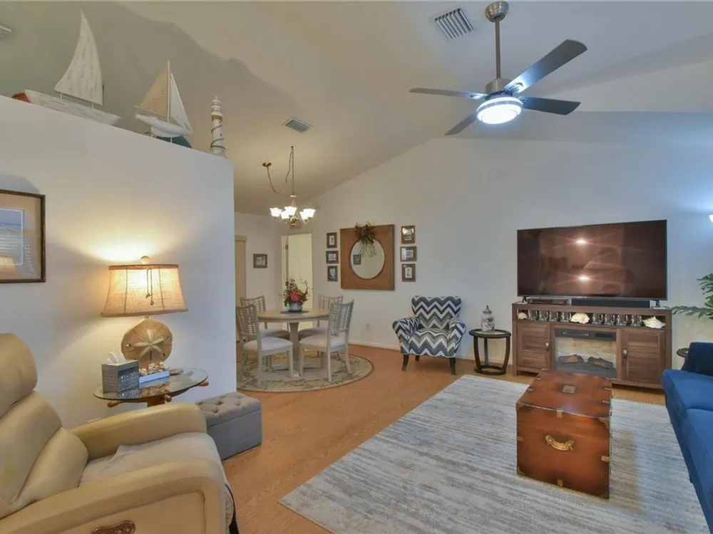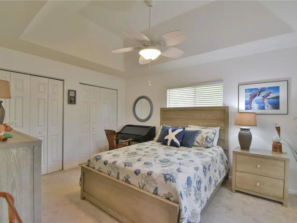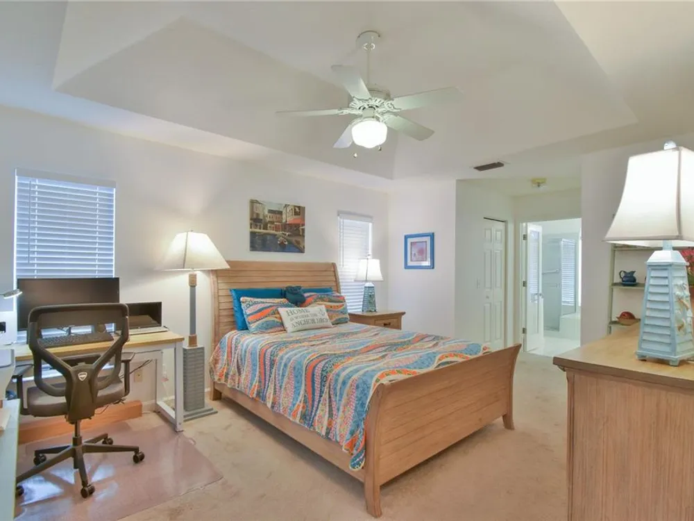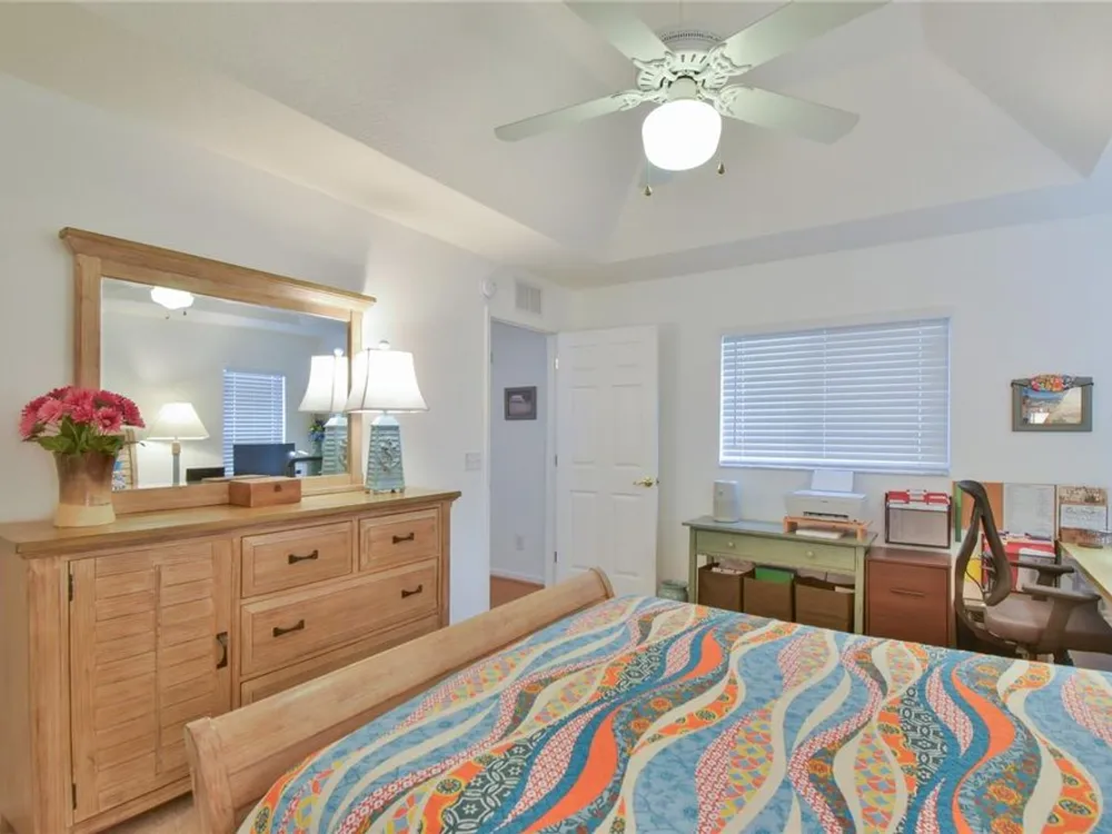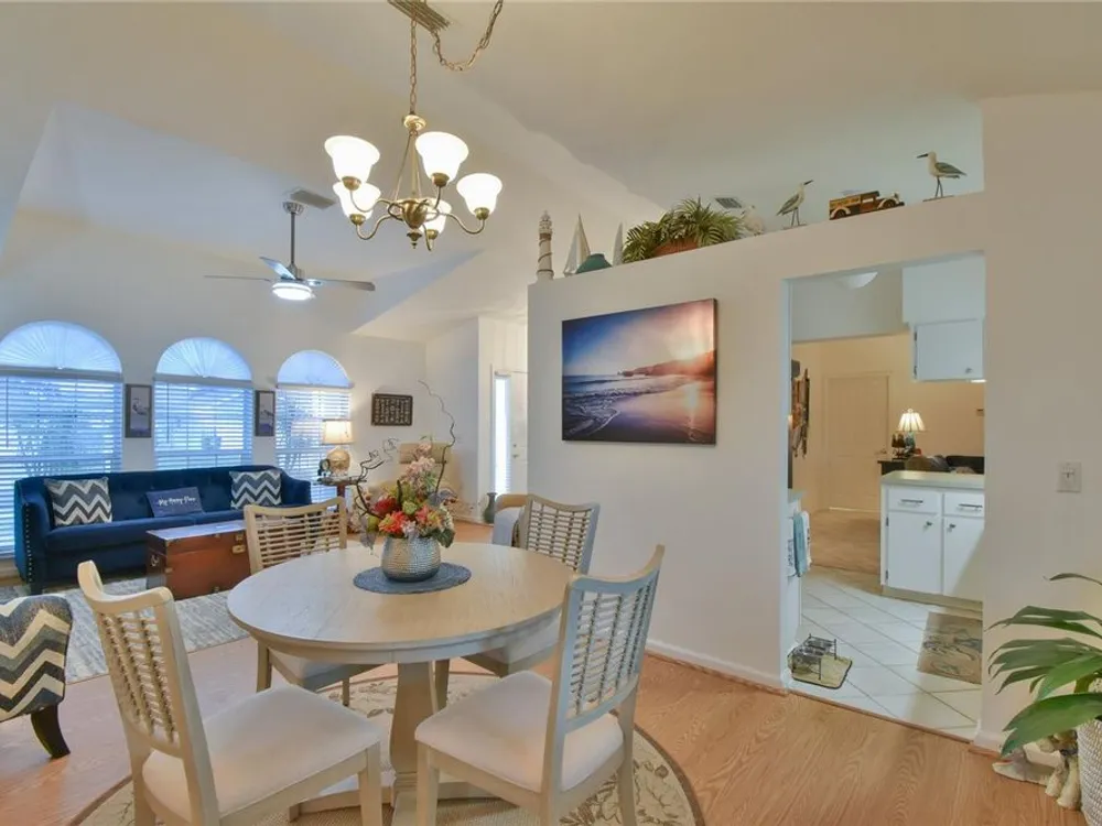 - Ceiling Fan(s), L-Shaped Dining Room, Main Level Primary, Split Bedrooms, Tray Ceiling(s)