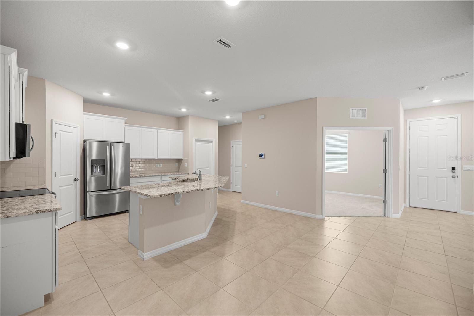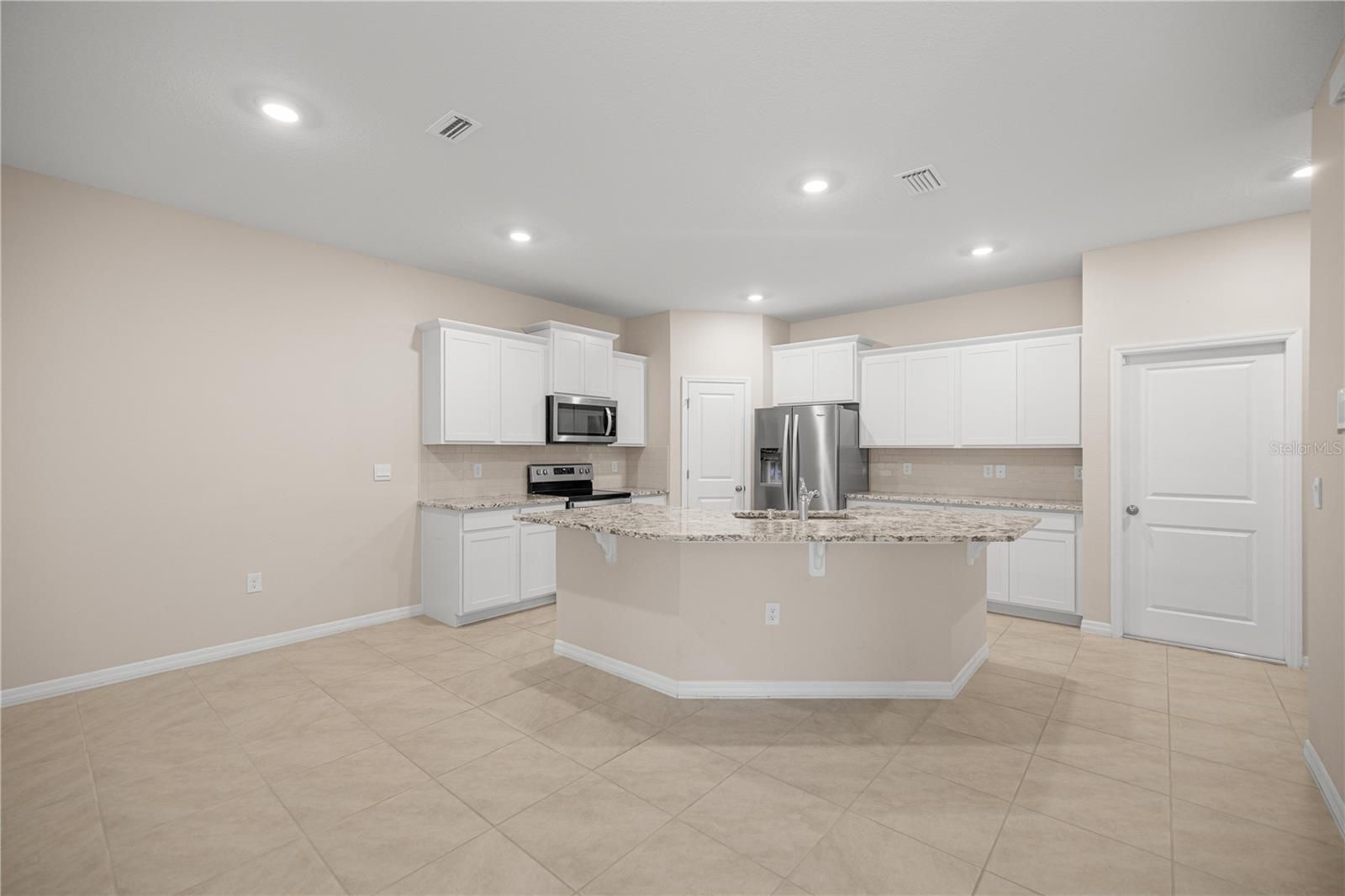 One or more photos have been virtually staged. Nestled on a premium lot with no rear neighbors, this beautifully maintained 2023 Siesta model backs directly onto one of Ocala Preserve’s peaceful walking trails, offering rare privacy in the community’s highly sought-after all-ages section. This 3-bedroom, 2-bath home features a thoughtful layout designed for both comfort and functionality. The kitchen shines with stainless steel appliances, granite countertops, a subway tile backsplash, staggered cabinetry with crown molding, a large island, a spacious walk-in pantry, tile flooring, and a solar tube that fills the space with natural light. The open living and dining area flows seamlessly to a screened lanai through a 3-panel sliding glass door, leading to an extended 10x12 paver patio overlooking a private backyard and scenic walking trail. The split floor plan provides added privacy with a spacious primary suite featuring a tray ceiling, walk-in closet, and an ensuite bath with a glass-enclosed tiled shower and double vanity with granite countertops, while two additional bedrooms offer flexibility for guests, a home office, or hobby space. Additional highlights include a laundry closet with Whirlpool washer and dryer, a 2-car garage, and updated rock landscaping that enhances the home’s curb appeal. Located in the gated community of Ocala Preserve, residents enjoy resort-style amenities including dining, a fitness center, and scenic walking trails, all just minutes from shopping, restaurants, and medical facilities.