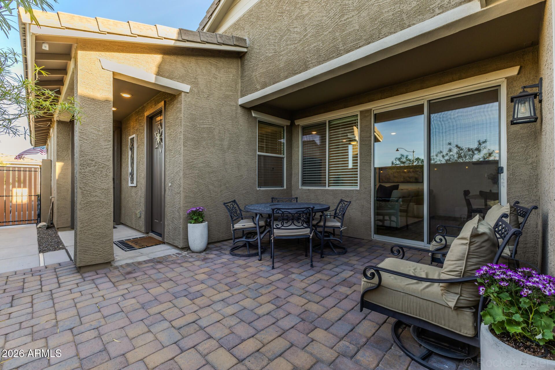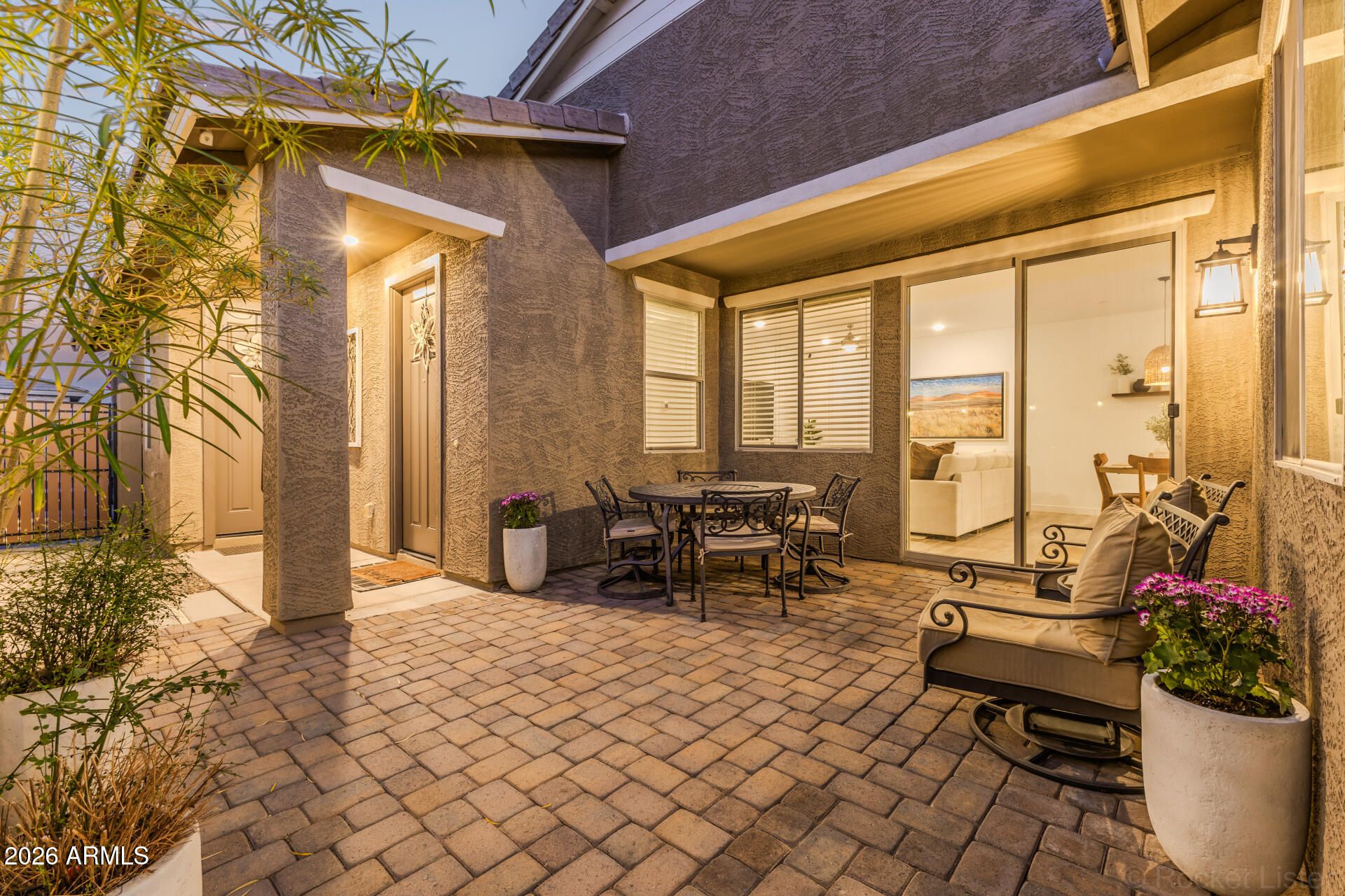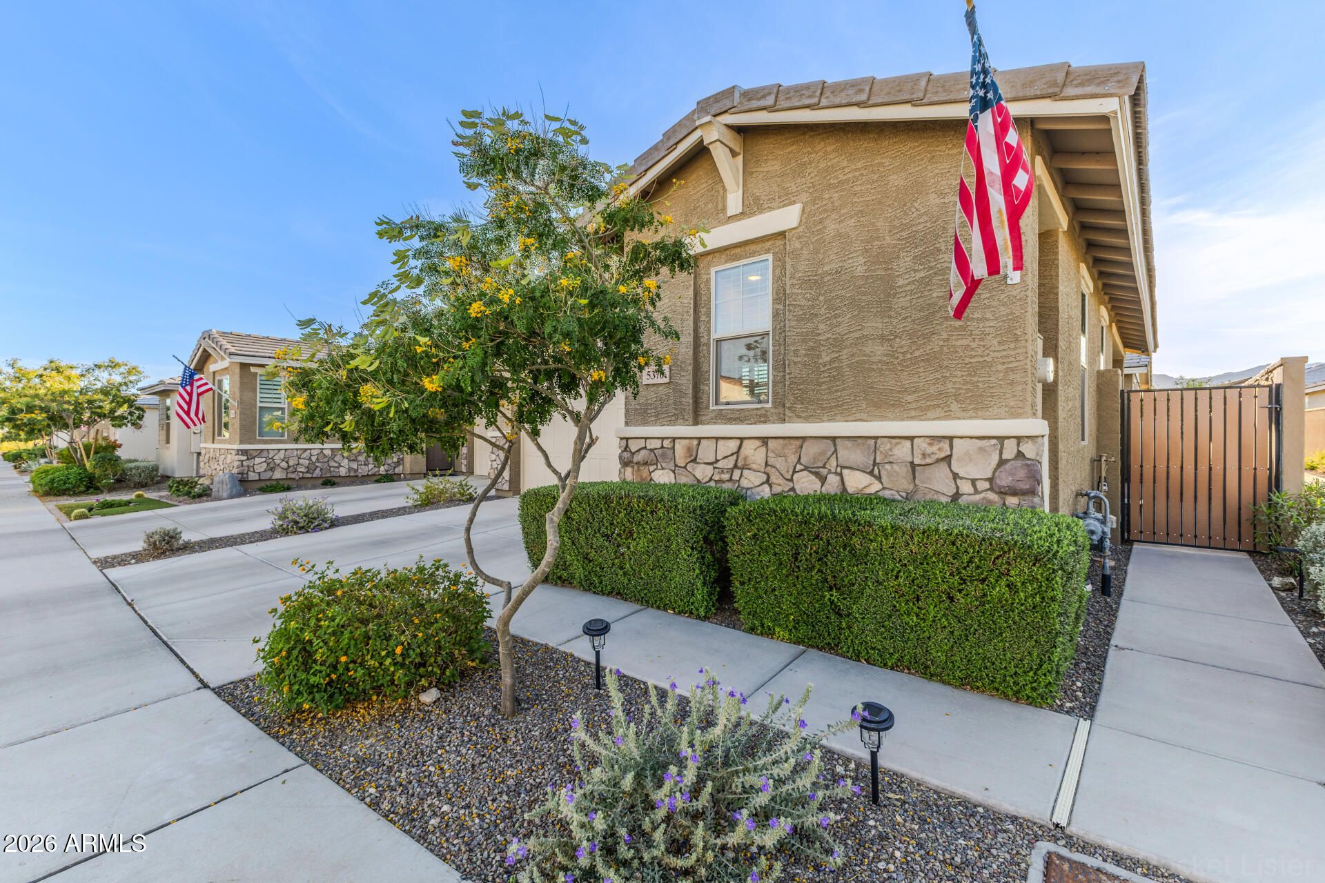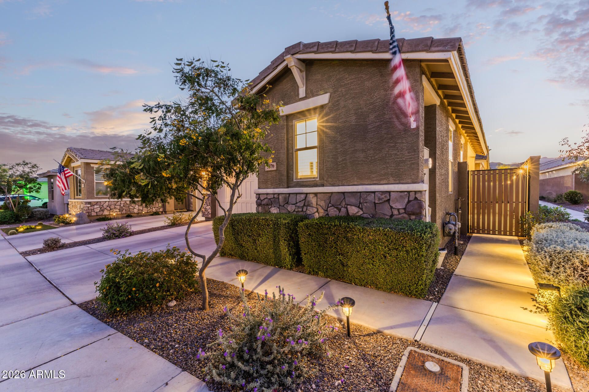 Welcome to Victory at Verrado! Built in 2022, this beautifully maintained 2 bed, 2.5 bath duplex offers a rare combination of privacy, flexibility, and low-maintenance living. Ideally positioned adjacent to TWO open green spaces, this premium lot provides added separation, natural light, and peaceful views rarely found in this section of the community. The open-concept floorplan features granite countertops, chevron backsplash, and included appliances, along with a unique private guest suite with its own entrance--perfect for visitors, a home office, or flexible use. Enjoy Arizona sunsets from the finished patio and gated courtyard. Furnishings available on separate bill of sale, creating a true turn-key, lock-and-leave opportunity in this resort-style 55+ community.