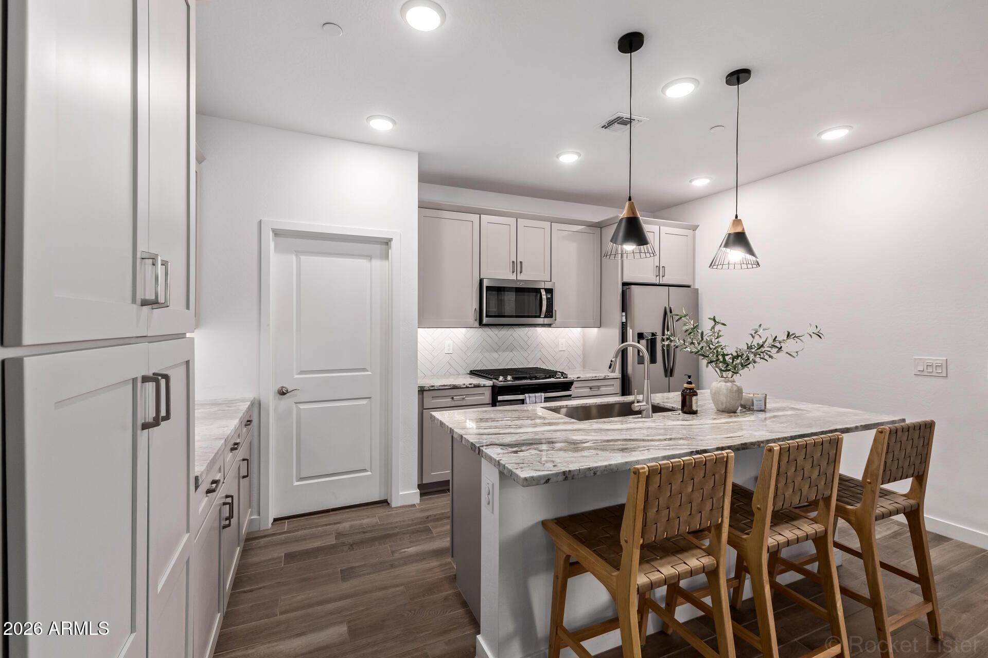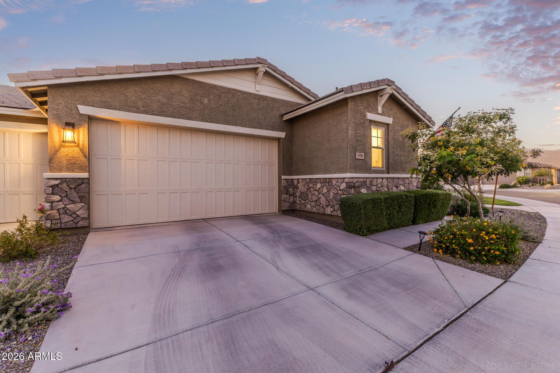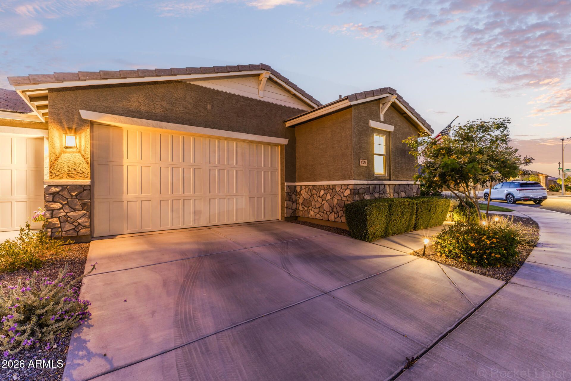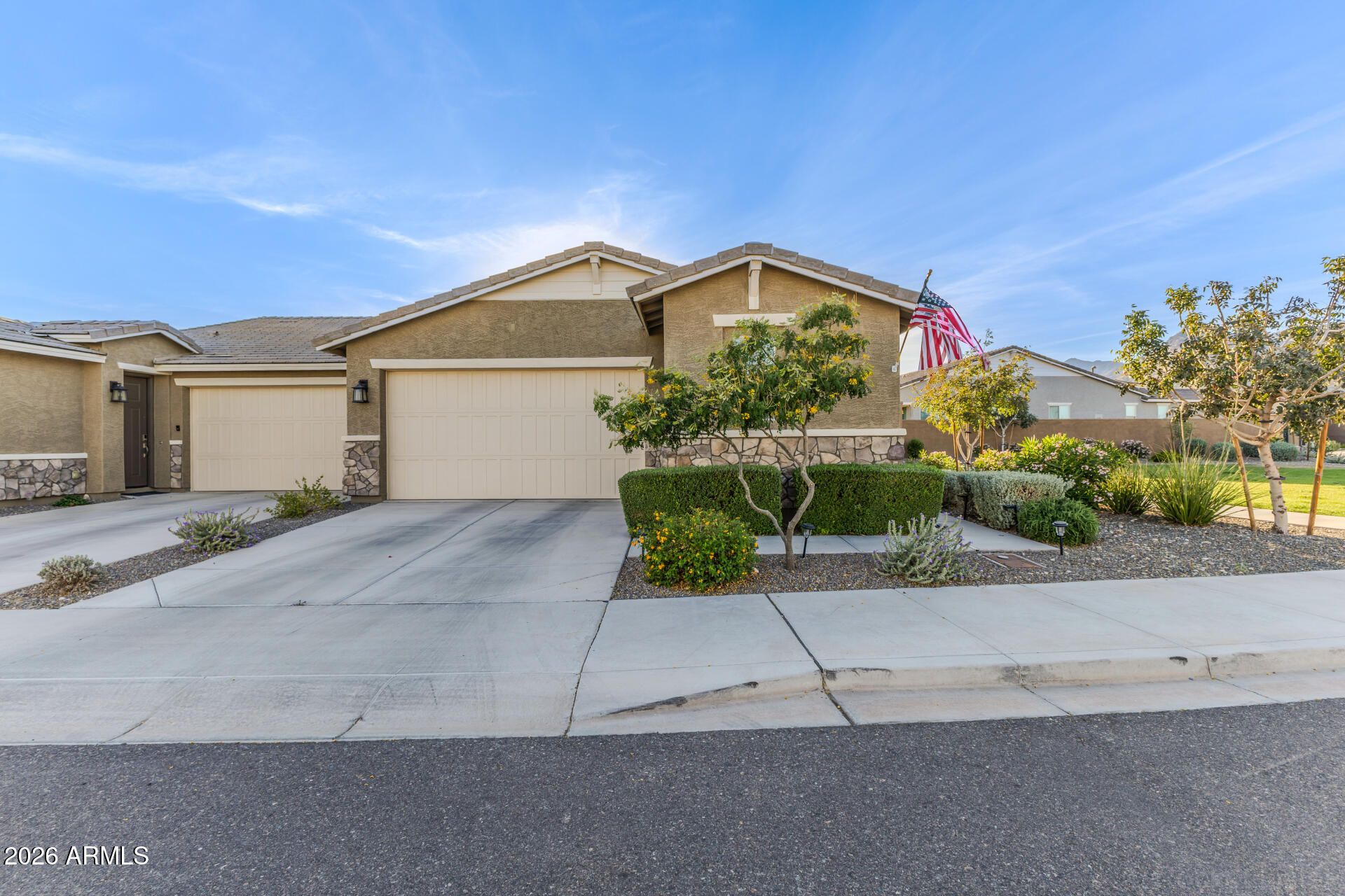 Welcome to Victory at Verrado! Built in 2022, this beautifully maintained 2 bed, 2.5 bath duplex offers a rare combination of privacy, flexibility, and low-maintenance living. Ideally positioned adjacent to TWO open green spaces, this premium lot provides added separation, natural light, and peaceful views rarely found in this section of the community. The open-concept floorplan features granite countertops, chevron backsplash, and included appliances, along with a unique private guest suite with its own entrance--perfect for visitors, a home office, or flexible use. Enjoy Arizona sunsets from the finished patio and gated courtyard. Furnishings available on separate bill of sale, creating a true turn-key, lock-and-leave opportunity in this resort-style 55+ community.