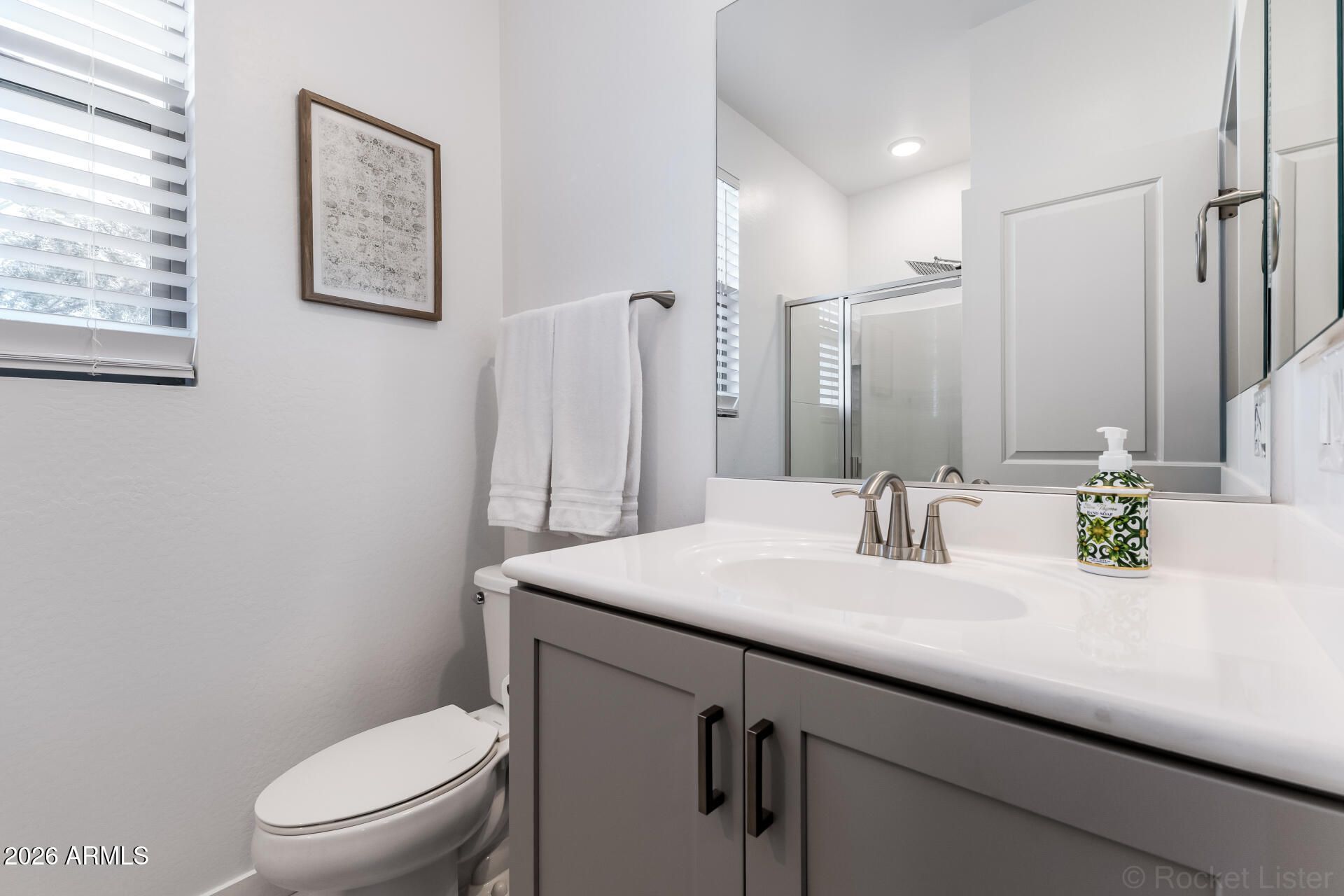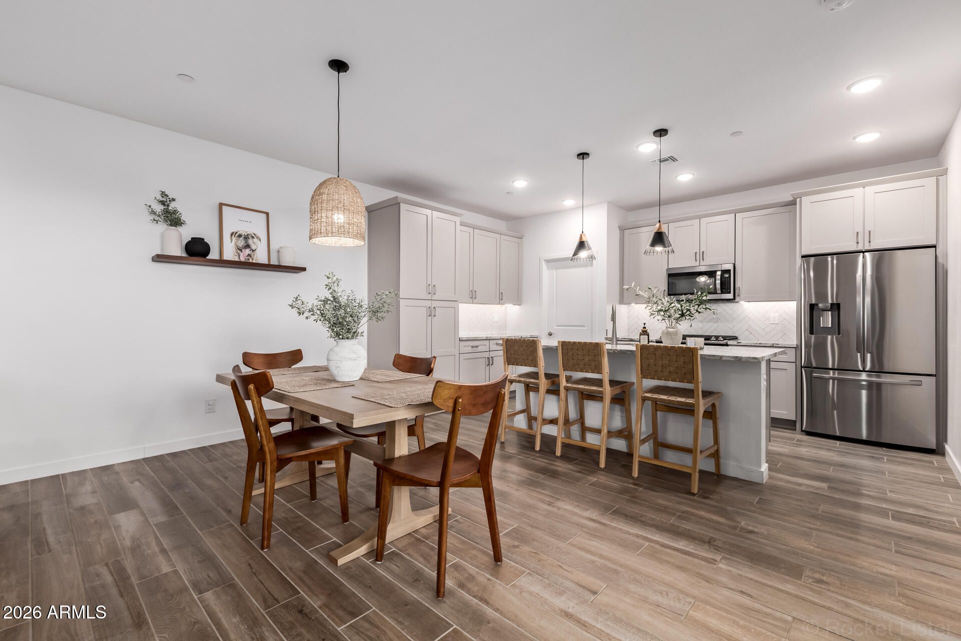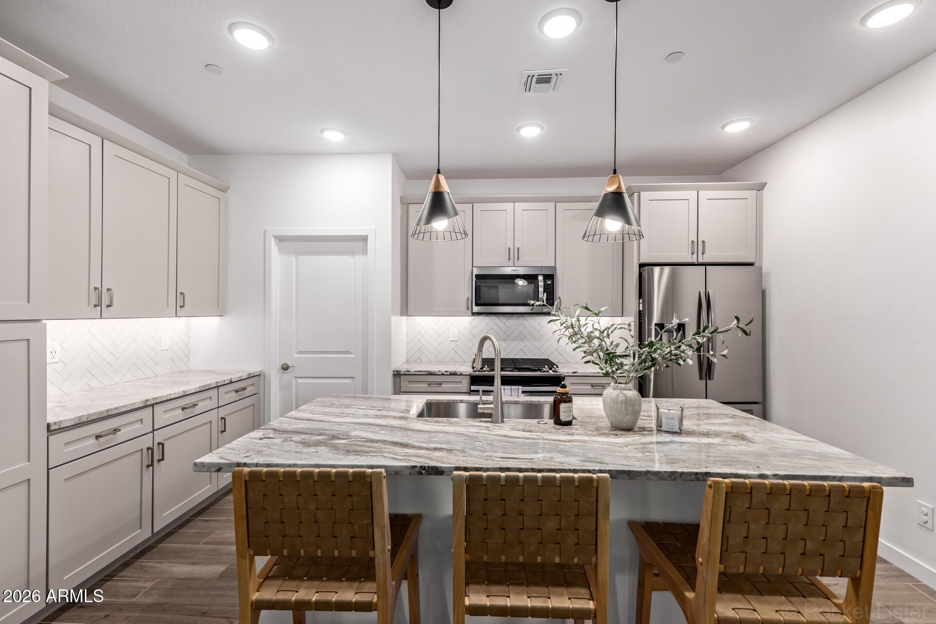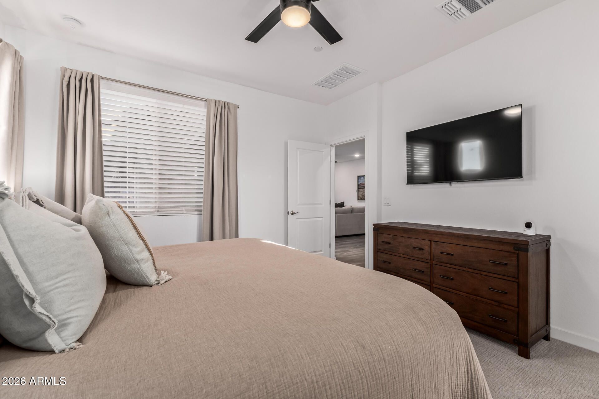 Welcome to Victory at Verrado! Built in 2022, this beautifully maintained 2 bed, 2.5 bath duplex offers a rare combination of privacy, flexibility, and low-maintenance living. Ideally positioned adjacent to TWO open green spaces, this premium lot provides added separation, natural light, and peaceful views rarely found in this section of the community. The open-concept floorplan features granite countertops, chevron backsplash, and included appliances, along with a unique private guest suite with its own entrance--perfect for visitors, a home office, or flexible use. Enjoy Arizona sunsets from the finished patio and gated courtyard. Furnishings available on separate bill of sale, creating a true turn-key, lock-and-leave opportunity in this resort-style 55+ community.