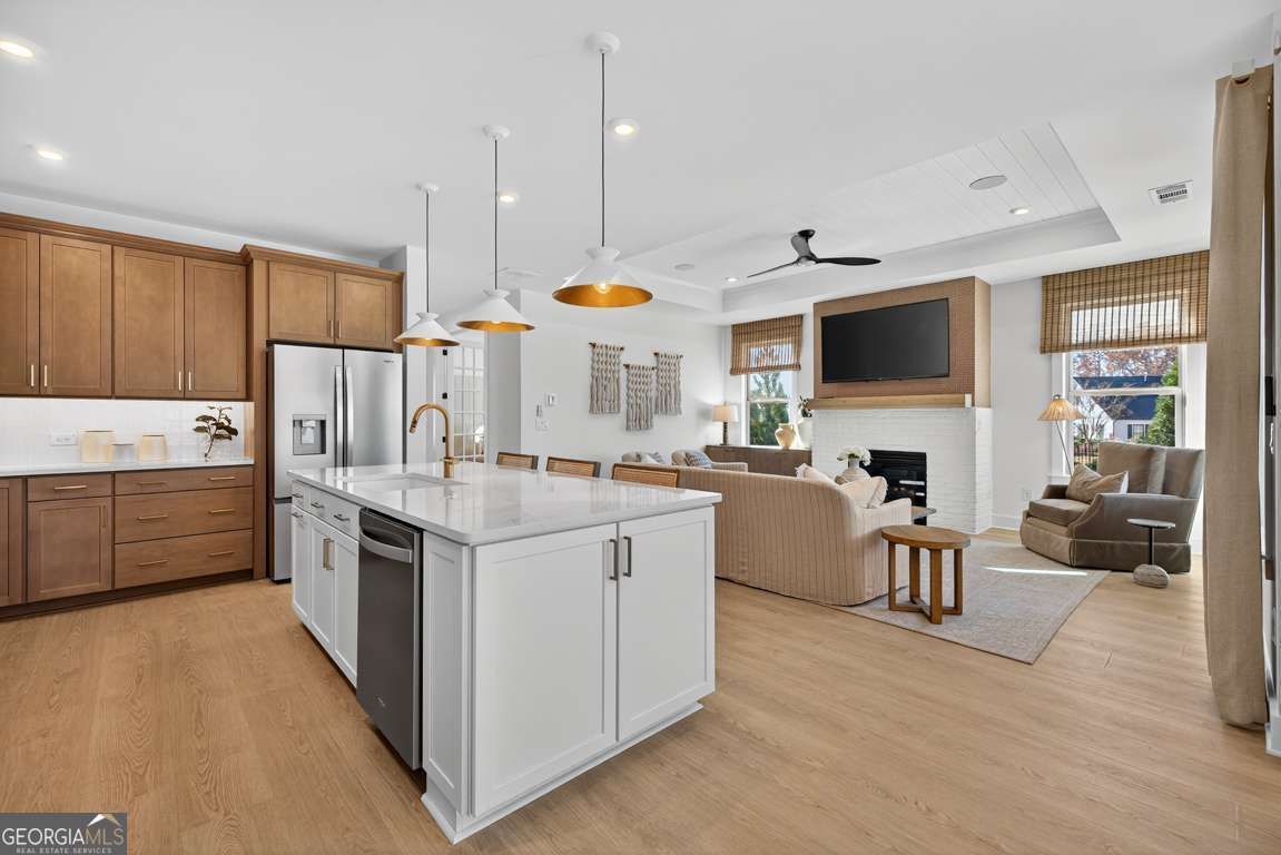 Entertainer's dream! This mystique features oversized gathering room where you can entertain your guests by the fireplace. Grand space with designer details like tray ceiling and crown molding. This beautifully designed residence offers a gourmet kitchen, an expansive island perfect for meal prep or hosting, 42" wood stained upper cabinets with soft-close features, double roll-out trays, and premium KitchenAid appliances. The luxurious primary suite features dual vanities, and a spacious walk-in closet. Relax and unwind on your oversized wrap-around porch-ideal for quiet morning coffee or evening gatherings with new and old friends. This home blends comfort, style, and exceptional livability in every detail. Extra Large Garage: Garage with popular extra deep 10' x 15.5' for extra storage and your golf cart! BONUS: Yard maintenance included in the HOA!! Your new home is located in a Lifestyle, resort style, community! This home will be ready in March 2026! **Photos are of model representation**