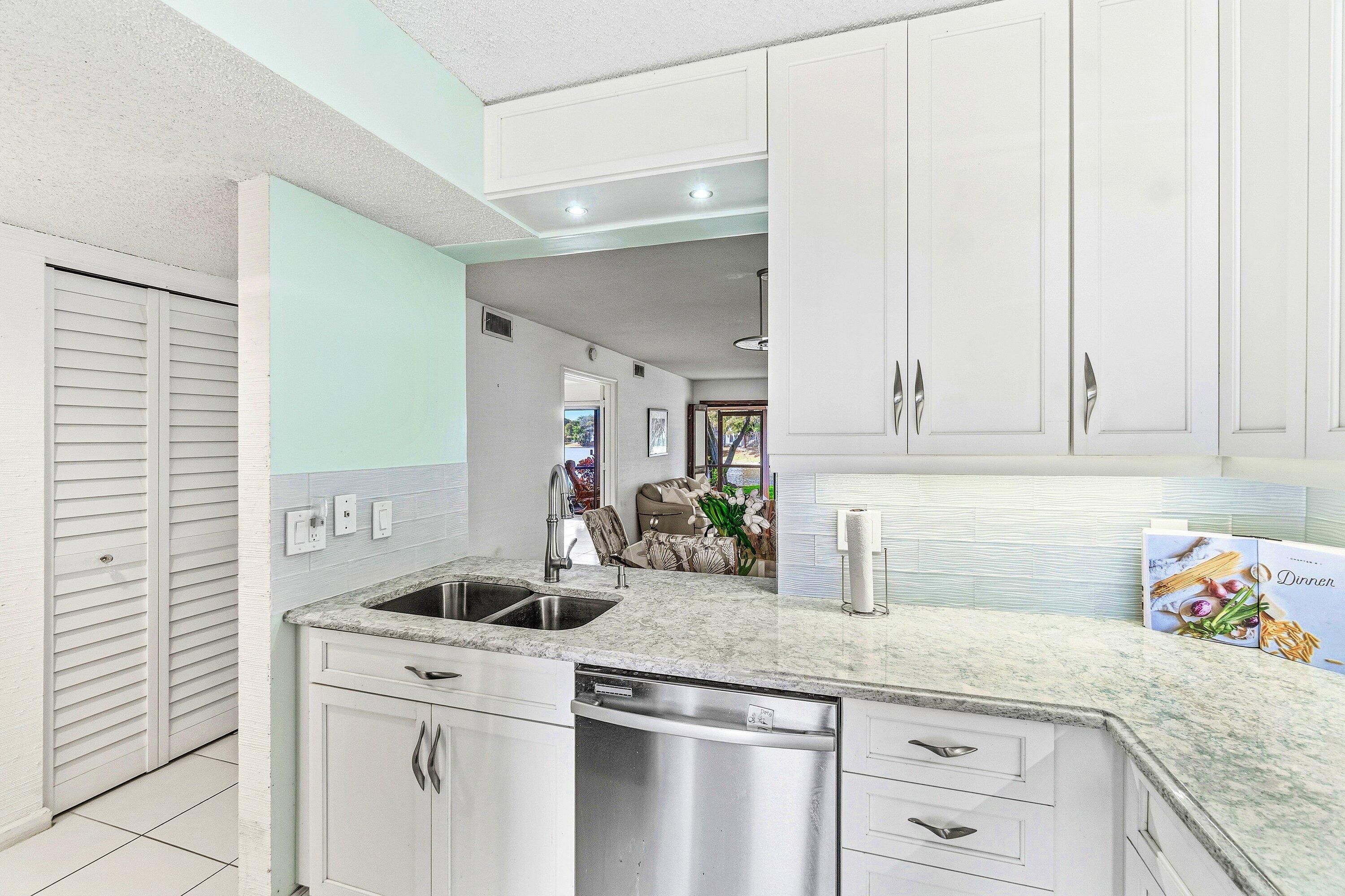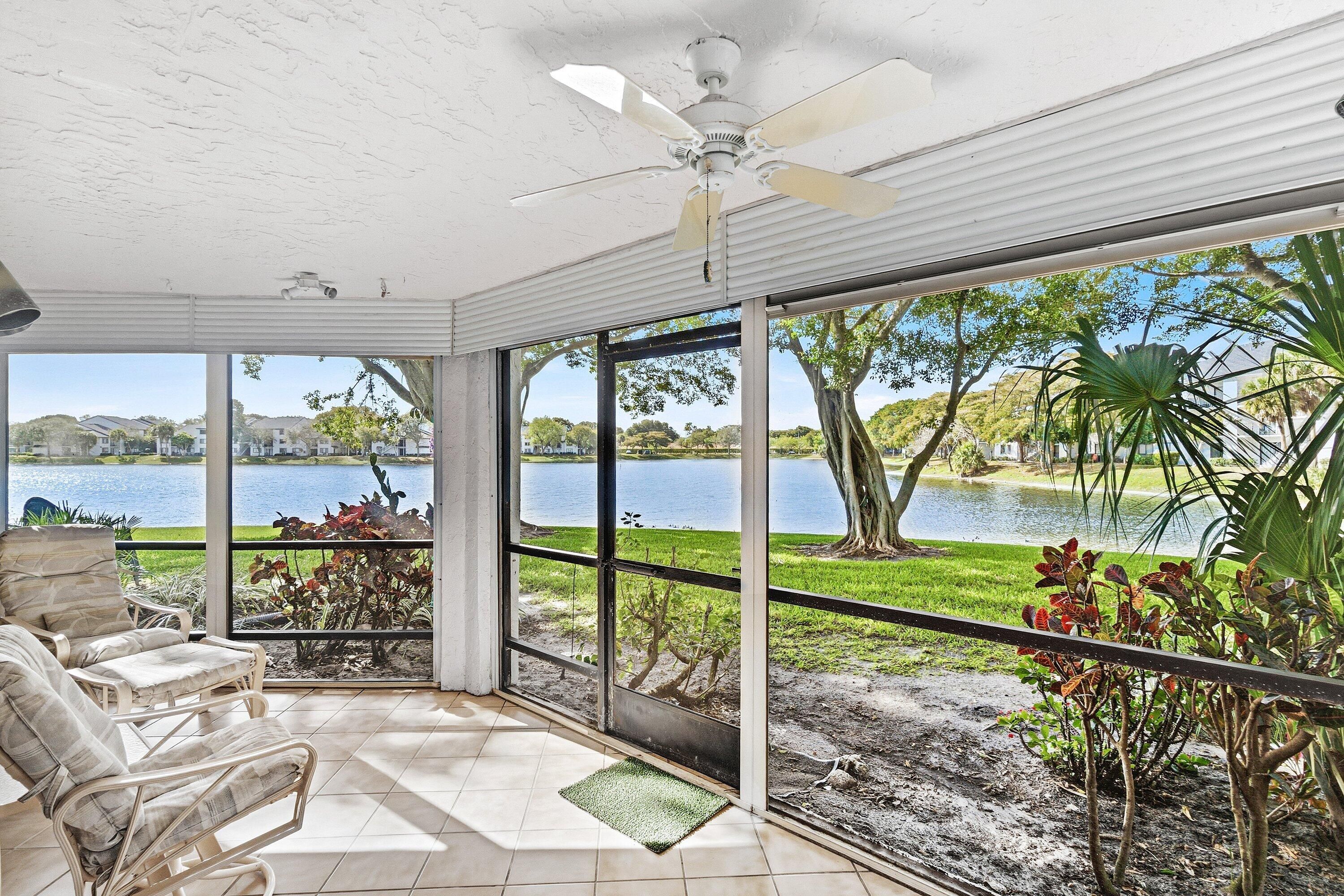 This 2/2 condo is located on a big beautiful lake with mature banyan trees, ducks, turtles & tropical birds! Banyan Springs is a very active gated community w/ 2 resort pools & spas, show hall for shows parties & dances, cafe bistro, pickleball & tennis, billiards. The kitchen has been updated with granite countertops, white shaker cabinets & s/s appliances. The primary bedroom features double door entry and has sliding glass doors that lead out to the screened lanai. The second bedroom Has an ensuite bathroom & a walk in closet. Relax on the screened lanai in the cool breezes or open the the front door & sliding glass doors to enjoy an amazing cross breeze! Steps to the main clubhouse to meet friends for lunch or steps to the cabana pool for a quiet relaxing day catching rays!