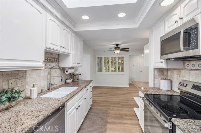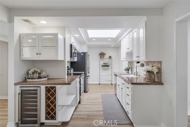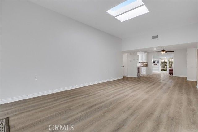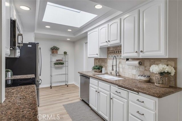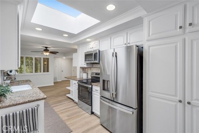 Beautifully remodeled Casa Rosa treasure in Laguna Woods. Enjoy the lush green landscape and natural solace of this perfectly located home in a very quiet and serene setting. Five skylights and three large sliding patio doors allow the natural light to flow throughout this home making it very bright and airy. Fresh paint and newly installed luxury vinyl plank flooring throughout. New appliances with a transferable 5 year warranty. Beautifully landscaped entry with mature vegetation and colorful pathway greet guests upon their arrival. Private front patio to enjoy your morning coffee or read a book. Two master suites with full baths! Shutters in one bedroom, the office/den and dining area provide privacy when desired. Direct access single-car garage with new epoxy floor and finished walls! Covered patios in front and rear are ideal for entertaining or just relaxing with family or friends. Guarded gate entrance to community. Over 200 hobby and social clubs to enjoy and meet new friends.