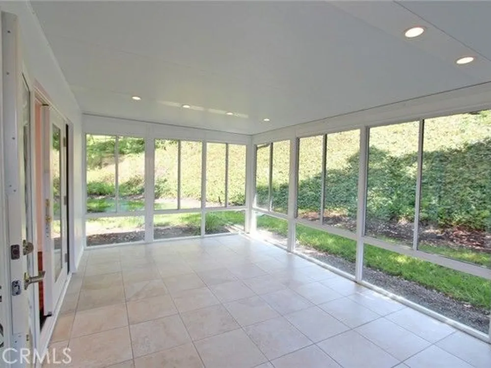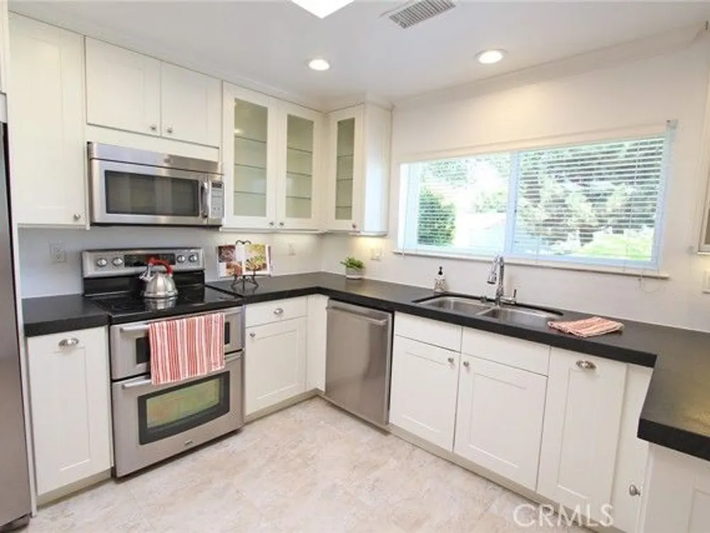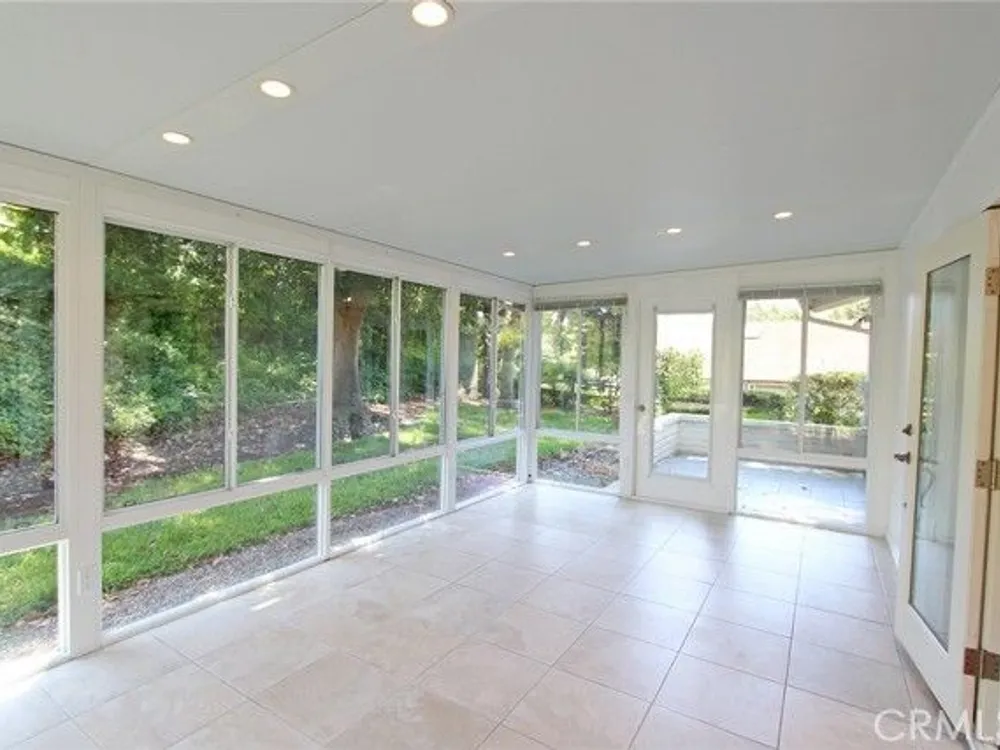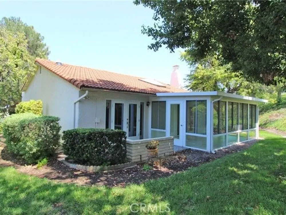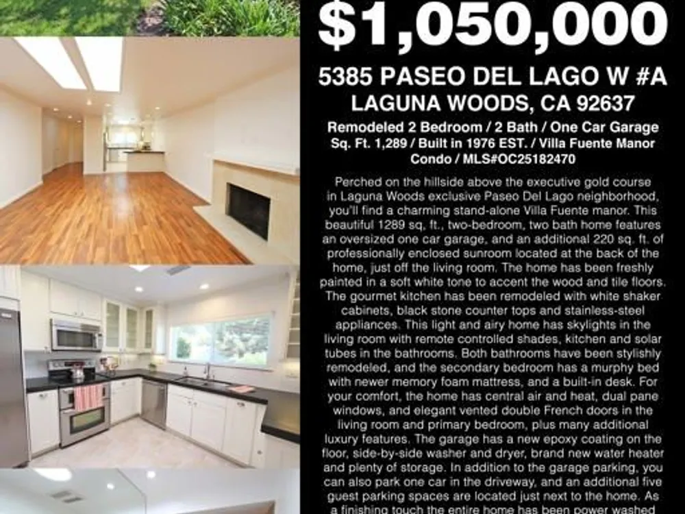 Perched on the hillside above the executive gold course in Laguna Woods exclusive Paseo Del Lago neighborhood, you’ll find a charming stand-alone Villa Fuente manor. This beautiful 1289 sq, ft., two-bedroom, two bath home features an oversized one car garage, and an additional 220 sq. ft. of professionally enclosed sunroom located at the back of the home, just off the living room. The home has been freshly painted in a soft white tone to accent the wood and tile floors. The gourmet kitchen has been remodeled with white shaker cabinets, black stone counter tops and stainless-steel appliances. This light and airy home has skylights in the living room with remote controlled shades, kitchen and solar tubes in the bathrooms. Both bathrooms have been stylishly remodeled, and the secondary bedroom has a murphy bed with newer memory foam mattress, and a built-in desk. For your comfort, the home has central air and heat, dual pane windows, and elegant vented double French doors in the living room and primary bedroom, plus many additional luxury features. The garage has a new epoxy coating on the floor, side-by-side washer and dryer, brand new water heater and plenty of storage. In addition to the garage parking, you can also park one car in the driveway, and an additional five guest parking spaces are located just next to the home. As a finishing touch the entire home has been power washed till it sparkles. As one of only five stand-alone Ville Fuente manors in the village, this home is sure to sell quickly!