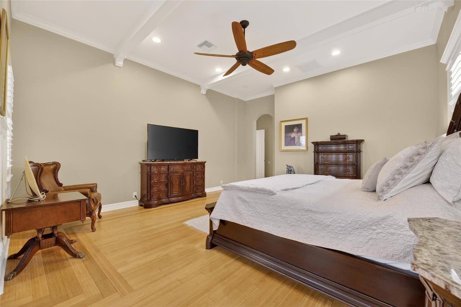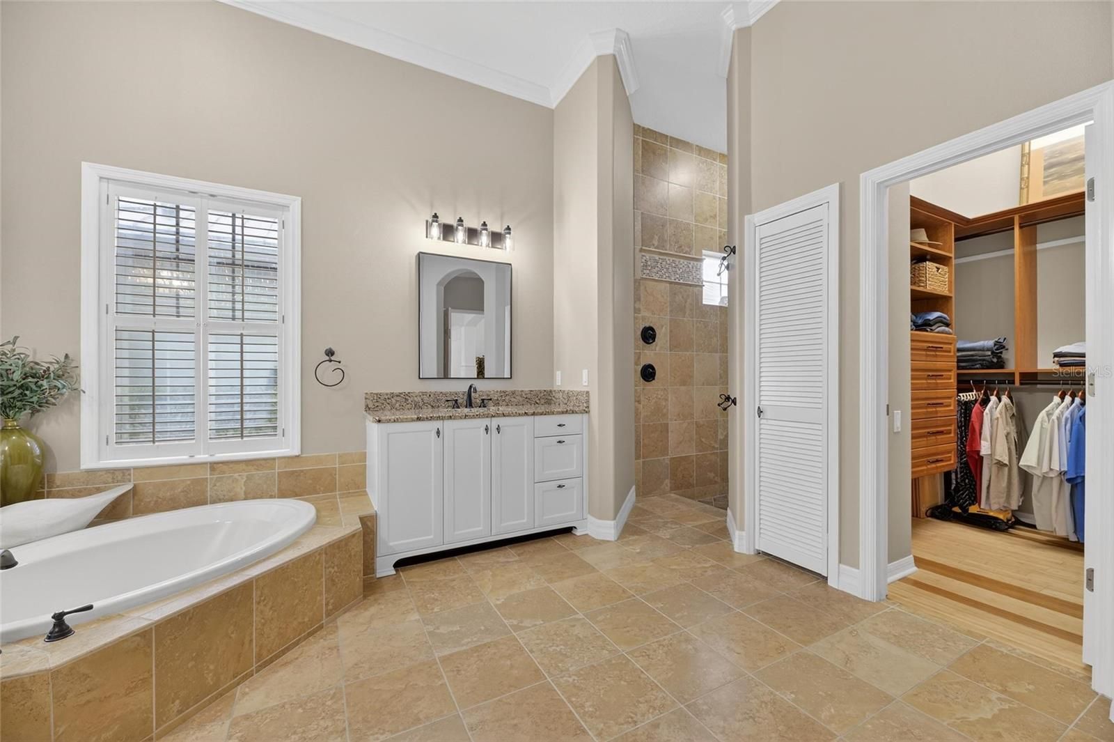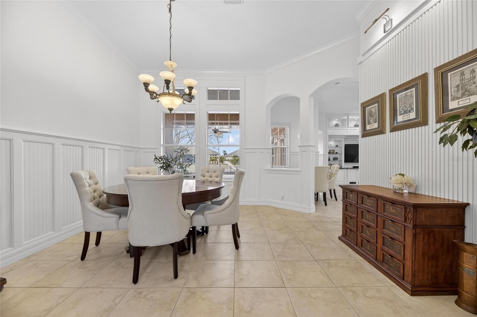 - Ceiling Fan(s), Crown Molding, Eat-in Kitchen, High Ceilings, Kitchen/Family Room Combo, L-Shaped Dining Room, Open Floorplan, Solid-Wood Cabinets, Split Bedrooms, Stone Counters, Thermostat, Walk-In Closet(s), Window Treatments