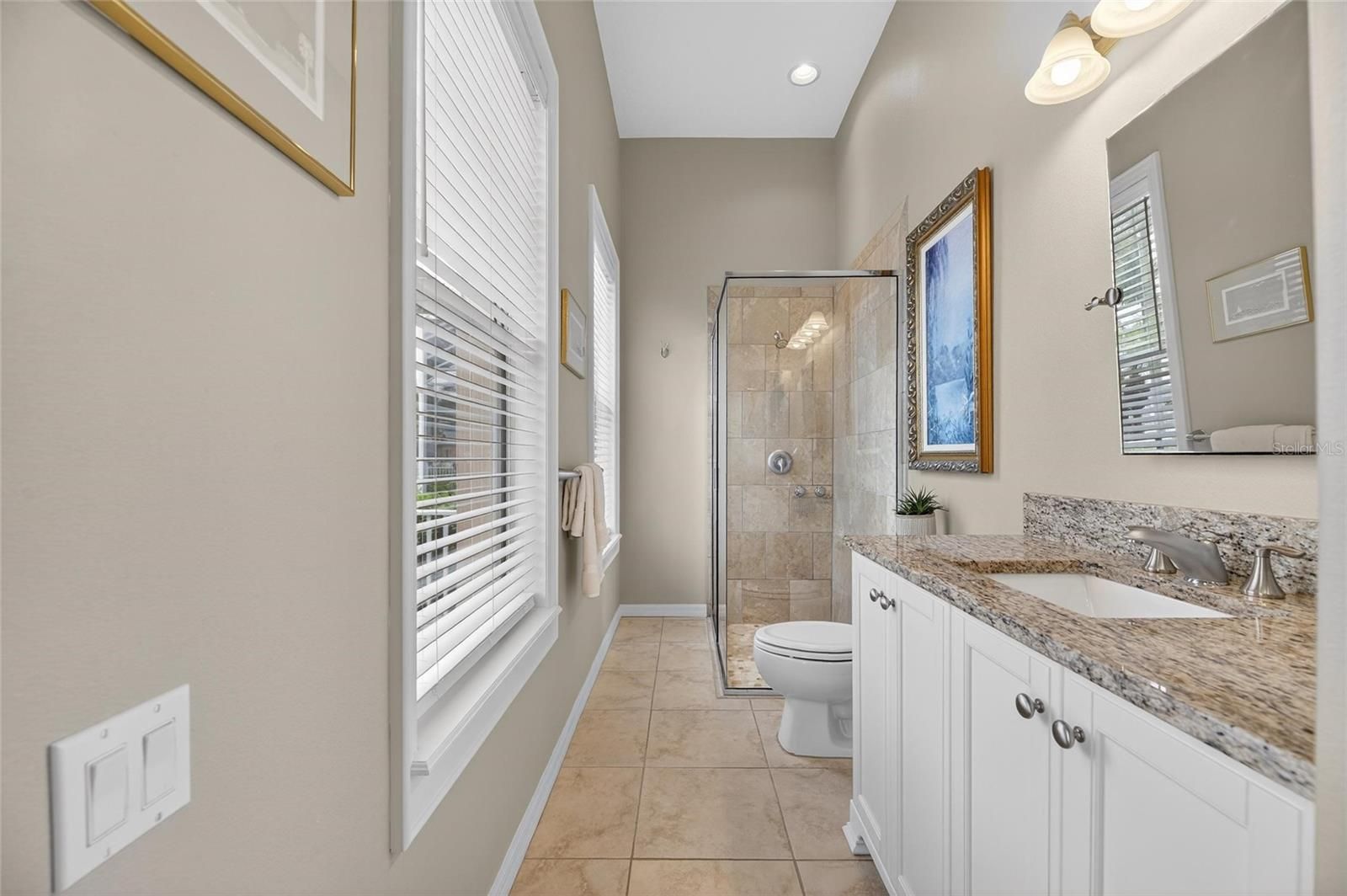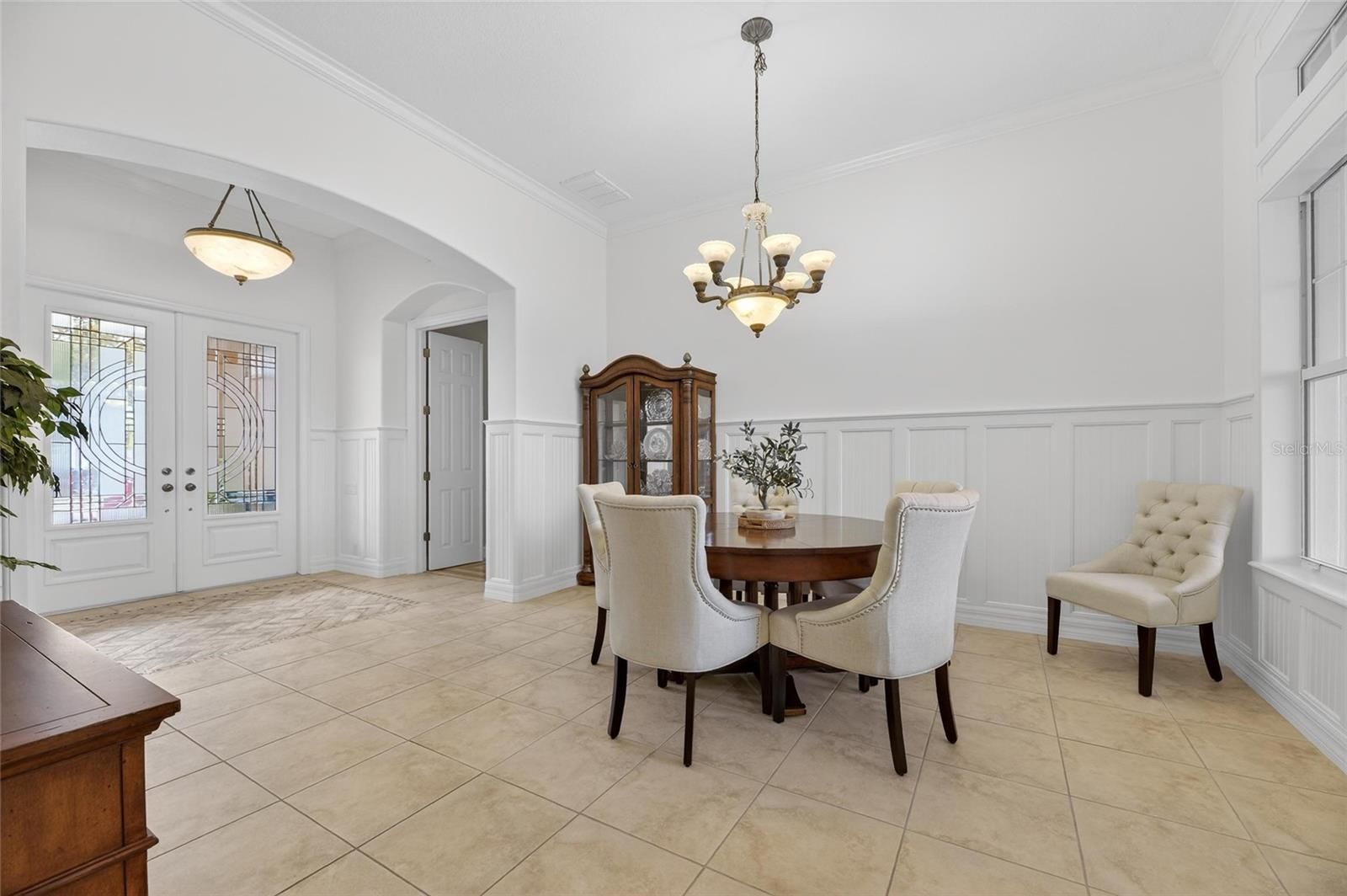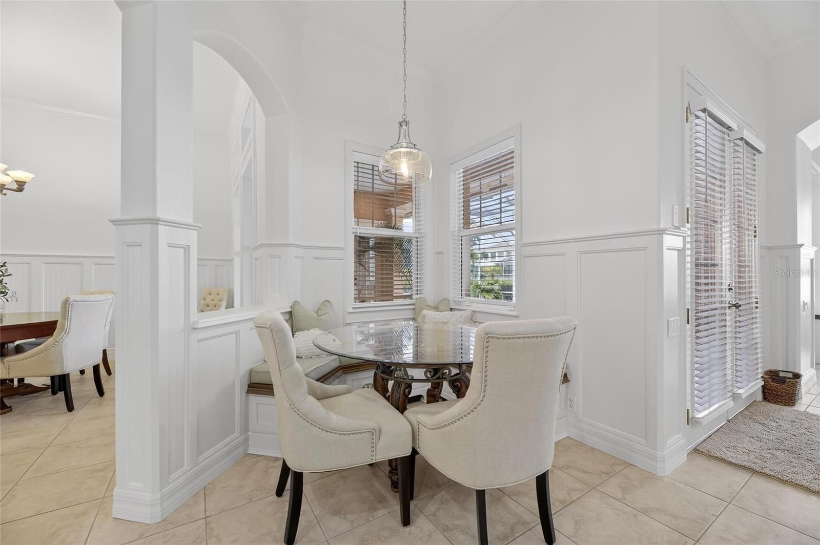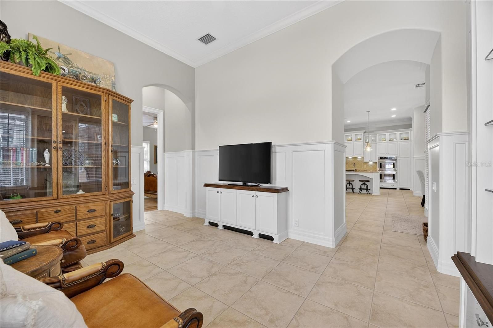 - Ceiling Fan(s), Crown Molding, Eat-in Kitchen, High Ceilings, Kitchen/Family Room Combo, L-Shaped Dining Room, Open Floorplan, Solid-Wood Cabinets, Split Bedrooms, Stone Counters, Thermostat, Walk-In Closet(s), Window Treatments