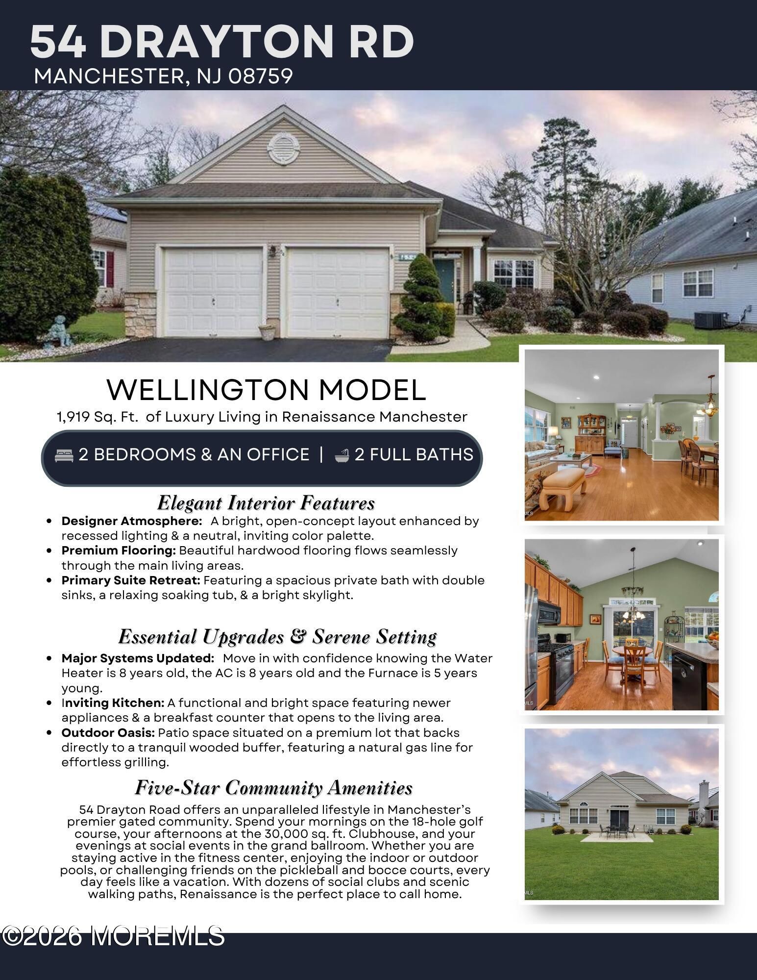 Exceptional Opportunity in Renaissance at Manchester...Welcome to this beautifully maintained Wellington model, ideally situated on a premium private lot backing to wooded views in the highly desirable Renaissance 55+ community. This spacious 2-bedroom, 2-bath home with a dedicated office offers excellent flexibility, as the office can easily function as a den or potential third bedroom. The home features hardwood flooring throughout the main living areas, recessed lighting, and a bright open-concept layout designed for both comfortable everyday living and entertaining. The kitchen is well-appointed with newer appliances, ample cabinetry, and seamless flow into the dining and living are nd entertaining. The kitchen is well-appointed with newer appliances, ample cabinetry, and seam flow into the dining and living areas, creating an inviting space to gather. Sliding doors lead to a large patio with a natural gas line for grilling, perfect for enjoying the peaceful backyard setting or hosting guests. The primary suite offers a private retreat with an ensuite bath featuring double sinks and a soaking tub. A second bedroom and full bath provide comfortable accommodations for family or visitors. Recent major updates include a NEWER HVAC system and water heater, offering added efficiency and peace of mind! Now offered at an improved price, this home presents an excellent opportunity to enjoy comfort, privacy, and low-maintenance living in one of Manchester's most sought-after active adult communities. Residents of Renaissance enjoy a vibrant lifestyle with resort-style amenities, social activities, and beautifully maintained grounds. Schedule your private showing today!