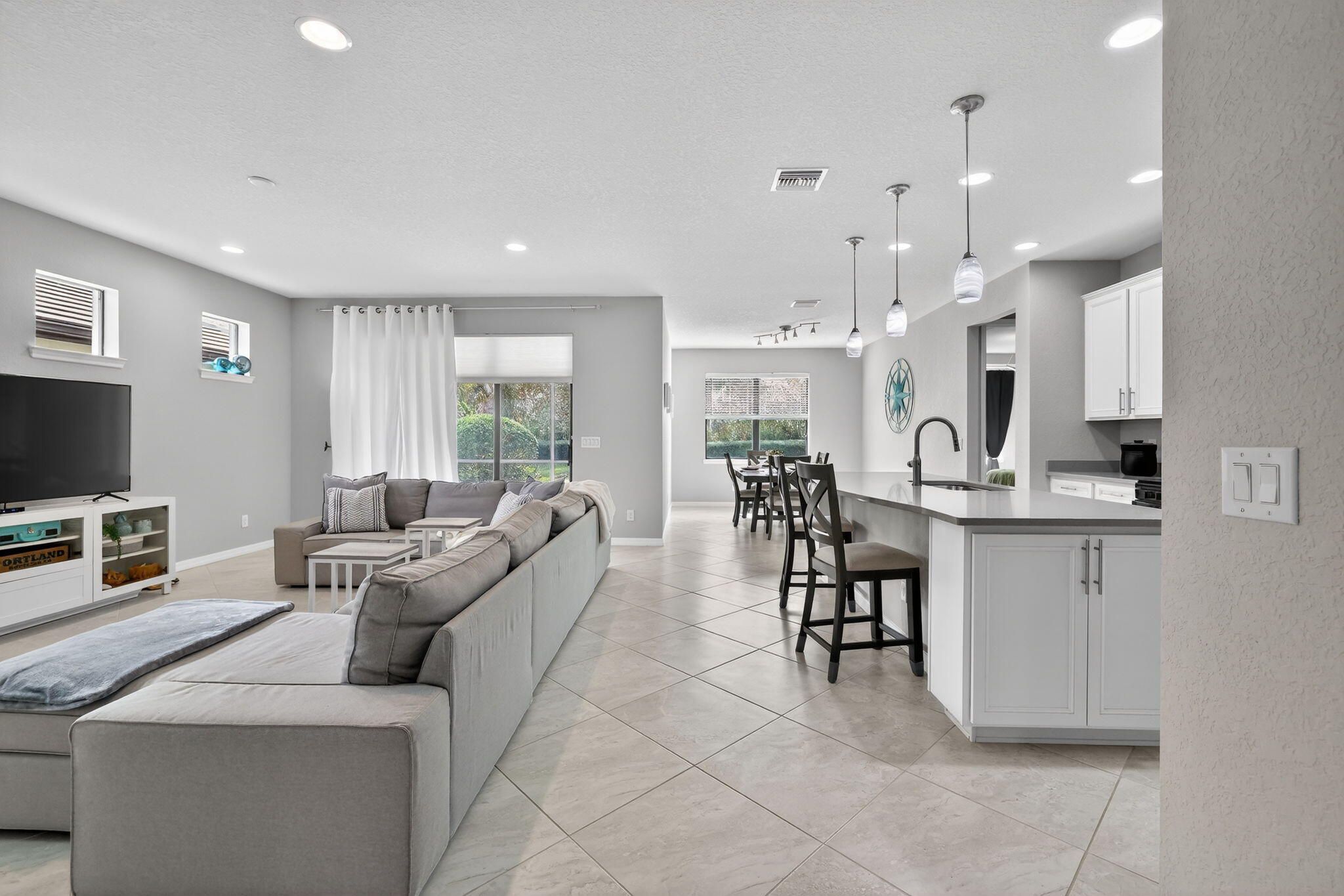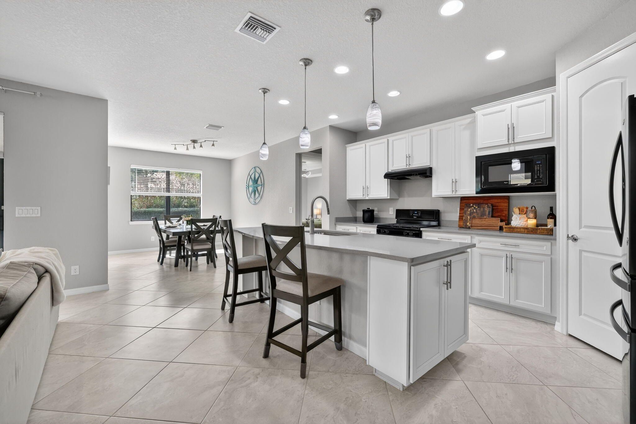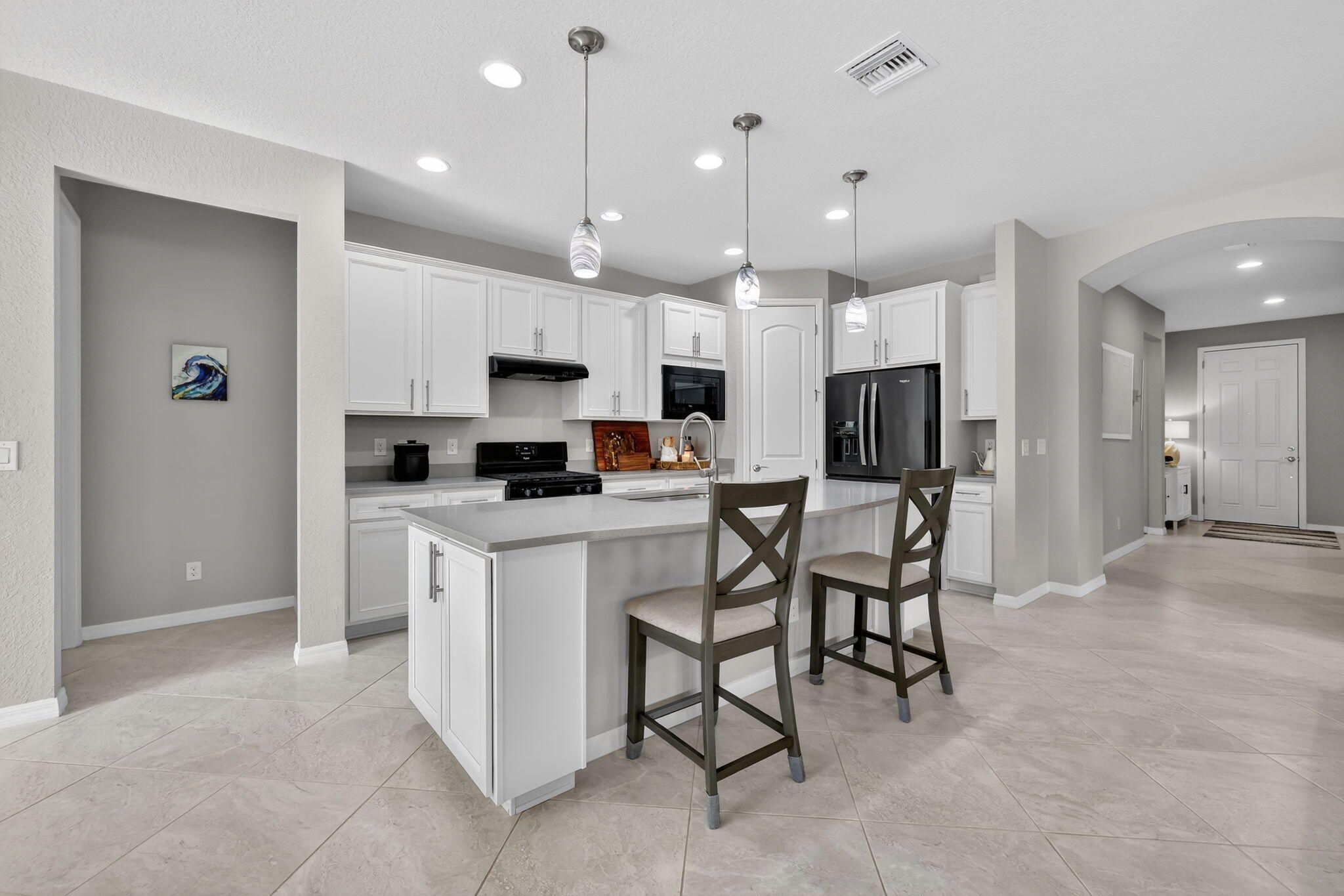 Welcome to this exceptional 3-bedroom plus office/den, 2-bath home located in the gated community of Veranda Gardens. Built in 2017, this home is beautifully decorated, immaculately maintained, and loaded with the owners' upgrades that make it one of a kind. The interior features ceramic tile laid on a diagonal throughout the living areas, with luxury vinyl flooring in the bedrooms. The kitchen is a standout with 42'' cabinets (taller than the standard 36''), an extended island, quartz countertops, and a gas stove. Both kitchen and bathrooms feature comfort-height counters for added convenience. The master bathroom boasts a frameless shower, while the screened patio offers a relaxing outdoor retreat. An extra outlet located on the living room floor adds functionality, and the backyard ample space for a pool. Practical upgrades include 8-foot two-panel doors, a gas dryer, hot water heater, and an in-wall pest control system that creates a "virtual barrier" against pests like ants, cockroaches, and silverfish. Veranda Gardens offers a vibrant lifestyle with plentiful amenities, including a clubhouse, playground, fitness center, multiple pools, dog park, pickleball and tennis courts, a fire pit, outdoor bar/dining area, grilling areas, and more. Conveniently located just minutes from Palm City and Stuart, this community provides easy access to interstates, beaches, shopping, restaurants, and top-rated schools. This home is a rare find, combining luxury, practicality, and an unbeatable location. Don't miss the chance to make it yours!