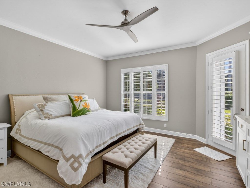 Rarely available, this gorgeous first floor coach home with two car garage in Pointe II at Pelican Bay has benefited from many recent updates. The bright and open floor plan features a neutral color palette and beautiful wide plank wood floors in the living areas and primary bedroom. The gourmet island kitchen has neutral quartz countertops, a double wall oven, Bosch cooktop and Liebherr refrigerator with freezer drawers below, plus an expansive breakfast bar. The great room is open and spacious, perfect for entertaining, and has a built in dry-bar with wine cooler. There are plantation shutters and remote-controlled shades to the windows and sliders throughout, and the split floor plan offers separation between the primary suite and guest rooms. The spacious, screened lanai faces a charming, landscaped area and has electric storm shutters. The home is located in Flood Zone X.500. The gated community of Pointe II has a gorgeous pool and spa area with BBQ grills and a clubhouse with meeting rooms and a workout facility. Pelican Bay is Naples’ premier beach community, with 3 miles of pristine white sand beaches, beach furniture provided, plus sailing, canoeing and kayaking and two private beach clubs with indoor and outdoor dining for lunch, cocktails and dinner. The Community Center has a full-service gym with fitness classes, yoga and pilates, and many other activities to suit a range of interests, plus there are 18 tennis courts with active tennis programs and pickleball too! Set amongst the mangroves, Pelican Bay has miles of walking and biking trails and offers a very special and unique Southwest Florida lifestyle.