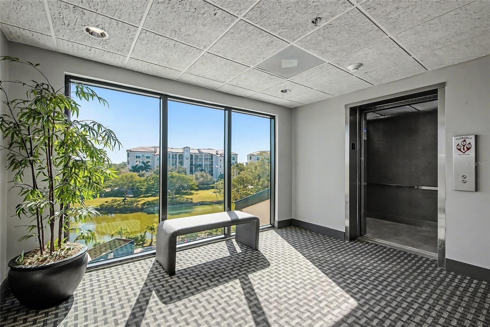 - Ceiling Fan(s), Eat-in Kitchen, Elevator, High Ceilings, Living/Dining Room, Open Floorplan, Split Bedrooms, Stone Counters, Thermostat, Walk-In Closet(s), Window Treatments