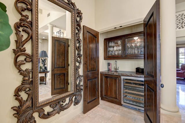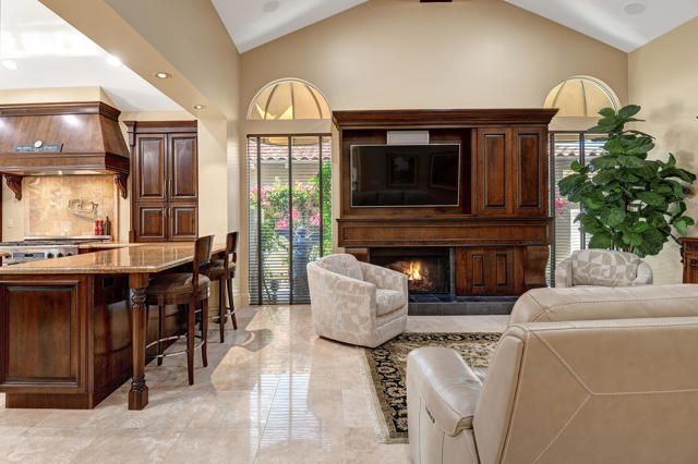 There isn't a more exquisite south-facing view of PGA West's Stadium Course and surrounding mountains available for purchase! Even though you'll already be sold on the home after taking in the panoramic golf course and mountain views of the 6th and 7th holes from your newly renovated back patio space. It's still worth noting all the incredible features this home has to offer! As you walk through the entry gate, you're immediately struck by the beauty of the landscaping and the tranquility of the water feature, creating a zen-like environment to gather one's thoughts. Through the courtyard you reach the grand entry of the home, which yields a sneak peak of the ''Wow Factor'' soon to come. The Living Room, Dining Room, Kitchen and Primary Suite all share the same stunningly framed views of the back patio, bringing the amazing qualities of the exterior to the interior. Highlights and features of this home include: imported iron & glass double doors, polished stone flooring, high beamed ceilings, hidden bar and wine fridge, and custom floor-to-ceiling fireplace. The chef's kitchen features custom wood finishes, top-of-the-line Dacor, Miele & Sub-Zero appliances, a walk-in pantry, & convenient breakfast bar. The third bedroom has been transformed into an large office, offering a functional area.The primary bathroom has been completely remodeled with a luxurious soaking tub. A new HVAC unit was also just installed as well! There's really too much good stuff to list about this home, the details are endless. Come see for yourself! Buyer to verify all information.