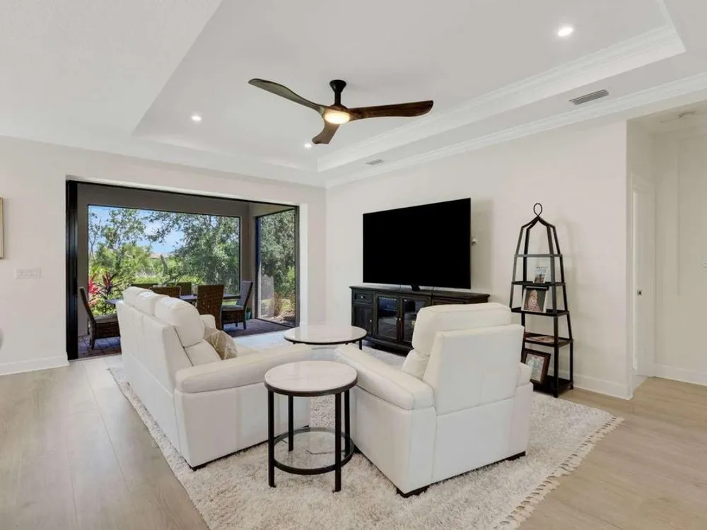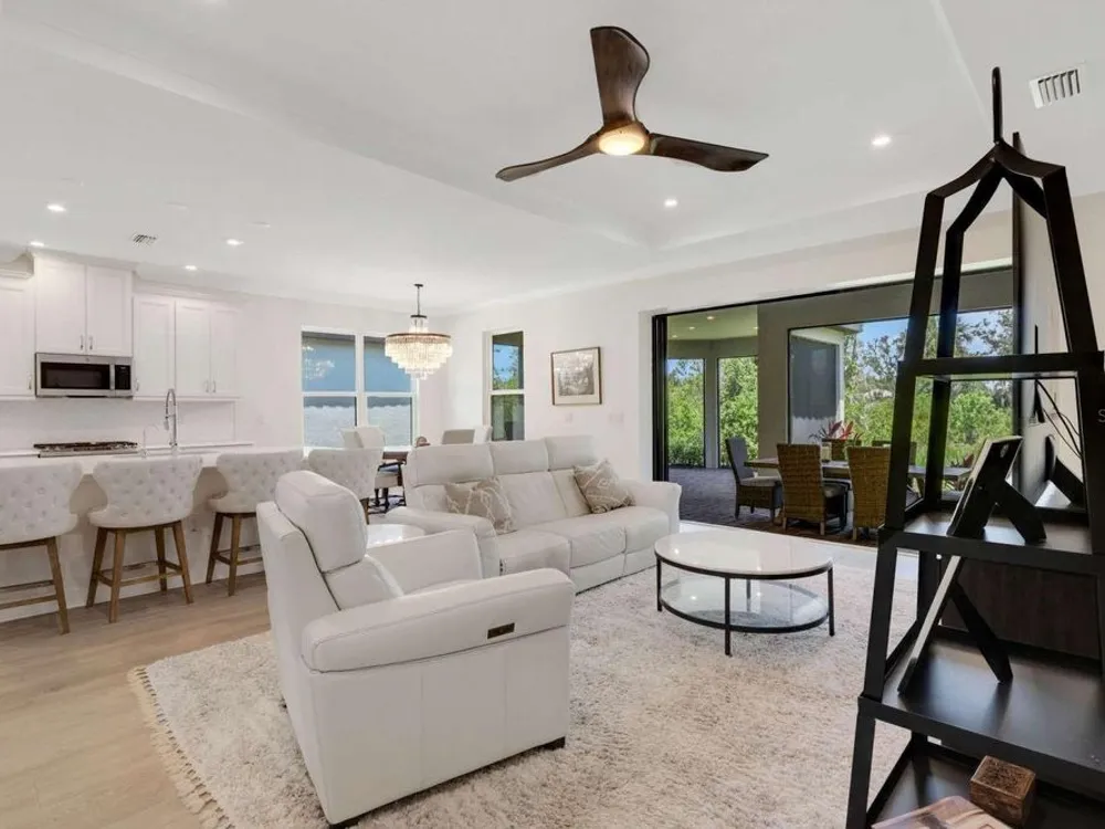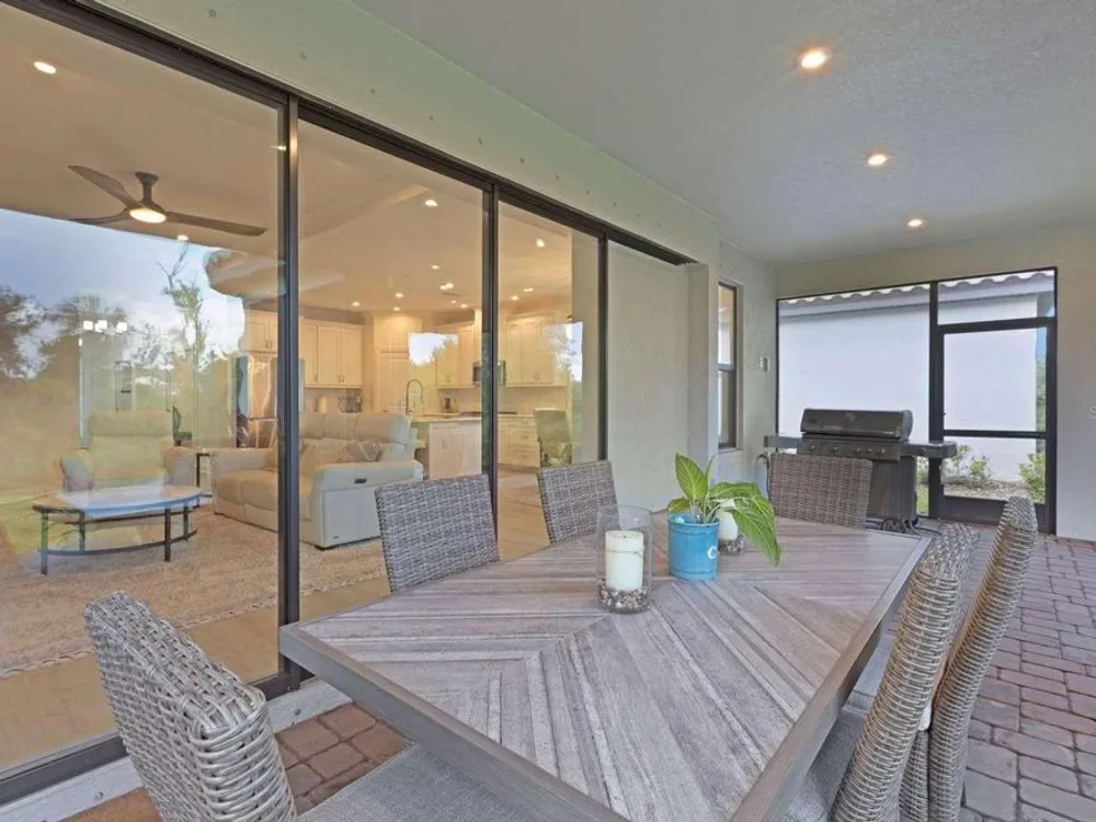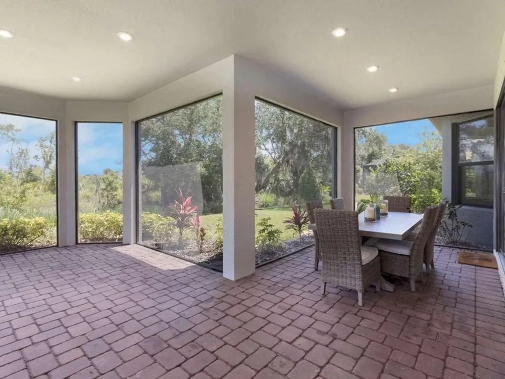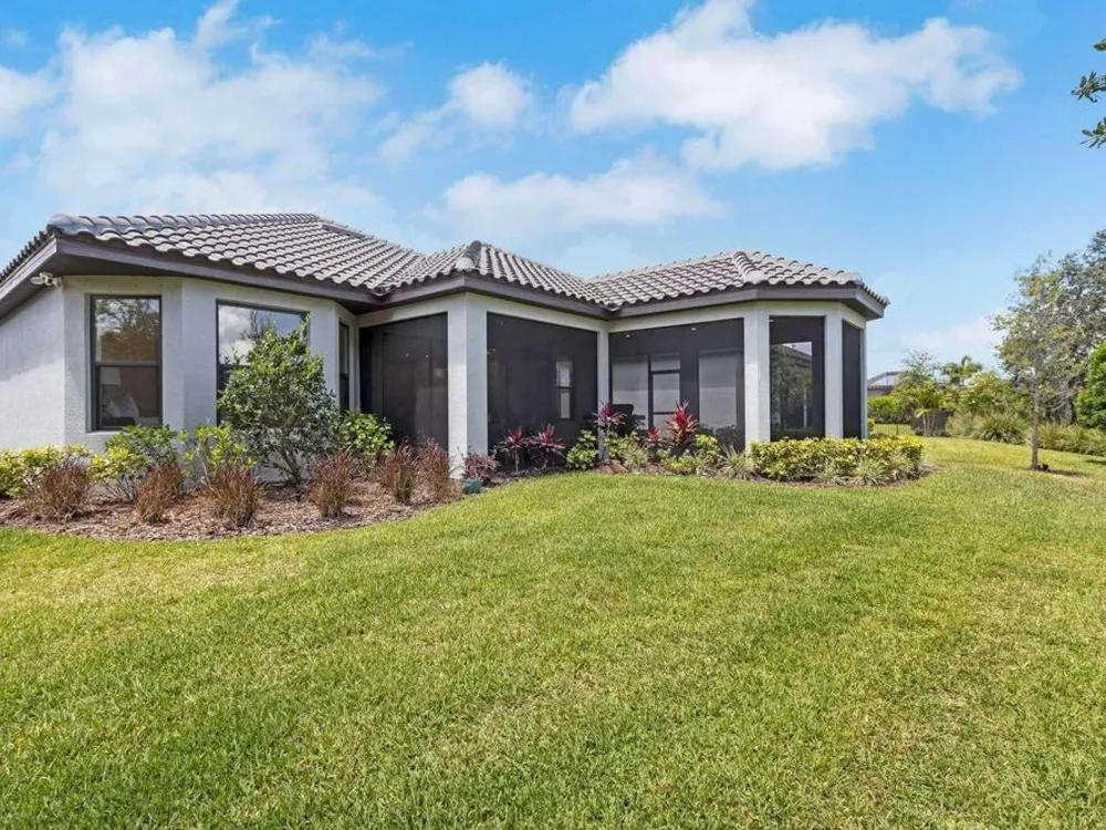 Resort-Style living in Esplanade at Artisan Lakes Luxury Home built in October 2021 nestled on picturesque preserve home site. This resort style gated community offers maintenance free living at its finest and is NOT located in a flood zone. As you enter, you are greeted by customized woodwork in foyer, tray ceilings with warm neutral color palette with views right out to your private preserve. This open floor plan has high ceilings along with 8-foot doors. The modern kitchen features upgraded GE appliances, 42 cabinets, a huge quartz island and a large walk-in pantry. Crown moldings throughout house and large tray ceilings in living room. Large slider lead out to your no-see-um screened in large expanded outdoor covered L shaped lanai with brick pavers. Lanai provides additional space for entertaining or relaxing year round. The Owners Suite includes a beautiful bay window with views of the preserve, tray ceiling, a large bathroom with walk in shower, dual sinks with quartz countertop, and walk in closet. The guest bedroom has own bathroom and large closets. There is a spacious Den room offering the ideal space for a den or office. A half guest bath is located near the oversized laundry room. The laundry room has a deep sink and 42 inch cabinets lining the wall. There is upgraded 300 amp extra panel box in garage for electric car or generator. The two car garage has 4 feet extra space, customized epoxy floor coating and pull down stairs for the attic. The home has hurricane windows at the front of home, hurricane shutters for the remaining windows, water softener system, tank less gas water heater, reverse osmosis system in kitchen, and wired for sound throughout house and lanai. The Amenity Center has a state-of-the-art fitness center and an onsite lifestyle manager to coordinate special events and activities. Other great amenities are the tennis courts, pickle ball courts, bocce ball, the gorgeous zero entry lagoon style pool with cabanas, hot tub and resistance pool. There are walking trails, dog parks, a playground and a butterfly garden! The low Home Owners Association fee provides for all the great amenities plus cable TV, internet service and yard maintenance. This community is centrally located minutes away from I-75 and I 275 for easy commute to Sarasota, Tampa, St Pete and Gulf Coats area. Experience the best of Florida living and schedule your showing today to make this exquisite move-in-ready home yours. Don't miss out on the chance to immerse yourself in the resort-style lifestyle offered by the Esplanade at Artisan Lakes community.