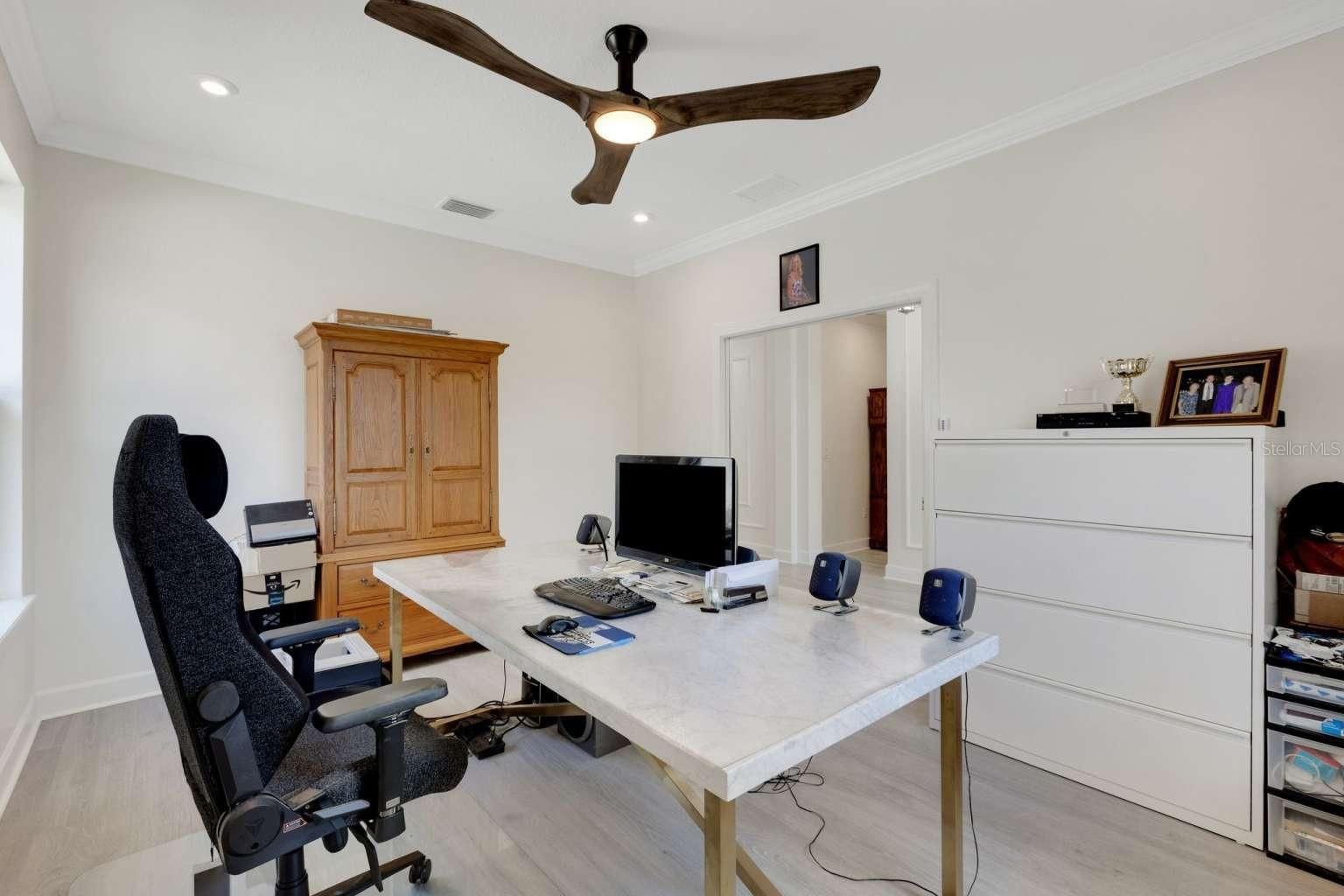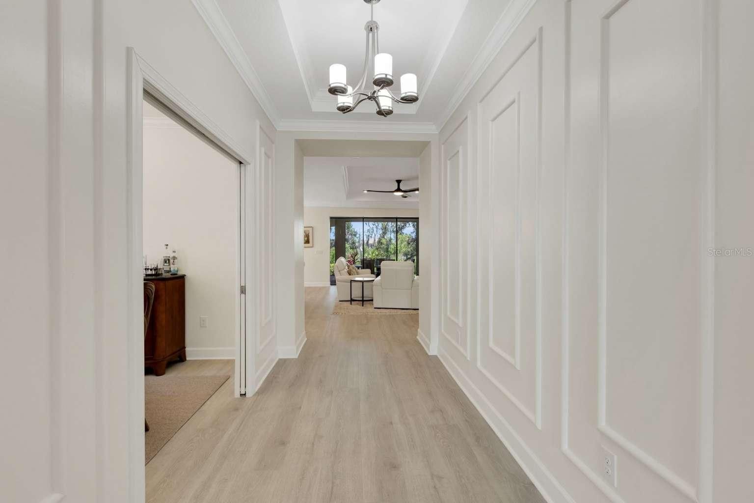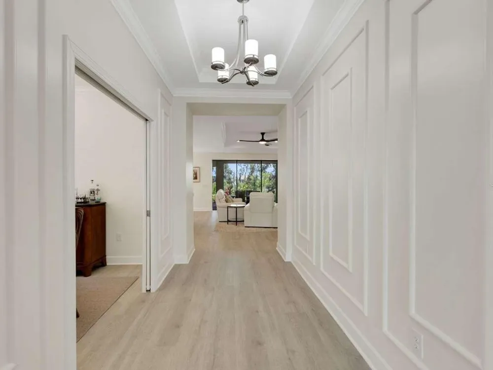 Resort-Style living in Esplanade at Artisan Lakes Luxury Home built in October 2021 nestled on picturesque preserve home site. This resort style gated community offers maintenance free living at its finest and is NOT located in a flood zone. As you enter, you are greeted by customized woodwork in foyer, tray ceilings with warm neutral color palette with views right out to your private preserve. This open floor plan has high ceilings along with 8-foot doors. The modern kitchen features upgraded GE appliances, 42 cabinets, a huge quartz island and a large walk-in pantry. Crown moldings throughout house and large tray ceilings in living room. Large slider lead out to your no-see-um screened in large expanded outdoor covered L shaped lanai with brick pavers. Lanai provides additional space for entertaining or relaxing year round. The Owners Suite includes a beautiful bay window with views of the preserve, tray ceiling, a large bathroom with walk in shower, dual sinks with quartz countertop, and walk in closet. The guest bedroom has own bathroom and large closets. There is a spacious Den room offering the ideal space for a den or office. A half guest bath is located near the oversized laundry room. The laundry room has a deep sink and 42 inch cabinets lining the wall. There is upgraded 300 amp extra panel box in garage for electric car or generator. The two car garage has 4 feet extra space, customized epoxy floor coating and pull down stairs for the attic. The home has hurricane windows at the front of home, hurricane shutters for the remaining windows, water softener system, tank less gas water heater, reverse osmosis system in kitchen, and wired for sound throughout house and lanai. The Amenity Center has a state-of-the-art fitness center and an onsite lifestyle manager to coordinate special events and activities. Other great amenities are the tennis courts, pickle ball courts, bocce ball, the gorgeous zero entry lagoon style pool with cabanas, hot tub and resistance pool. There are walking trails, dog parks, a playground and a butterfly garden! The low Home Owners Association fee provides for all the great amenities plus cable TV, internet service and yard maintenance. This community is centrally located minutes away from I-75 and I 275 for easy commute to Sarasota, Tampa, St Pete and Gulf Coats area. Experience the best of Florida living and schedule your showing today to make this exquisite move-in-ready home yours. Don't miss out on the chance to immerse yourself in the resort-style lifestyle offered by the Esplanade at Artisan Lakes community.