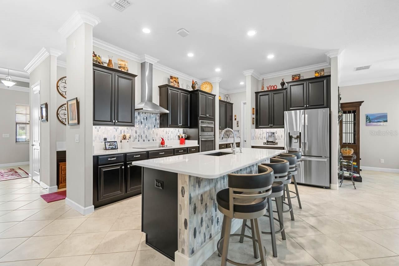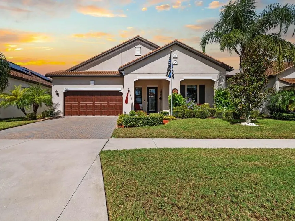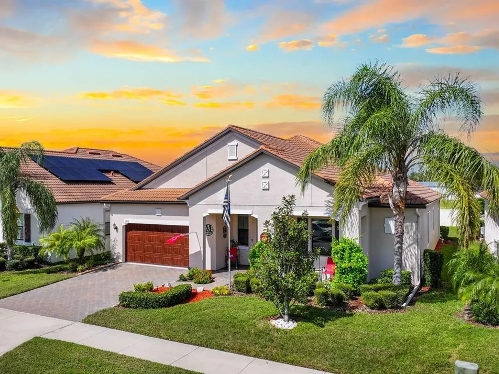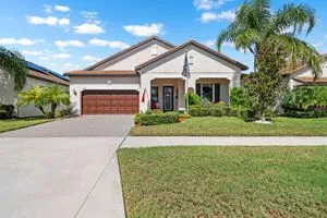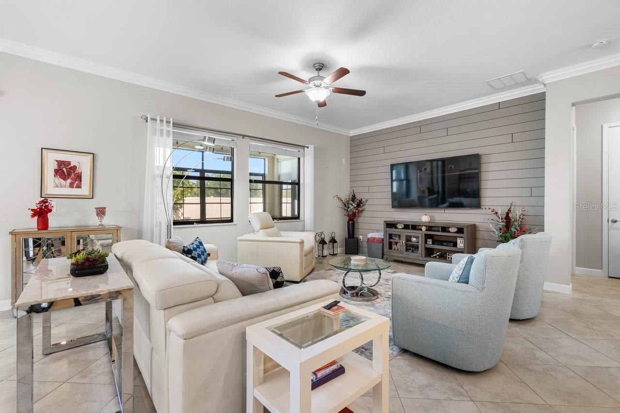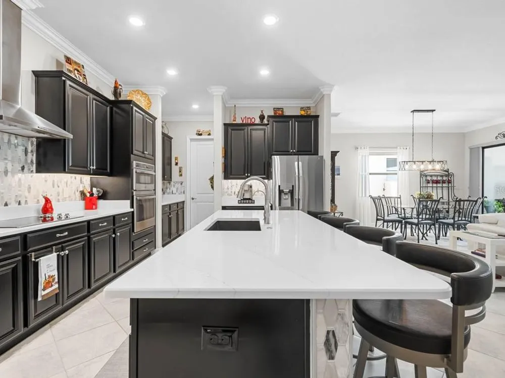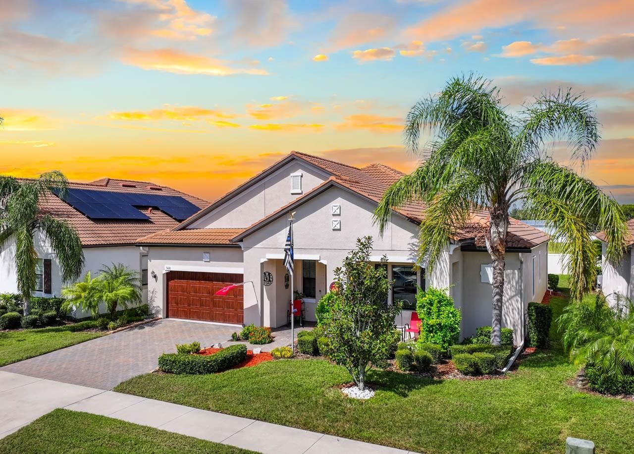 Luxury amenities await you in this beautifully maintained 3-bedroom, 2.5-bathroom, 2-car garage home in the active 55+ Medley neighborhood within the gorgeous Southshore Bay community! The garage features an under-stair closet, ceiling racks, and a second-story LOFT STORAGE room. No need for a costly storage unit; there's a space for everything right here! Plentiful highlights of this gorgeous home include: PAVER DRIVEWAY, QUARTZ COUNTERTOPS, diamond pattern CERAMIC TILE FLOORING in most of the home, CROWN MOLDING, WATER SOFTENER, TRAY CEILINGS, a covered front porch, and so much more. This OPEN CONCEPT floorplan splits a spacious living room area with custom accent wall with a lovely dining area and the show-stopping, COMPLETELY UPDATED KITCHEN. Stainless Steel appliances, backsplash, large ISLAND with bar seating, wall-mounted oven & microwave with separate cooktop & range hood, kitchen sink WATER PURIFICATION system, and an excess of countertop and cabinet space. Make your culinary dreams come true! The opulent primary suite boasts a deep WALK-IN CLOSET and an EN-SUITE BATHROOM complete with a DUAL-SINK VANITY, OVERSIZED SHOWER stall, and water closet. One of the secondary bedrooms features its own EN-SUITE BATHROOM with single-sink vanity and tub/shower combination. The third bedroom, currently used as an office, has French Doors and is only a few steps from the half bathroom with its single-sink vanity. The Laundry Room has cabinet storage as well as countertop space. The COVERED & SCREENED LANAI is more like extending living space with its indoor/outdoor carpet, ceilings fans, and fully ENCLOSED windows that can be opened to take in a breeze through the screen or closed if there's a chill. Entertain outside in comfort! Enjoy a wide range of resort-style amenities exclusive to living in Medley, such as their clubhouse, pickleball courts, resort-style pool, billiard room, ballroom, an on-site cafe & bar, and the state-of-the-art fitness center! In addition to these amenities are those available to all of Southshore Bay, most notably the incredible 5-acre crystal clear lagoon: kayak, paddleboard, swim, or visit the swim-up bar! Enjoy a carefree and relaxed lifestyle here, where everyday can feel like a vacation.