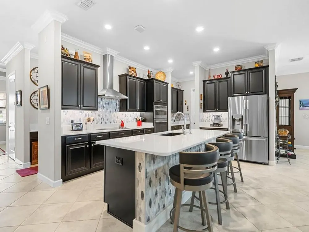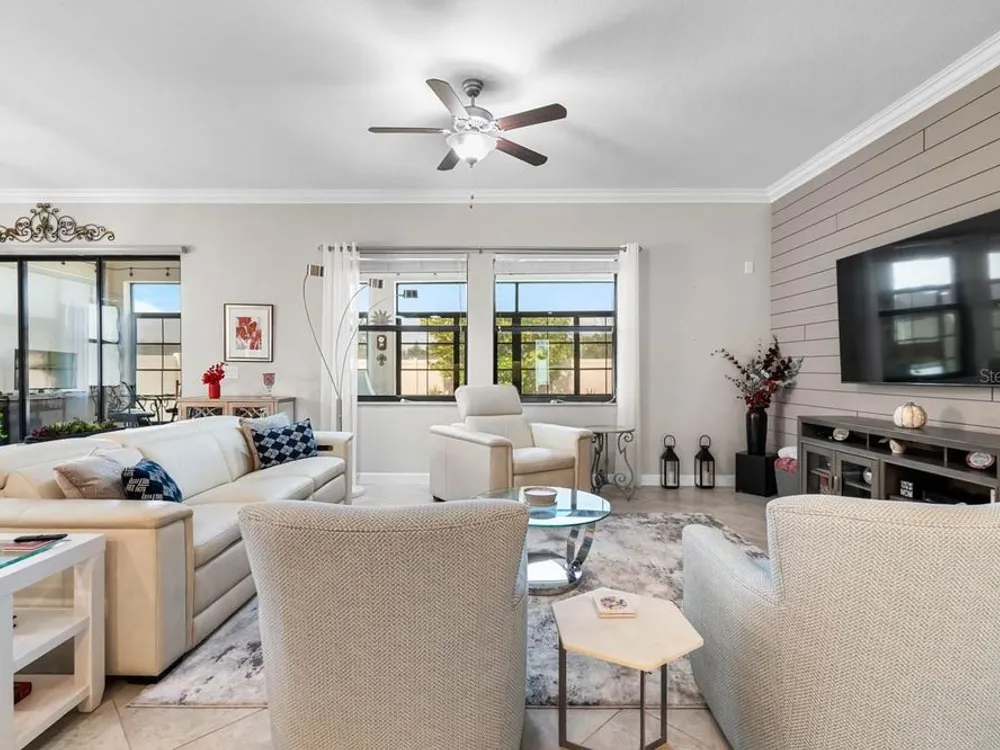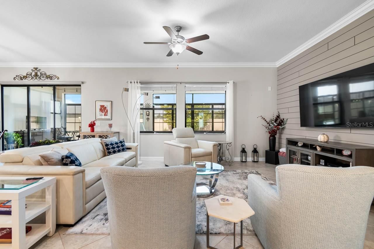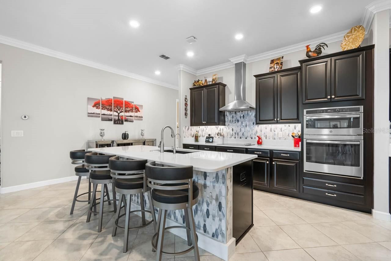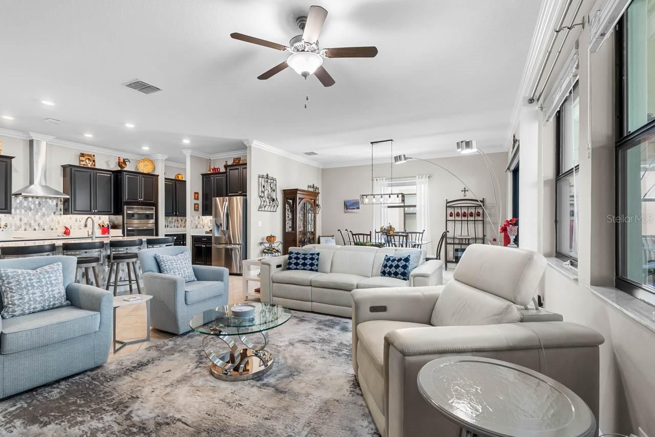 Luxury amenities await you in this beautifully maintained 3-bedroom, 2.5-bathroom, 2-car garage home in the active 55+ Medley neighborhood within the gorgeous Southshore Bay community! The garage features an under-stair closet, ceiling racks, and a second-story LOFT STORAGE room. No need for a costly storage unit; there's a space for everything right here! Plentiful highlights of this gorgeous home include: PAVER DRIVEWAY, QUARTZ COUNTERTOPS, diamond pattern CERAMIC TILE FLOORING in most of the home, CROWN MOLDING, WATER SOFTENER, TRAY CEILINGS, a covered front porch, and so much more. This OPEN CONCEPT floorplan splits a spacious living room area with custom accent wall with a lovely dining area and the show-stopping, COMPLETELY UPDATED KITCHEN. Stainless Steel appliances, backsplash, large ISLAND with bar seating, wall-mounted oven & microwave with separate cooktop & range hood, kitchen sink WATER PURIFICATION system, and an excess of countertop and cabinet space. Make your culinary dreams come true! The opulent primary suite boasts a deep WALK-IN CLOSET and an EN-SUITE BATHROOM complete with a DUAL-SINK VANITY, OVERSIZED SHOWER stall, and water closet. One of the secondary bedrooms features its own EN-SUITE BATHROOM with single-sink vanity and tub/shower combination. The third bedroom, currently used as an office, has French Doors and is only a few steps from the half bathroom with its single-sink vanity. The Laundry Room has cabinet storage as well as countertop space. The COVERED & SCREENED LANAI is more like extending living space with its indoor/outdoor carpet, ceilings fans, and fully ENCLOSED windows that can be opened to take in a breeze through the screen or closed if there's a chill. Entertain outside in comfort! Enjoy a wide range of resort-style amenities exclusive to living in Medley, such as their clubhouse, pickleball courts, resort-style pool, billiard room, ballroom, an on-site cafe & bar, and the state-of-the-art fitness center! In addition to these amenities are those available to all of Southshore Bay, most notably the incredible 5-acre crystal clear lagoon: kayak, paddleboard, swim, or visit the swim-up bar! Enjoy a carefree and relaxed lifestyle here, where everyday can feel like a vacation.