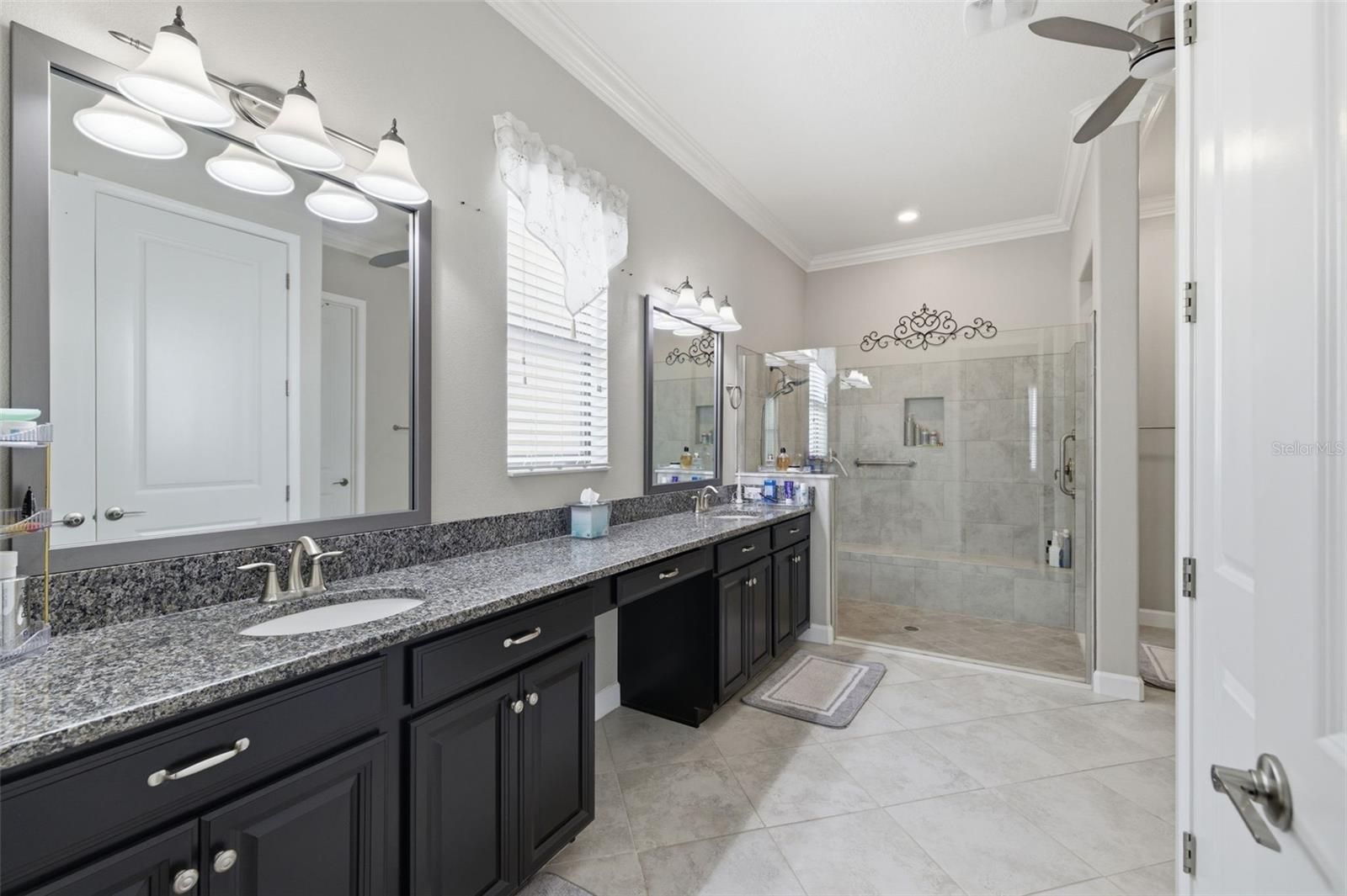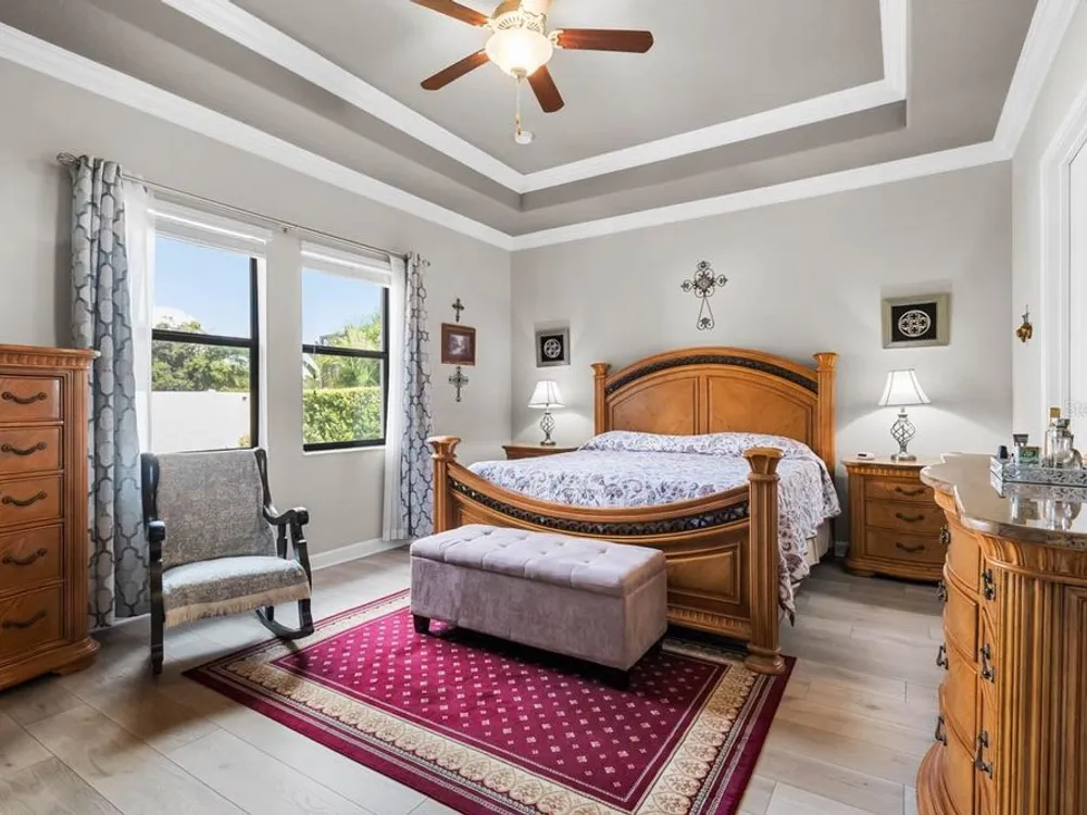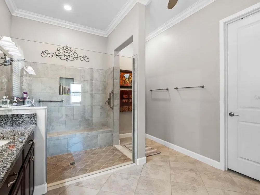 - Ceiling Fan(s), Crown Molding, High Ceilings, Living/Dining Room, Open Floorplan, Main Level Primary, Stone Counters, Thermostat, Tray Ceiling(s), Walk-In Closet(s)