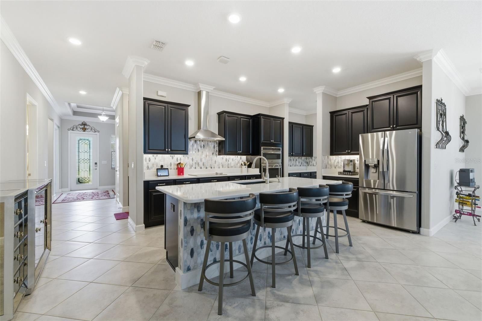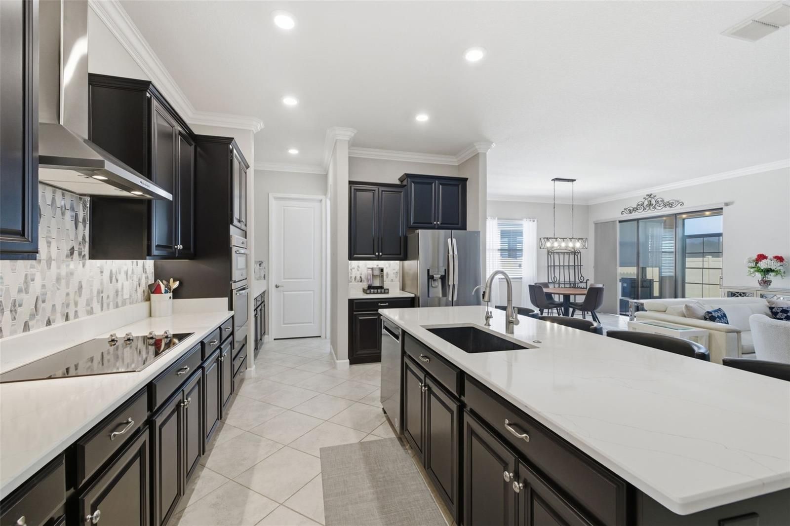 Step into a thoughtfully designed home where comfort, function, and style come together effortlessly. This beautifully maintained 3-bedroom, 2.5-bath residence with a 2-car garage is located in the vibrant 55+ Medley neighborhood within the highly sought-after Southshore Bay community, offering a lifestyle centered on ease and enjoyment. Inside, the open-concept layout creates a natural flow between the main living areas. A spacious living room with a custom accent wall connects seamlessly to the dining space and a fully updated kitchen that serves as the centerpiece of the home. The kitchen features stainless steel appliances, a striking backsplash, a large island with bar seating, a wall-mounted oven and microwave, separate cooktop with range hood, abundant cabinetry, and a dedicated water purification system at the sink. The primary suite offers a private retreat, complete with a generous walk-in closet and an en-suite bathroom featuring a dual-sink vanity, oversized walk-in shower, and a separate water closet. One secondary bedroom includes its own en-suite bath with a tub/shower combination, while the third bedroom—currently used as an office—features elegant French doors and sits conveniently near a half bathroom. A well-equipped laundry room provides additional cabinetry and counter space for everyday convenience. Outdoor living is just as inviting. The covered and screened lanai functions as an extension of the home, with indoor/outdoor carpeting, ceiling fans, and enclosed windows that can be opened for fresh air or closed for added comfort—ideal for relaxing or entertaining year-round. Additional features throughout the home include a paver driveway, quartz countertops, ceramic tile flooring in a diamond pattern, crown molding, tray ceilings, and a whole-home water softener system. The garage is exceptionally well-appointed, offering ceiling storage racks, an under-stair closet, and a second-story loft storage area—eliminating the need for off-site storage. Residents of Medley enjoy exclusive access to a wide array of resort-style amenities, including a clubhouse, pickleball courts, a resort pool, fitness center, ballroom, billiards room, and an on-site café and bar. In addition, the greater Southshore Bay community features a stunning 5-acre crystal-clear lagoon where residents can kayak, paddleboard, swim, or relax at the swim-up bar. This home offers a low-maintenance lifestyle in a community designed for both relaxation and recreation—where everyday living feels elevated.