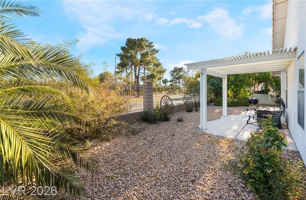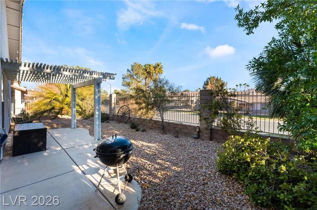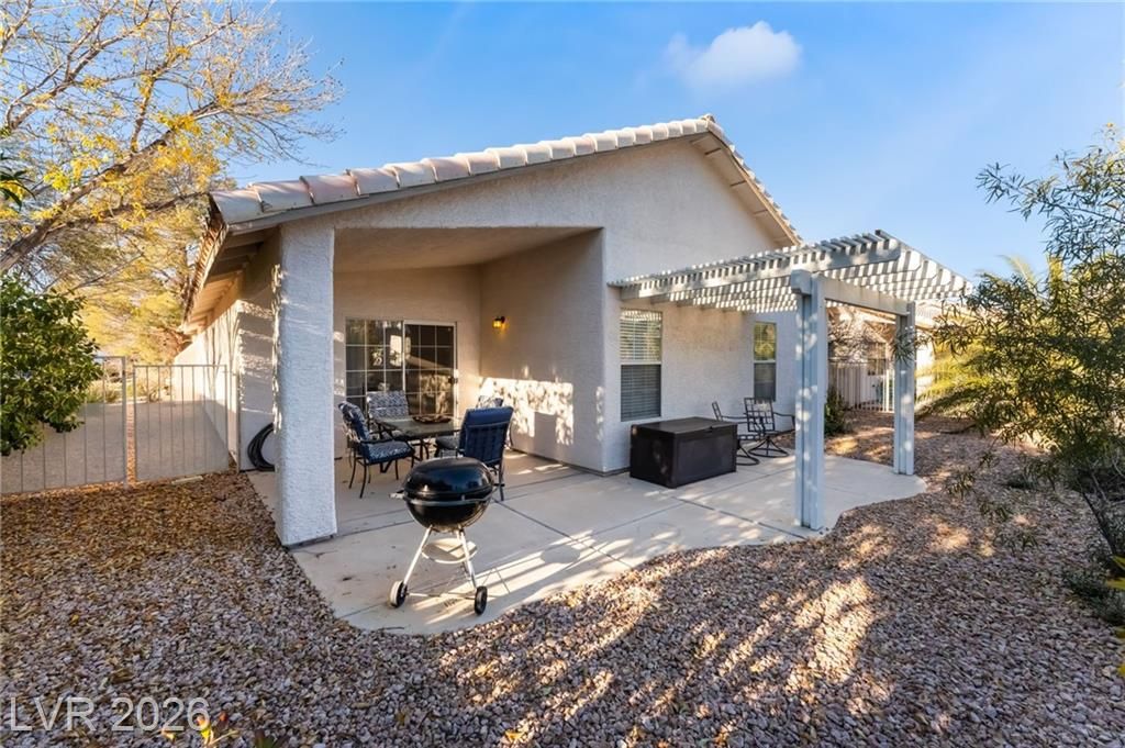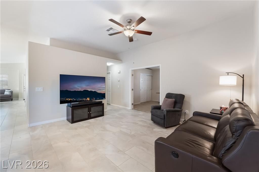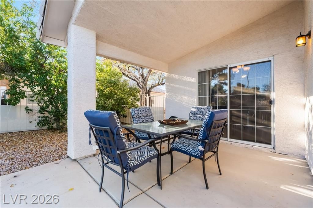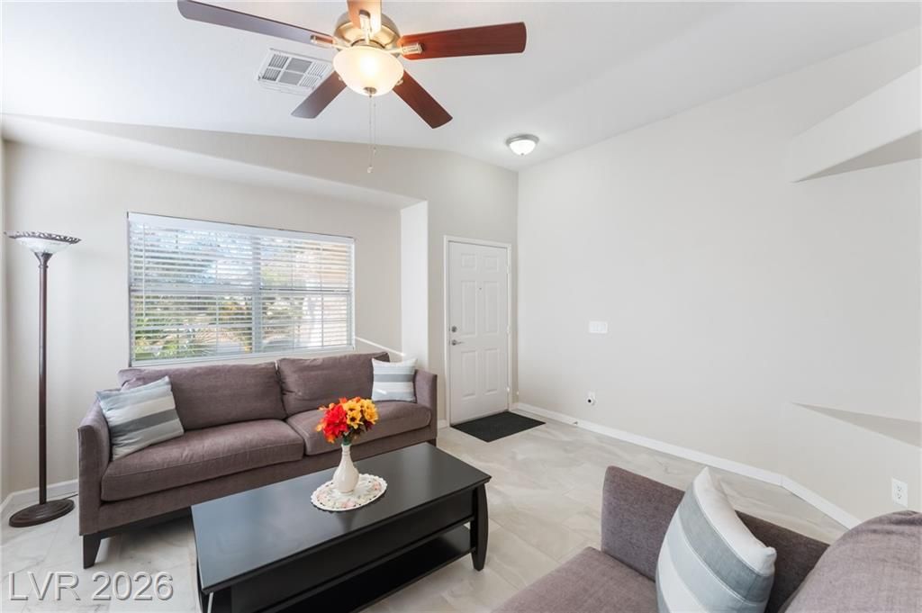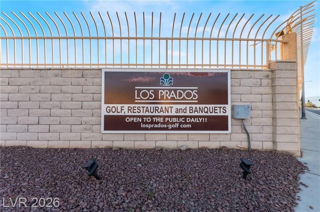 Pride of ownership throughout this beautifully maintained home in the gated community of Los Prados, a true hidden gem of Las Vegas. Offering 1,592 SF of living space on a 6,970 SF lot, this 3-bedroom, 2-bath home features a quartz kitchen with island, tile flooring throughout with carpeted bedrooms, ideal for the cooler days and an open family room layout. Additional highlights include a gas fireplace, ceiling fans, faux wood 2" cordless blinds, walk-in closet in the primary bedroom, newer A/C & heating (2021), and a newer garage door. All appliances included. Patio furniture may stay. Los Prados offers community pools, tennis courts, two golf courses, and a clubhouse with restaurant and banquet facilities. Meticulously cared for and move-in ready.