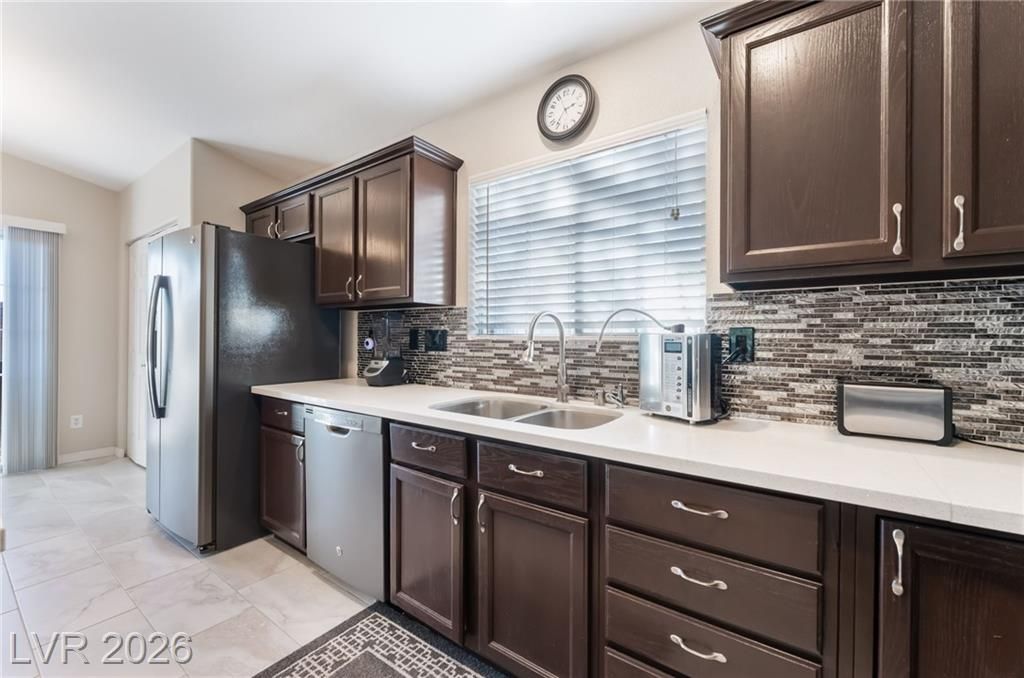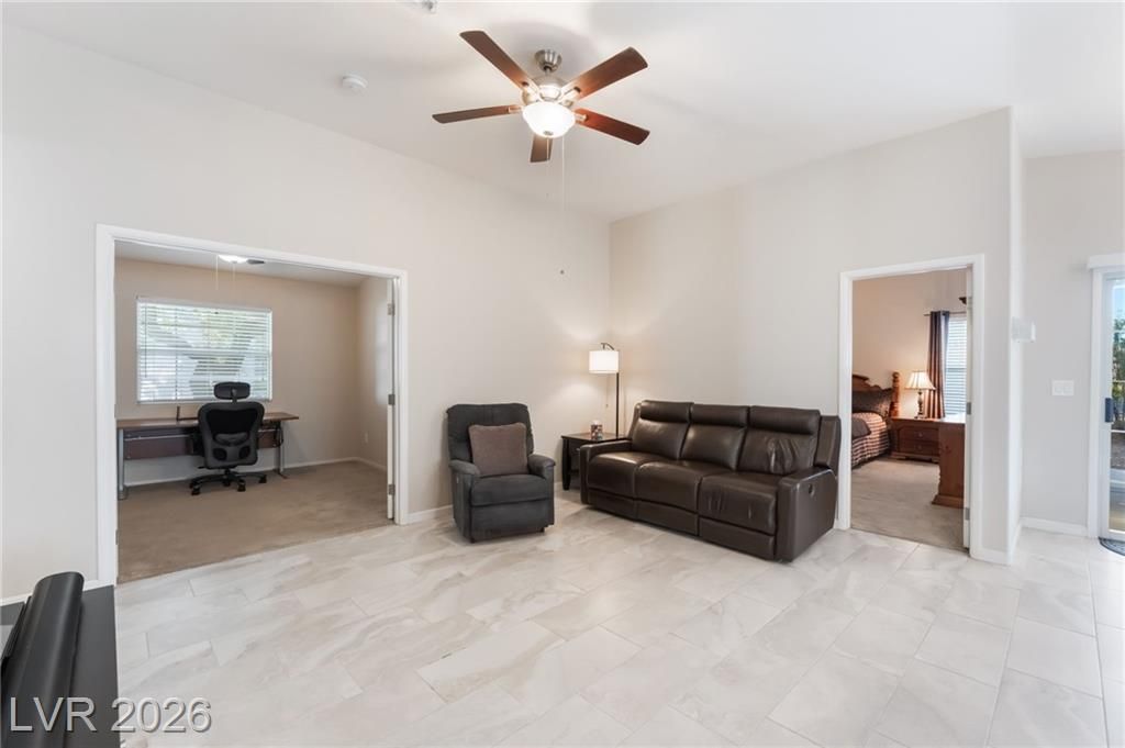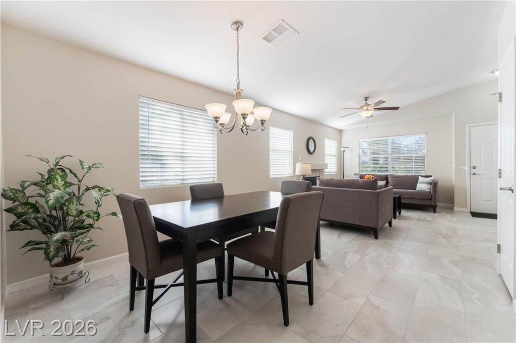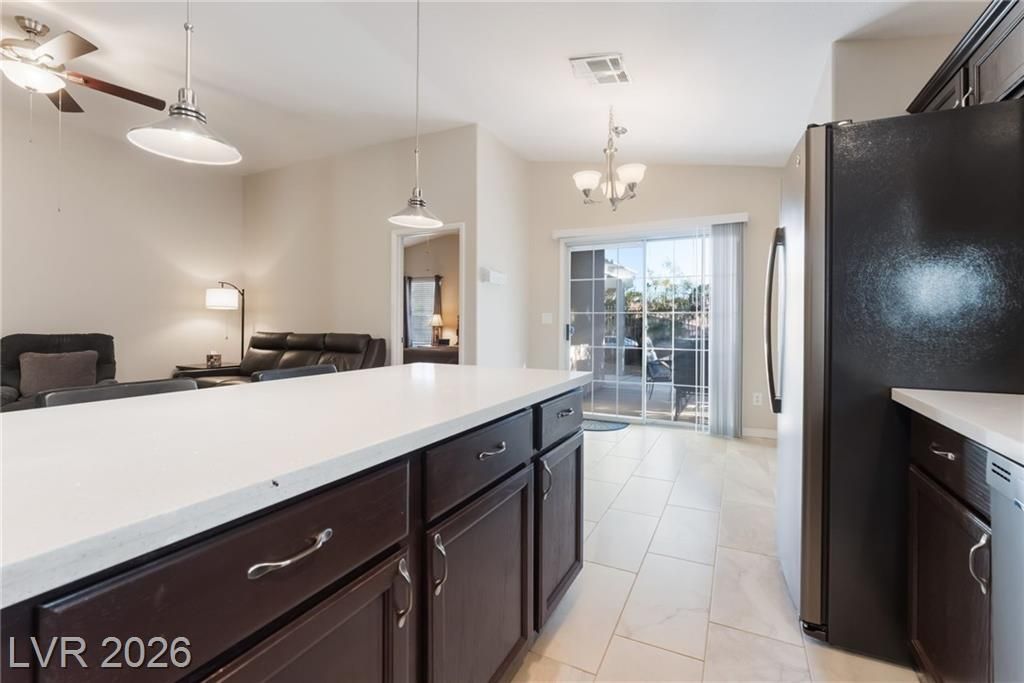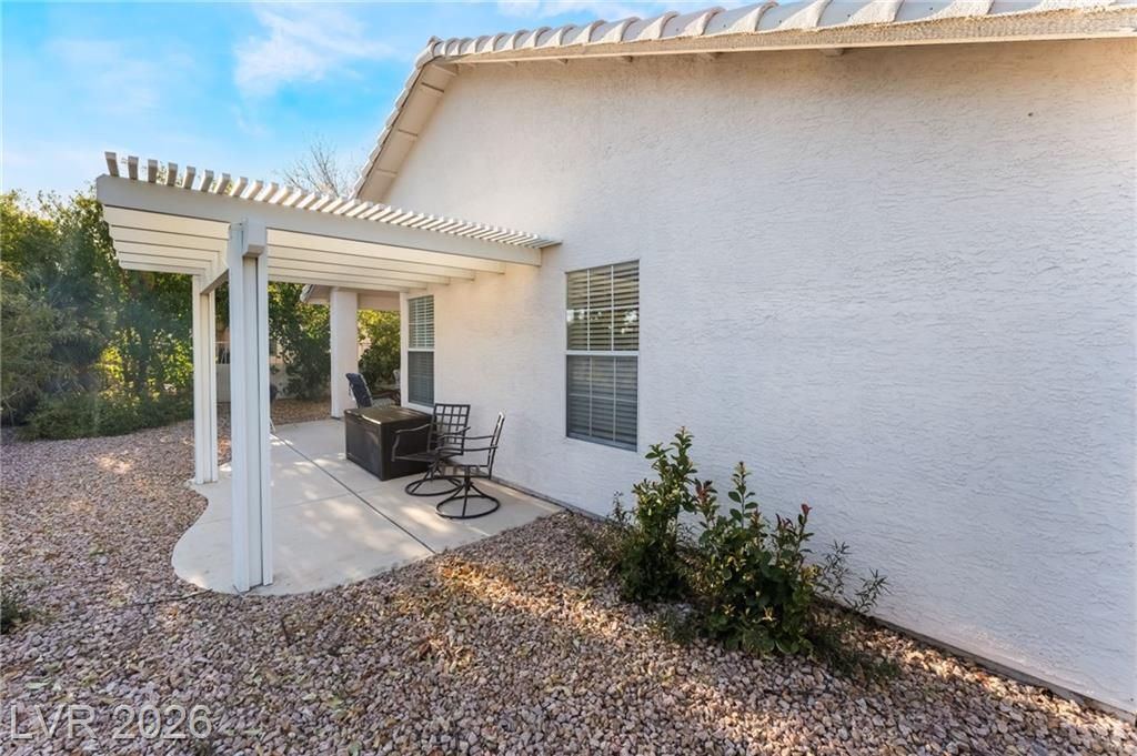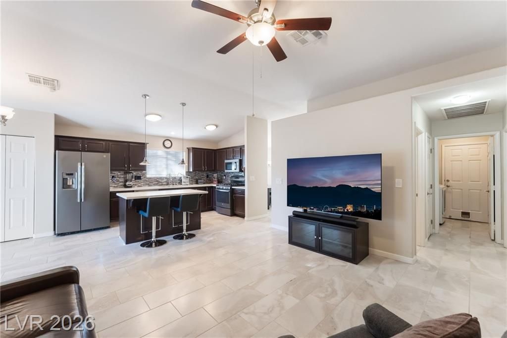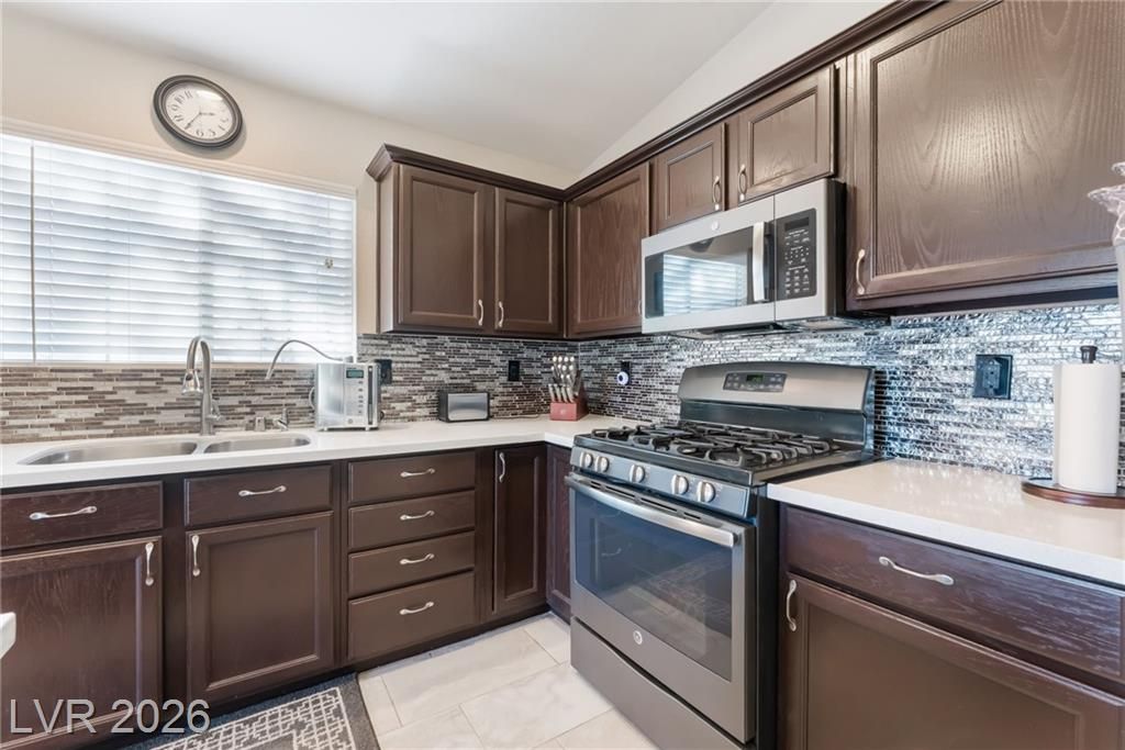 Pride of ownership throughout this beautifully maintained home in the gated community of Los Prados, a true hidden gem of Las Vegas. Offering 1,592 SF of living space on a 6,970 SF lot, this 3-bedroom, 2-bath home features a quartz kitchen with island, tile flooring throughout with carpeted bedrooms, ideal for the cooler days and an open family room layout. Additional highlights include a gas fireplace, ceiling fans, faux wood 2" cordless blinds, walk-in closet in the primary bedroom, newer A/C & heating (2021), and a newer garage door. All appliances included. Patio furniture may stay. Los Prados offers community pools, tennis courts, two golf courses, and a clubhouse with restaurant and banquet facilities. Meticulously cared for and move-in ready.