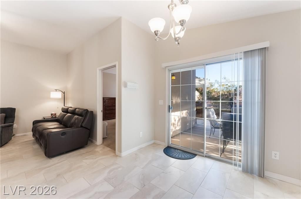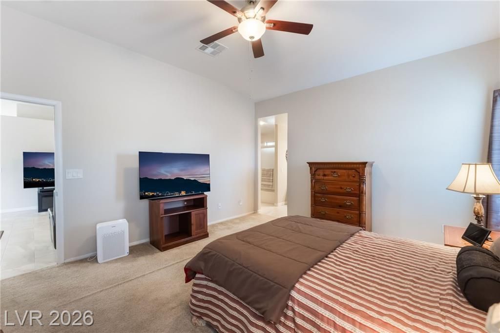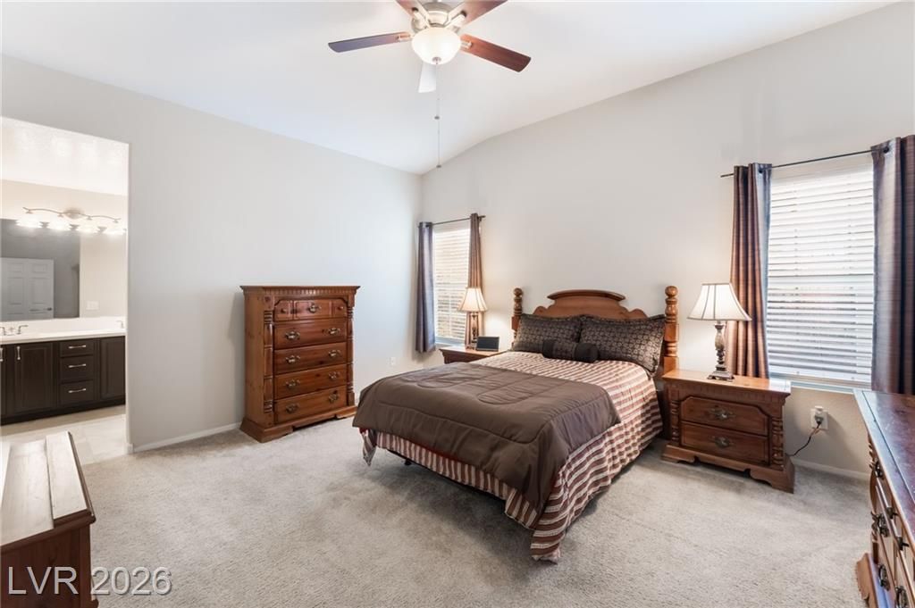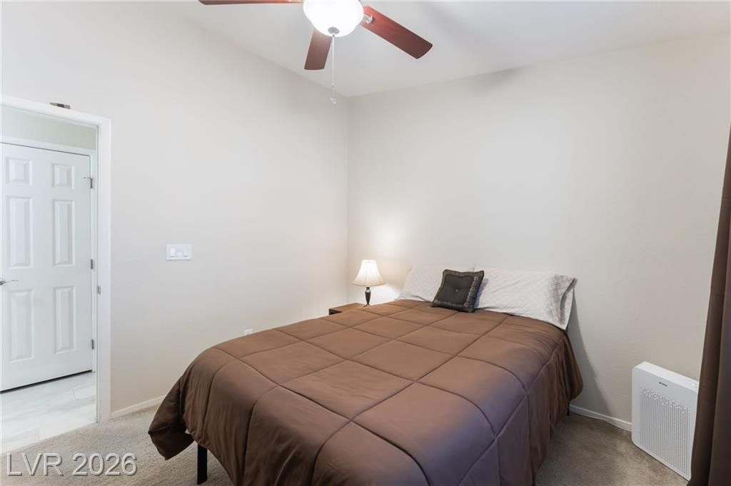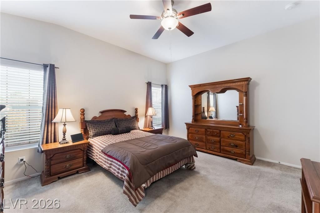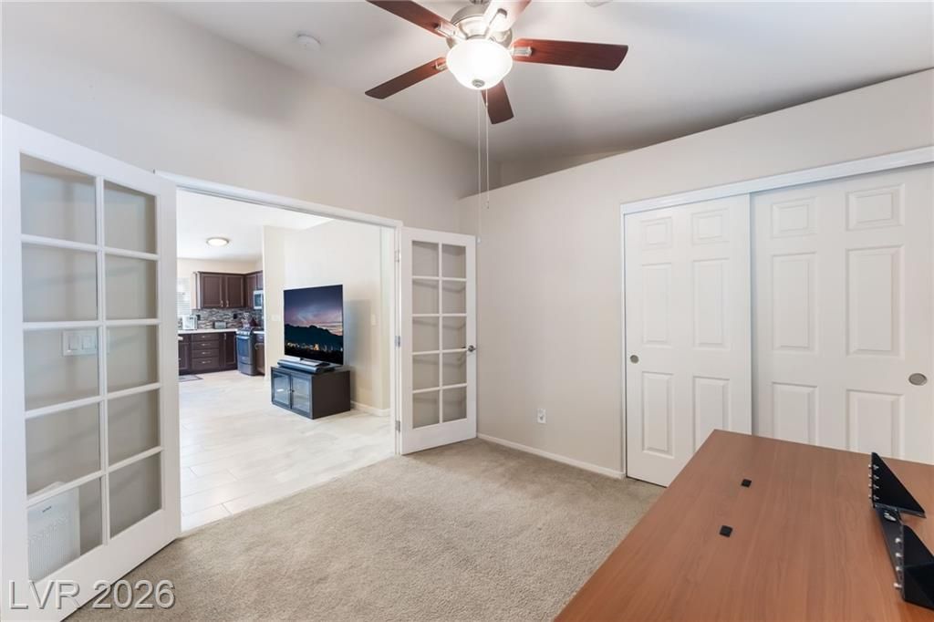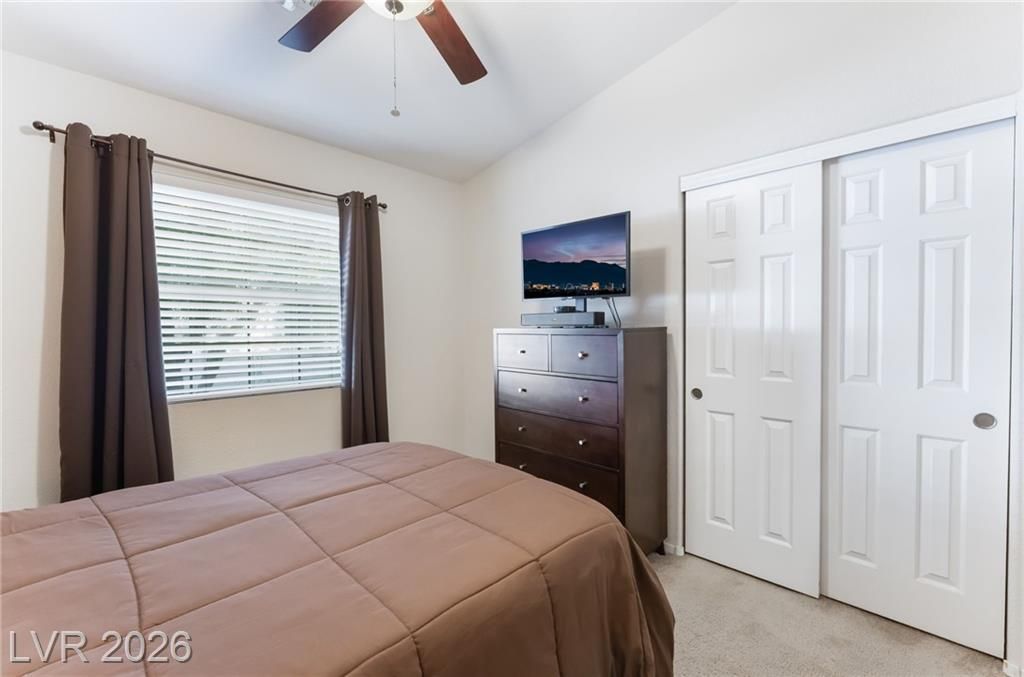Pride of ownership throughout this beautifully maintained home in the gated community of Los Prados, a true hidden gem of Las Vegas. Offering 1,592 SF of living space on a 6,970 SF lot, this 3-bedroom, 2-bath home features a quartz kitchen with island, tile flooring throughout with carpeted bedrooms, ideal for the cooler days and an open family room layout. Additional highlights include a gas fireplace, ceiling fans, faux wood 2" cordless blinds, walk-in closet in the primary bedroom, newer A/C & heating (2021), and a newer garage door. All appliances included. Patio furniture may stay. Los Prados offers community pools, tennis courts, two golf courses, and a clubhouse with restaurant and banquet facilities. Meticulously cared for and move-in ready.
