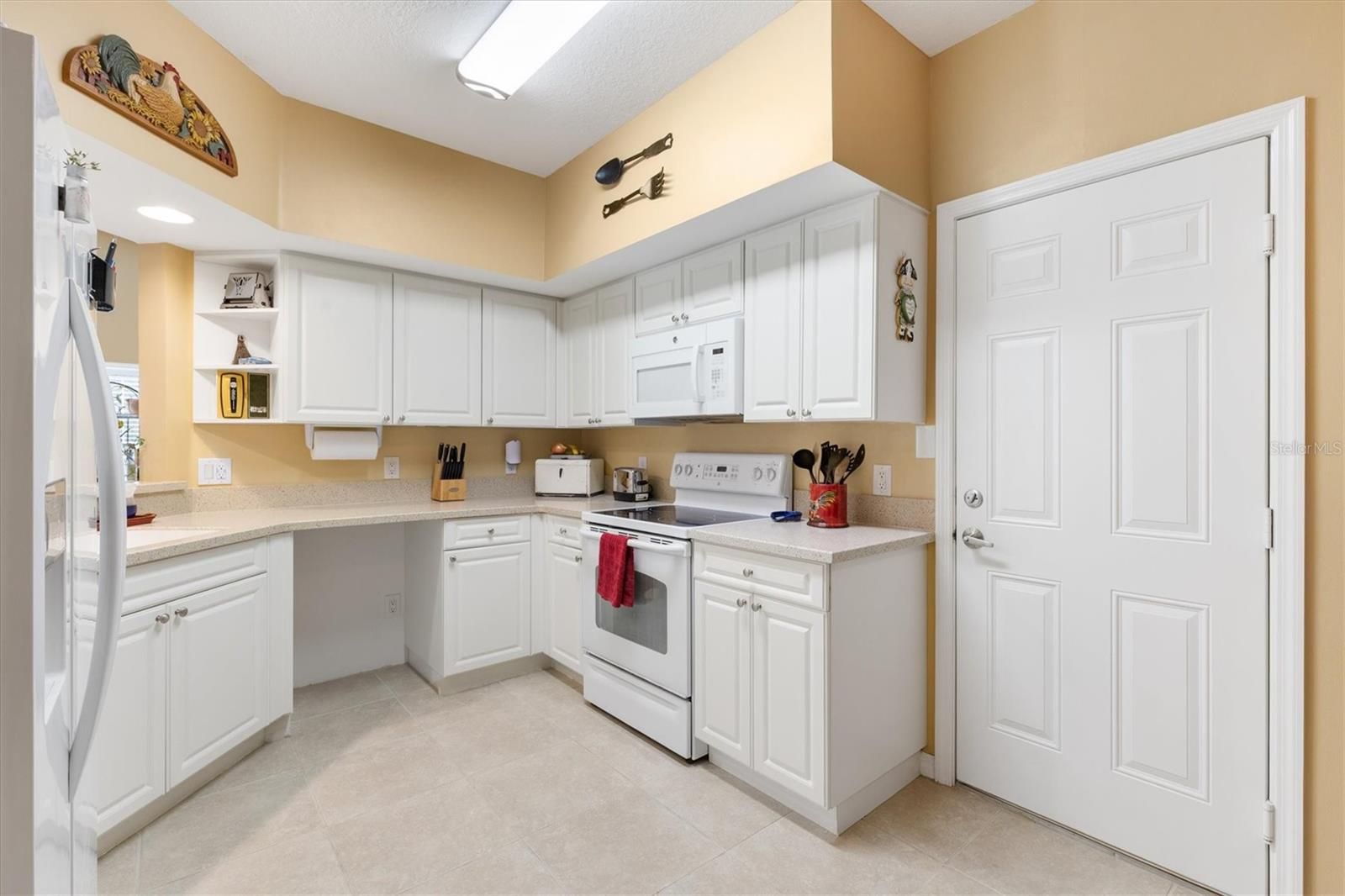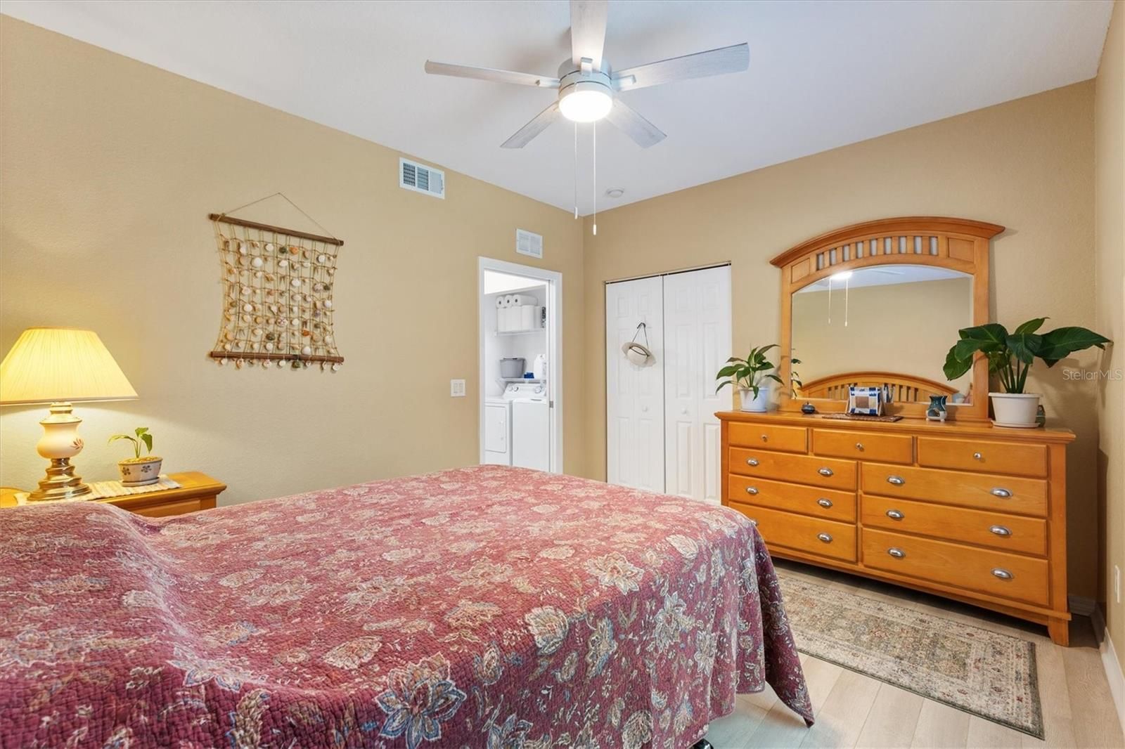 This beautifully maintained 2-bedroom, 2-bath FIRST-FLOOR corner unit offers privacy, natural light, and an open, airy layout you’ll love coming home to. Featuring high ceilings and a spacious open floor plan, this condo lives larger than its square footage. The eat-in kitchen is designed for both functionality and style, showcasing Corian countertops, a breakfast nook, and generous cabinet space—perfect for casual mornings or entertaining guests. Triple sliding glass doors flood the living area with light and lead to a private 16’ x 9’ screened porch, creating seamless indoor-outdoor living. The primary suite offers durable laminate flooring, double vanities, a walk-in shower, and a spacious walk-in closet. A full-size washer and dryer are conveniently located just off the kitchen for everyday ease. The attached garage adds valuable storage and convenience. Major updates include: Corian Countertops (2017), Laminate Flooring in Bedrooms (2017), New AC 2025 Located in a NON age-restricted, gated community loaded with amenities: two pools, two spas, cabana, putting green, dog park, fishing pier, basketball, pickleball, tennis courts, and regular community events. Low maintenance living with resort-style amenities—without age restrictions. Schedule your showing today.