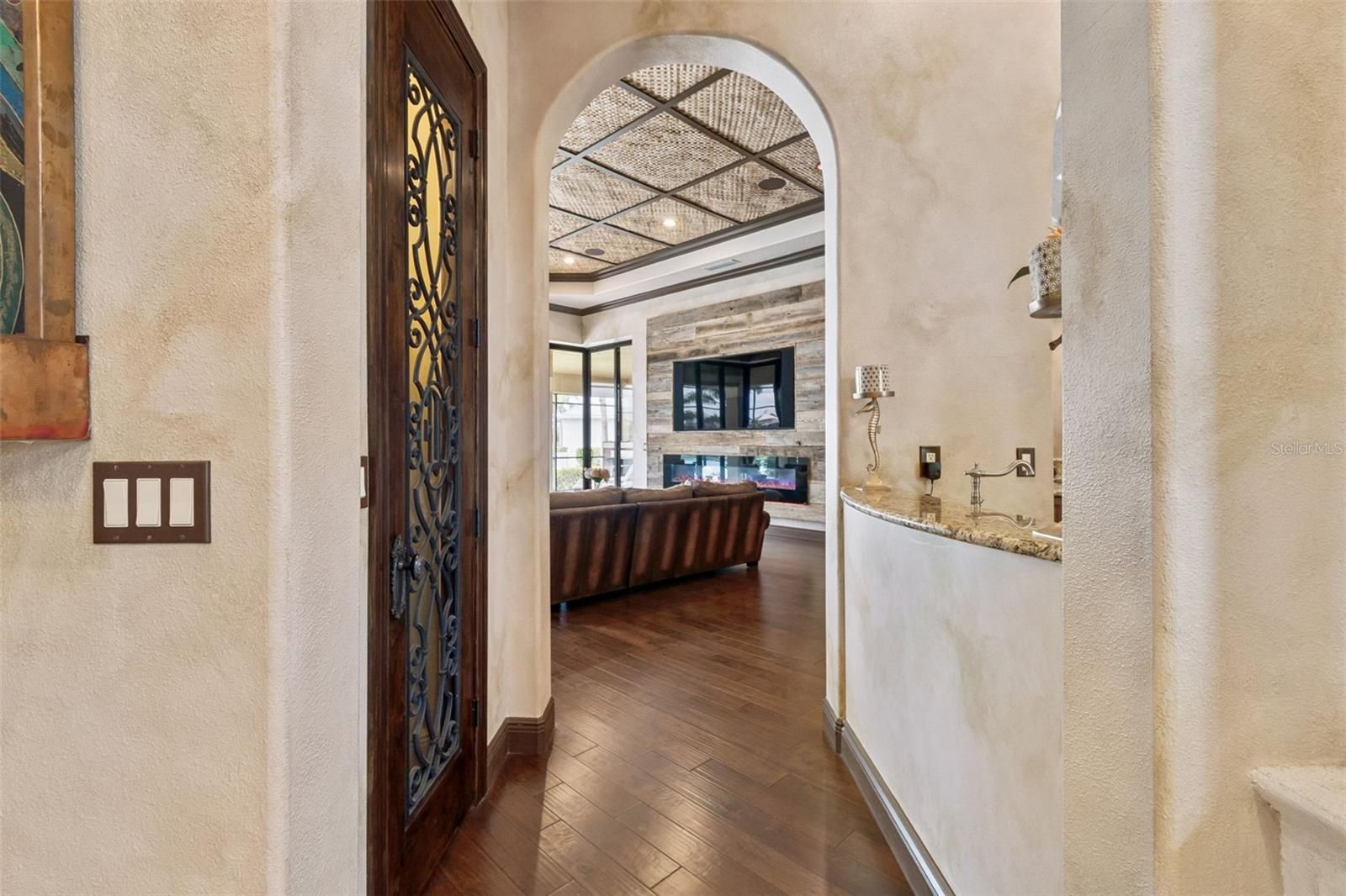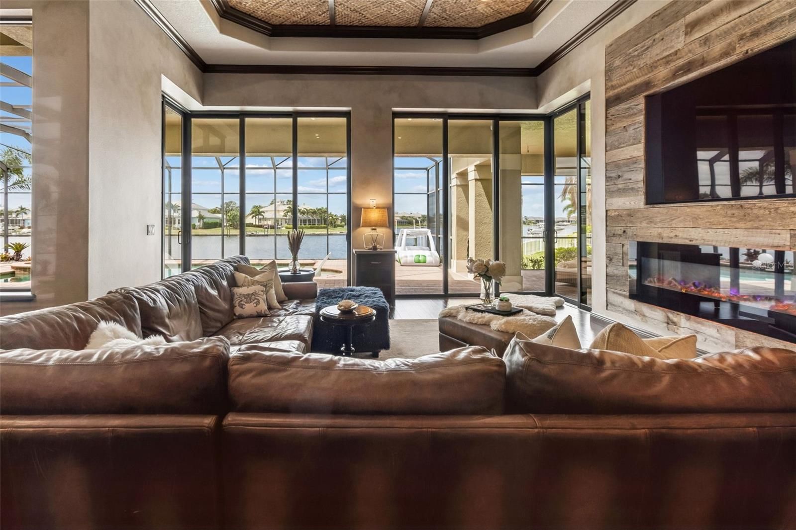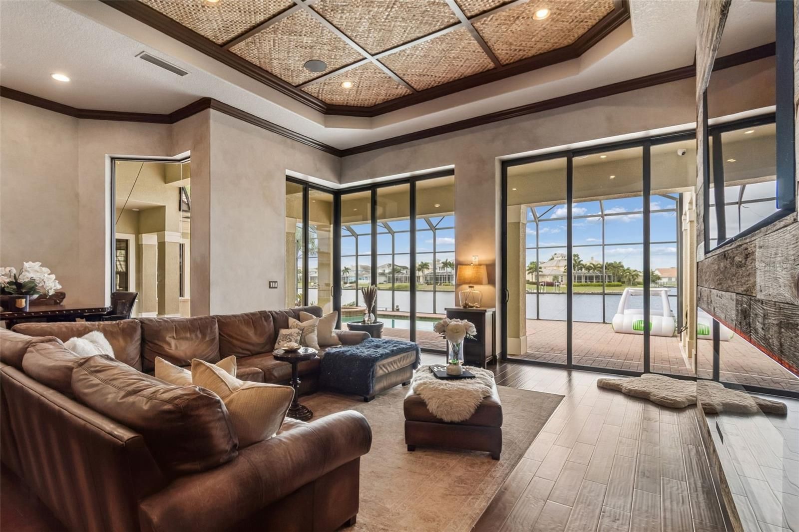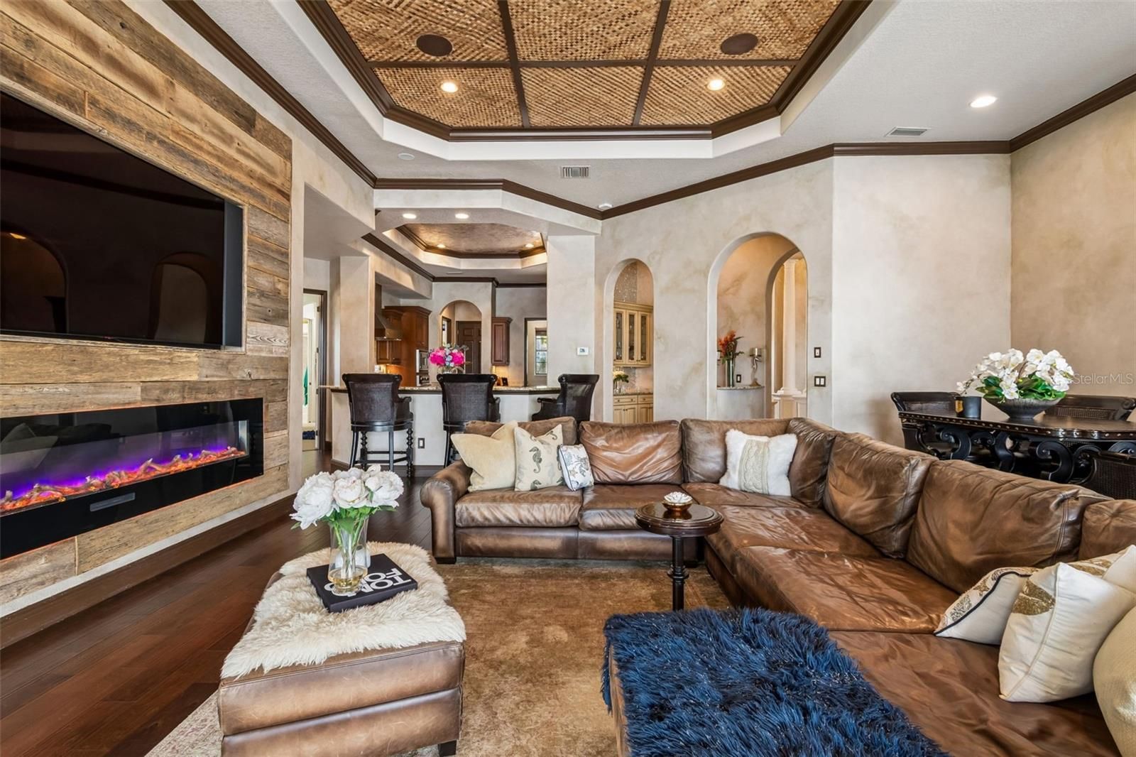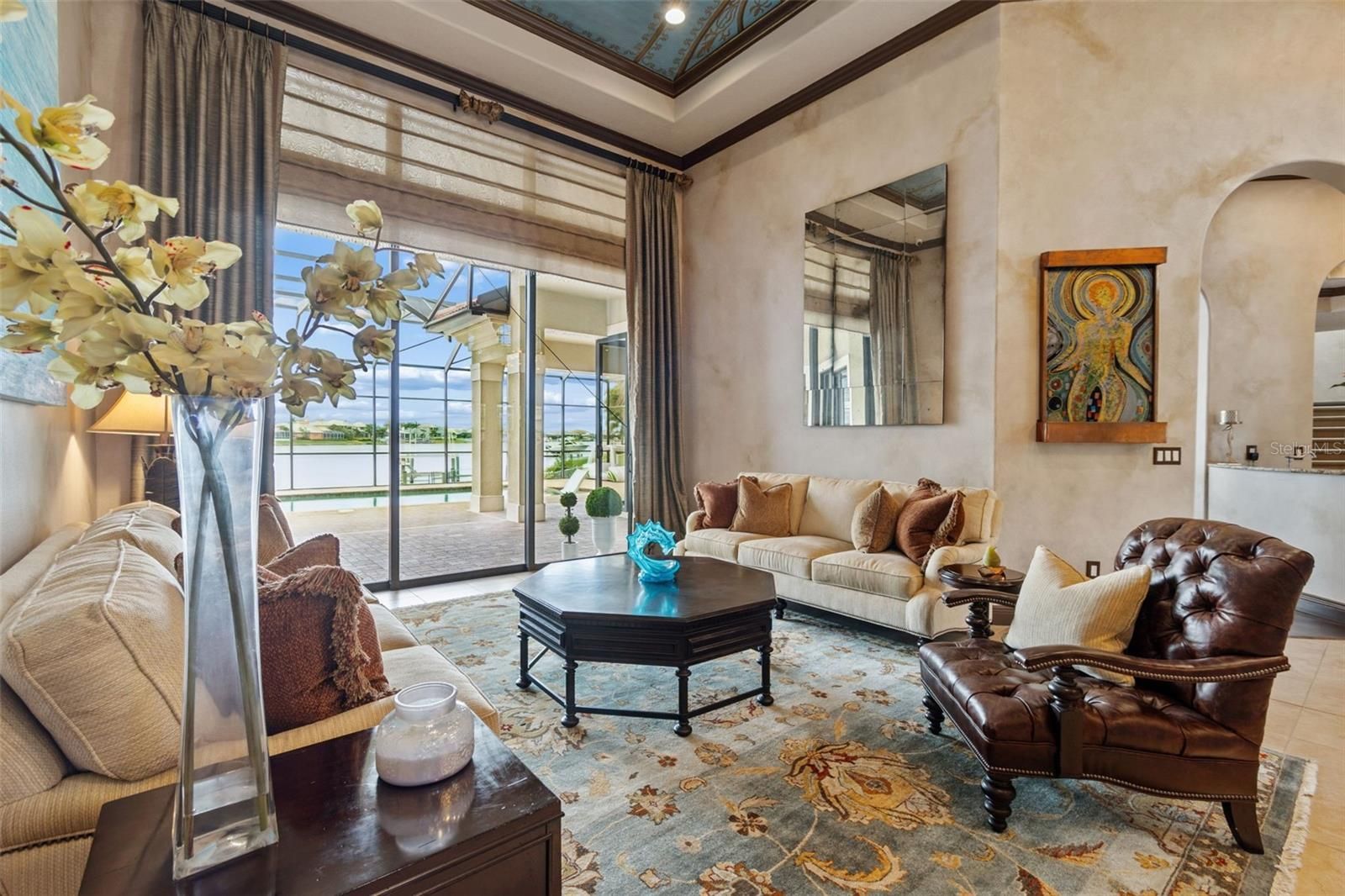 Welcome to a residence where thoughtful design, modern comfort, and timeless character come together in perfect harmony. From the moment you step inside, a soaring foyer draws your eye straight through the living room to the sparkling pool and the tranquil lagoon beyond, a breathtaking first impression that sets the tone for the entire home. Sunset views from the screened-in pool area are nothing short of spectacular. Inside, tall ceilings, custom finishes, and curated textures create a warm, inviting atmosphere that never feels cavernous despite the home’s generous scale. The wine closet, framed by a custom-carved wood detail over glass, pairs beautifully with the striking bar area featuring a mirror-mosaic wall treatment. The family room, kitchen, and eat-in space flow seamlessly together, anchored by an incredible barnwood feature wall with hidden storage, a 77" TV, and an LED fireplace. A woven bamboo ceiling and softly glazed walls add depth and sophistication. The chef’s kitchen is a dream workspace, equipped with Viking appliances, a gas cooktop, a pantry closet, a butler’s pantry, a prep sink, granite countertops, and abundant storage. A mica-accented ceiling inset adds a subtle glow. Nearby, the large laundry room offers a sink and additional storage. Three bedrooms are located on the main level, including the serene primary suite. Overlooking the pool and lagoon, it features a raised sitting area, a massive custom closet, and beautiful lighting. The spa-inspired primary bath includes a walk-in shower facing an outdoor water feature, dual vanities, a makeup area, and a private water closet. The second bedroom includes an ensuite bath and walk-in closet, while the third bedroom offers a large walk-in closet and peaceful water views. The screened-in pool area features brick decking, a gas fireplace, and a fully equipped outdoor kitchen with a brand-new built-in gas grill, tile countertops, and ample storage. The 15,000-square-foot lot includes 100 feet along the lagoon — one of Mirabay’s premier waterfront addresses. A low-maintenance riprap shoreline and a wood dock with power and water make it easy to enjoy kayaking, canoeing, or simply watching the sunset. Upstairs, you’ll find a private fourth bedroom with a walk-in closet, a full bath, and a spacious multipurpose room ideal for a home theater, fitness studio, or game room. Hand-painted ceiling details, textured walls, and a balcony overlooking the water add charm and character. Recent updates include three new AC units (2024 and 2026). The exterior is equally impressive, with lush tropical landscaping, split garages (one-car and two-car), and a wide paver driveway perfect for guests. A custom vertical fountain near the entry sets a soothing tone before you even step inside. There are custom decorative finishes throughout the home. Control4 home automation (multi-room audio, home theater, HVAC, partial interior lighting, monitored security, video surveillance, garage door control) provides comfort, convenience, and peace of mind. Located within a private gated enclave inside Mirabay, residents enjoy world-class amenities: pickleball, tennis, and basketball courts; a resort-style pool; a community restaurant; gym and sauna; playgrounds; yoga, stretch, and Zumba classes; plus complimentary kayaks, sailboats, and paddleboards. You truly never have to leave. And when you do, you’re just 30 minutes from downtown Tampa or St. Pete, and under an hour to Sarasota.