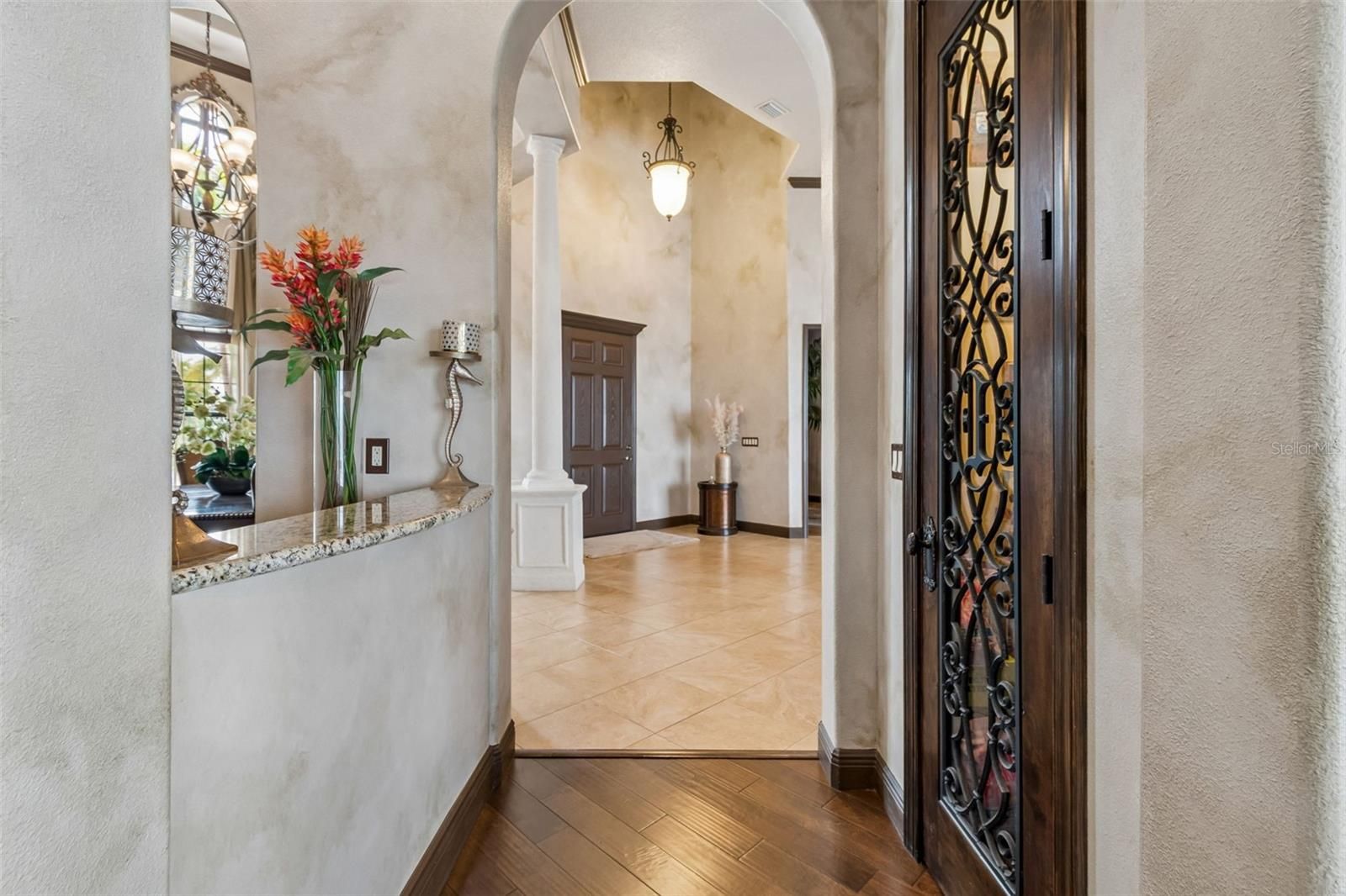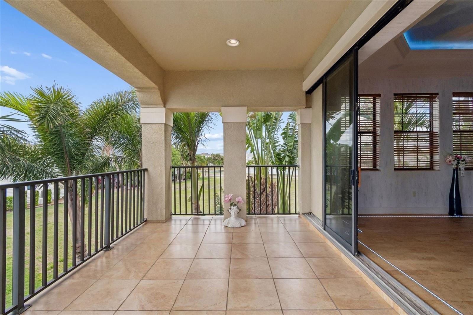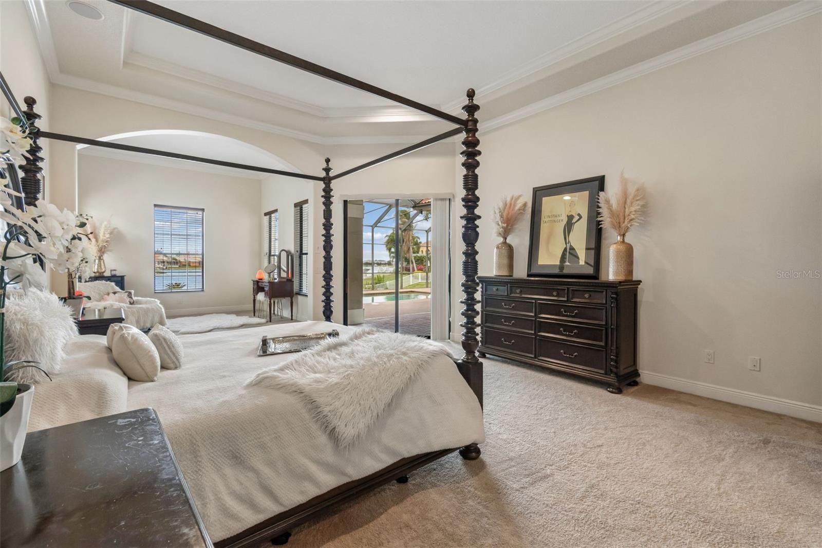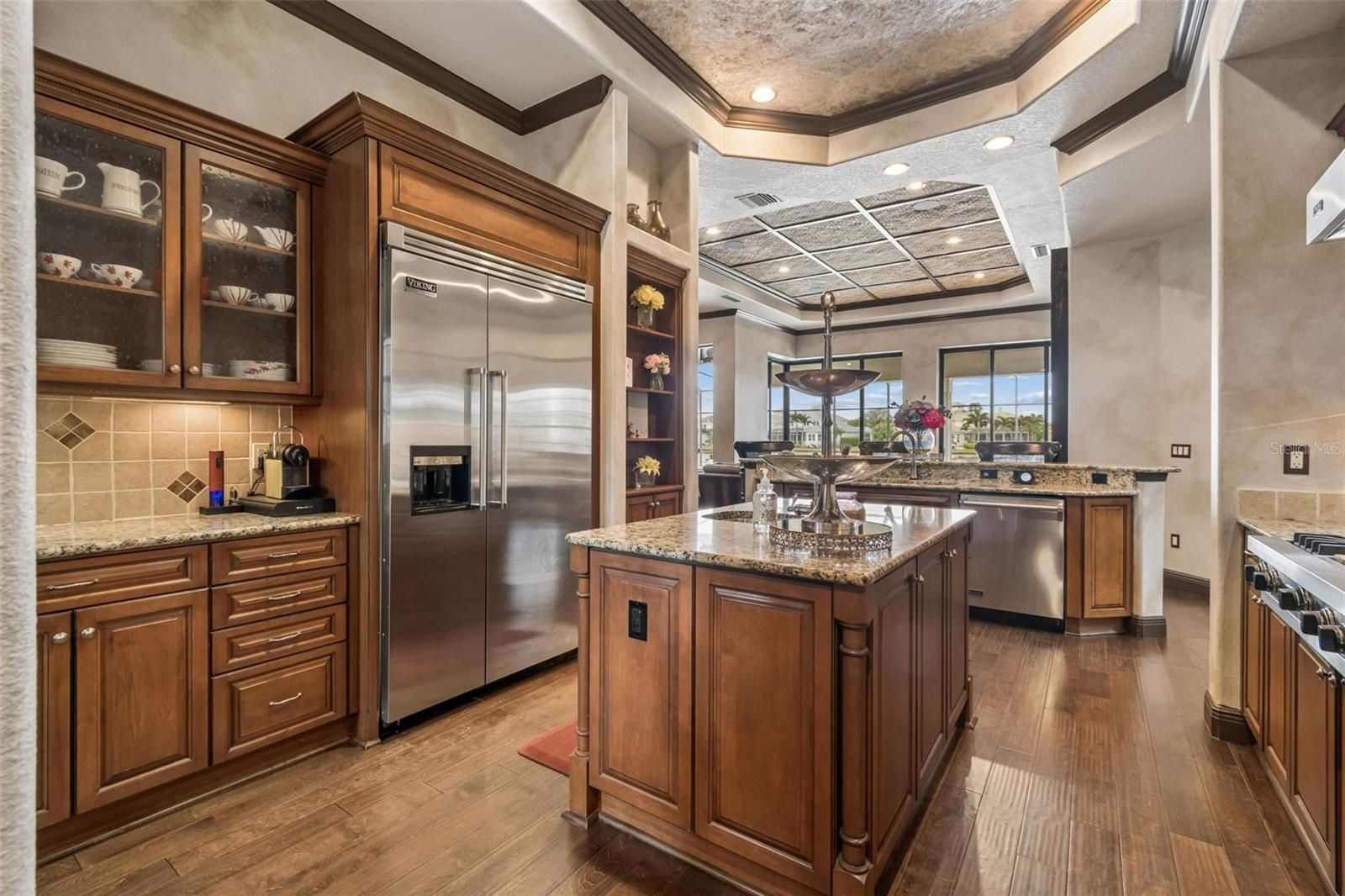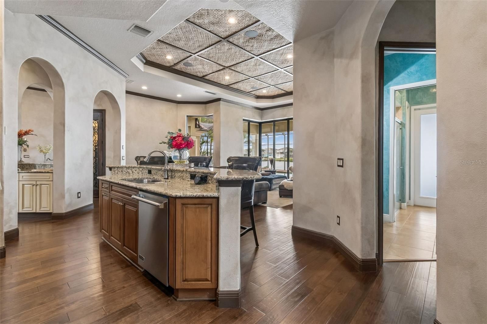 Welcome to a residence where thoughtful design, modern comfort, and timeless character come together in perfect harmony. From the moment you step inside, a soaring foyer draws your eye straight through the living room to the sparkling pool and the tranquil lagoon beyond, a breathtaking first impression that sets the tone for the entire home. Sunset views from the screened-in pool area are nothing short of spectacular. Inside, tall ceilings, custom finishes, and curated textures create a warm, inviting atmosphere that never feels cavernous despite the home’s generous scale. The wine closet, framed by a custom-carved wood detail over glass, pairs beautifully with the striking bar area featuring a mirror-mosaic wall treatment. The family room, kitchen, and eat-in space flow seamlessly together, anchored by an incredible barnwood feature wall with hidden storage, a 77" TV, and an LED fireplace. A woven bamboo ceiling and softly glazed walls add depth and sophistication. The chef’s kitchen is a dream workspace, equipped with Viking appliances, a gas cooktop, a pantry closet, a butler’s pantry, a prep sink, granite countertops, and abundant storage. A mica-accented ceiling inset adds a subtle glow. Nearby, the large laundry room offers a sink and additional storage. Three bedrooms are located on the main level, including the serene primary suite. Overlooking the pool and lagoon, it features a raised sitting area, a massive custom closet, and beautiful lighting. The spa-inspired primary bath includes a walk-in shower facing an outdoor water feature, dual vanities, a makeup area, and a private water closet. The second bedroom includes an ensuite bath and walk-in closet, while the third bedroom offers a large walk-in closet and peaceful water views. The screened-in pool area features brick decking, a gas fireplace, and a fully equipped outdoor kitchen with a brand-new built-in gas grill, tile countertops, and ample storage. The 15,000-square-foot lot includes 100 feet along the lagoon — one of Mirabay’s premier waterfront addresses. A low-maintenance riprap shoreline and a wood dock with power and water make it easy to enjoy kayaking, canoeing, or simply watching the sunset. Upstairs, you’ll find a private fourth bedroom with a walk-in closet, a full bath, and a spacious multipurpose room ideal for a home theater, fitness studio, or game room. Hand-painted ceiling details, textured walls, and a balcony overlooking the water add charm and character. Recent updates include three new AC units (2024 and 2026). The exterior is equally impressive, with lush tropical landscaping, split garages (one-car and two-car), and a wide paver driveway perfect for guests. A custom vertical fountain near the entry sets a soothing tone before you even step inside. There are custom decorative finishes throughout the home. Control4 home automation (multi-room audio, home theater, HVAC, partial interior lighting, monitored security, video surveillance, garage door control) provides comfort, convenience, and peace of mind. Located within a private gated enclave inside Mirabay, residents enjoy world-class amenities: pickleball, tennis, and basketball courts; a resort-style pool; a community restaurant; gym and sauna; playgrounds; yoga, stretch, and Zumba classes; plus complimentary kayaks, sailboats, and paddleboards. You truly never have to leave. And when you do, you’re just 30 minutes from downtown Tampa or St. Pete, and under an hour to Sarasota.