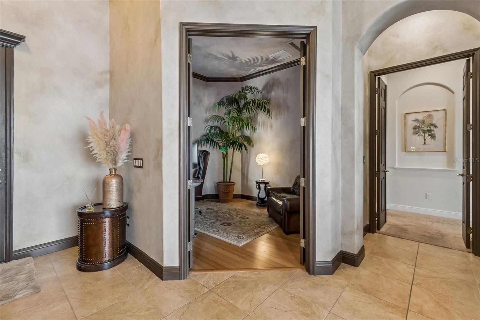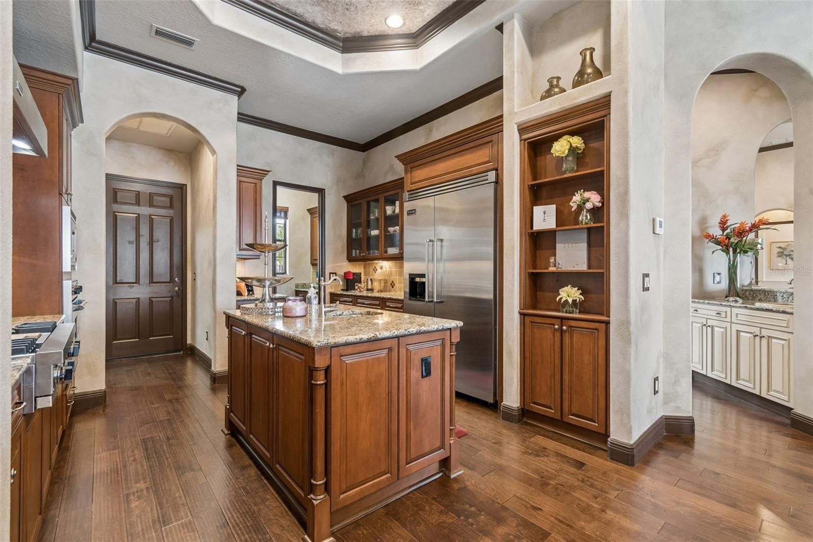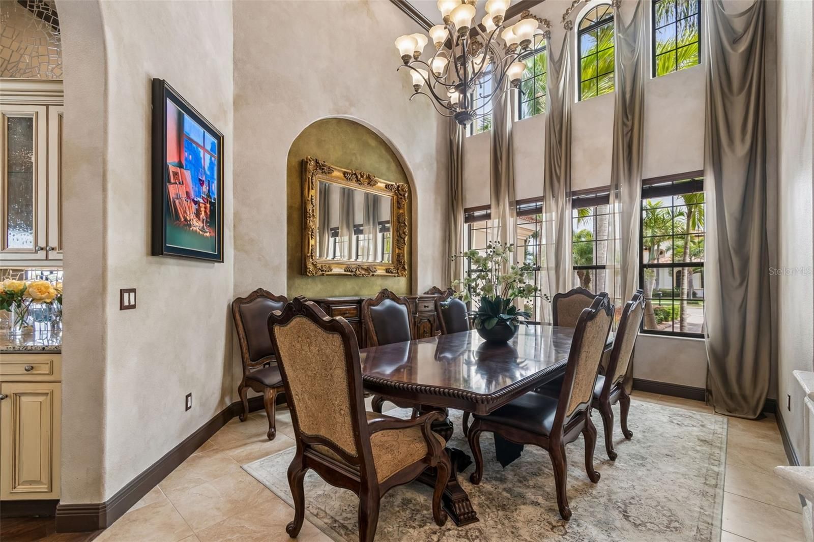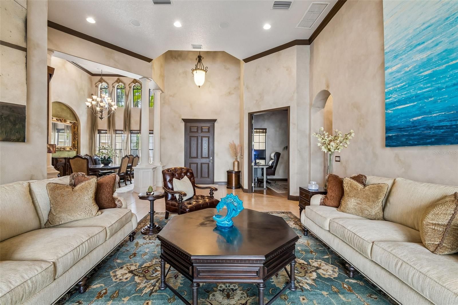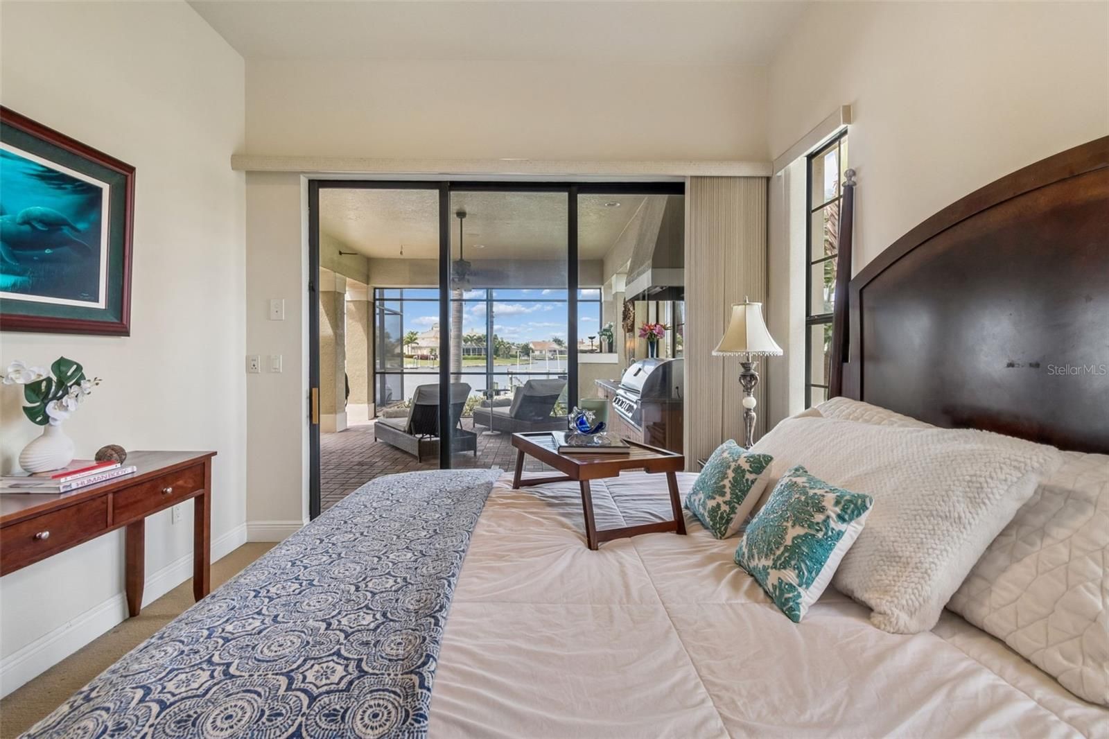 Welcome to a residence where thoughtful design, modern comfort, and timeless character come together in perfect harmony. From the moment you step inside, a soaring foyer draws your eye straight through the living room to the sparkling pool and the tranquil lagoon beyond, a breathtaking first impression that sets the tone for the entire home. Sunset views from the screened-in pool area are nothing short of spectacular. Inside, tall ceilings, custom finishes, and curated textures create a warm, inviting atmosphere that never feels cavernous despite the home’s generous scale. The wine closet, framed by a custom-carved wood detail over glass, pairs beautifully with the striking bar area featuring a mirror-mosaic wall treatment. The family room, kitchen, and eat-in space flow seamlessly together, anchored by an incredible barnwood feature wall with hidden storage, a 77" TV, and an LED fireplace. A woven bamboo ceiling and softly glazed walls add depth and sophistication. The chef’s kitchen is a dream workspace, equipped with Viking appliances, a gas cooktop, a pantry closet, a butler’s pantry, a prep sink, granite countertops, and abundant storage. A mica-accented ceiling inset adds a subtle glow. Nearby, the large laundry room offers a sink and additional storage. Three bedrooms are located on the main level, including the serene primary suite. Overlooking the pool and lagoon, it features a raised sitting area, a massive custom closet, and beautiful lighting. The spa-inspired primary bath includes a walk-in shower facing an outdoor water feature, dual vanities, a makeup area, and a private water closet. The second bedroom includes an ensuite bath and walk-in closet, while the third bedroom offers a large walk-in closet and peaceful water views. The screened-in pool area features brick decking, a gas fireplace, and a fully equipped outdoor kitchen with a brand-new built-in gas grill, tile countertops, and ample storage. The 15,000-square-foot lot includes 100 feet along the lagoon — one of Mirabay’s premier waterfront addresses. A low-maintenance riprap shoreline and a wood dock with power and water make it easy to enjoy kayaking, canoeing, or simply watching the sunset. Upstairs, you’ll find a private fourth bedroom with a walk-in closet, a full bath, and a spacious multipurpose room ideal for a home theater, fitness studio, or game room. Hand-painted ceiling details, textured walls, and a balcony overlooking the water add charm and character. Recent updates include three new AC units (2024 and 2026). The exterior is equally impressive, with lush tropical landscaping, split garages (one-car and two-car), and a wide paver driveway perfect for guests. A custom vertical fountain near the entry sets a soothing tone before you even step inside. There are custom decorative finishes throughout the home. Control4 home automation (multi-room audio, home theater, HVAC, partial interior lighting, monitored security, video surveillance, garage door control) provides comfort, convenience, and peace of mind. Located within a private gated enclave inside Mirabay, residents enjoy world-class amenities: pickleball, tennis, and basketball courts; a resort-style pool; a community restaurant; gym and sauna; playgrounds; yoga, stretch, and Zumba classes; plus complimentary kayaks, sailboats, and paddleboards. You truly never have to leave. And when you do, you’re just 30 minutes from downtown Tampa or St. Pete, and under an hour to Sarasota.
