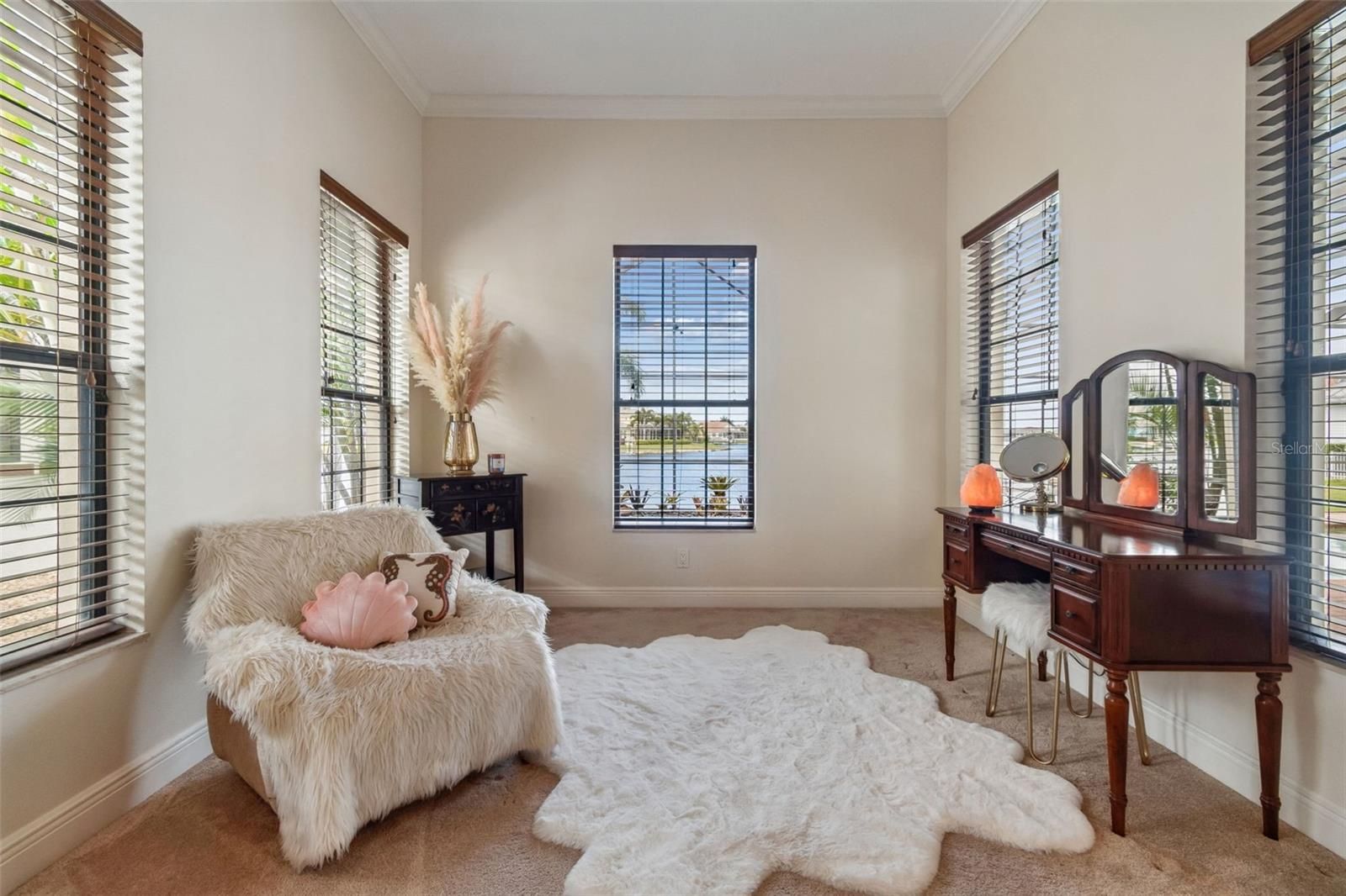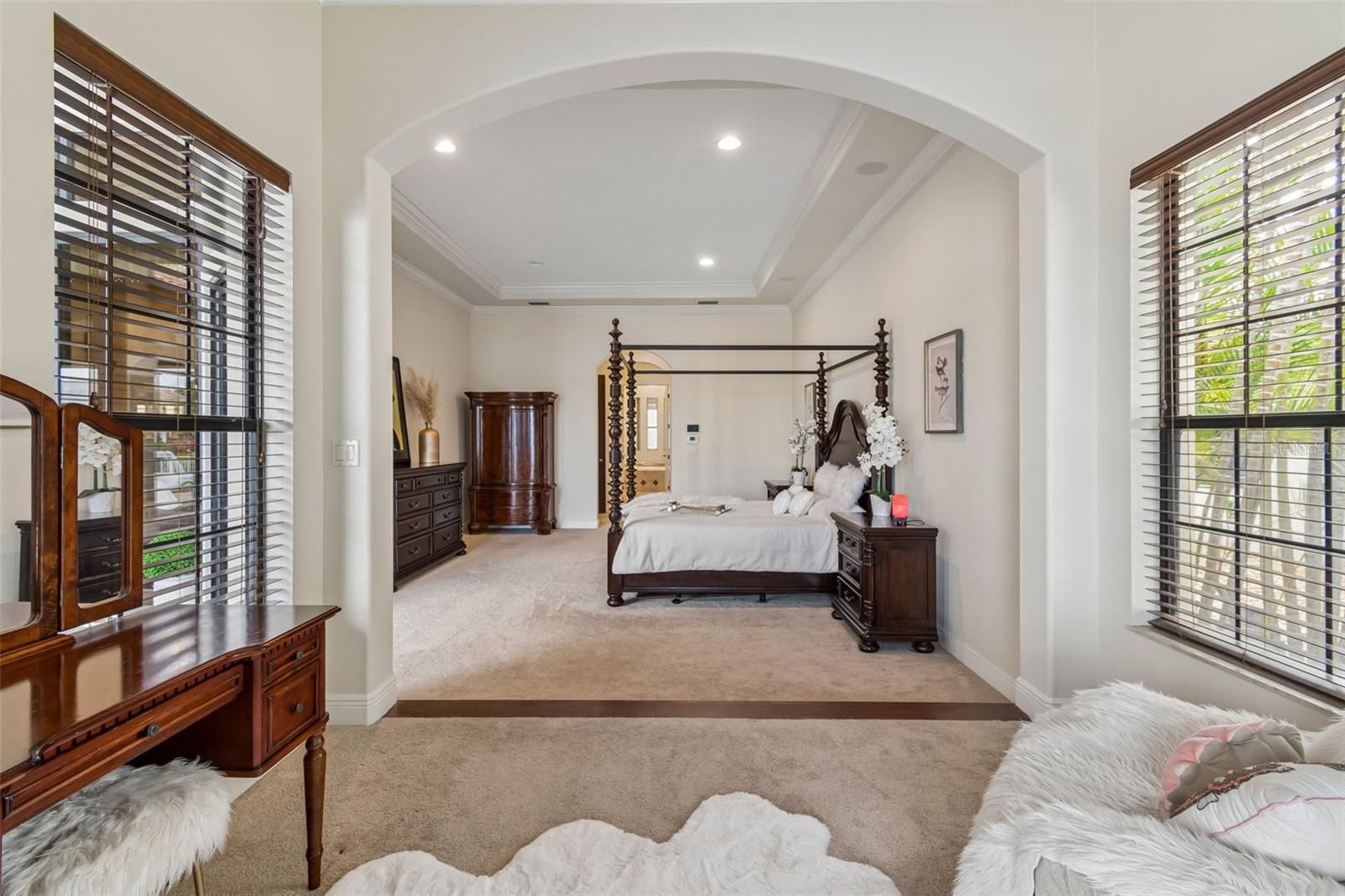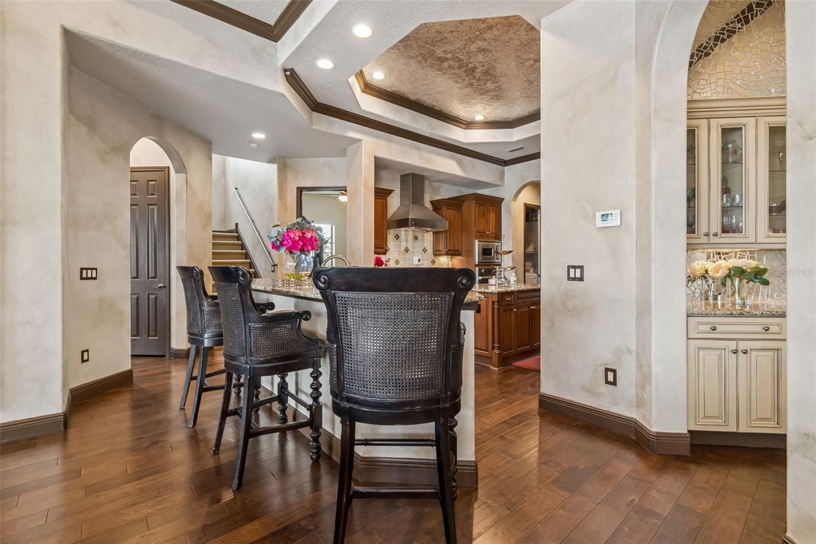 - Ceiling Fan(s), Crown Molding, Dry Bar, High Ceilings, Open Floorplan, Main Level Primary, Solid-Wood Cabinets, Split Bedrooms, Stone Counters, Thermostat, Tray Ceiling(s), Walk-In Closet(s), Window Treatments