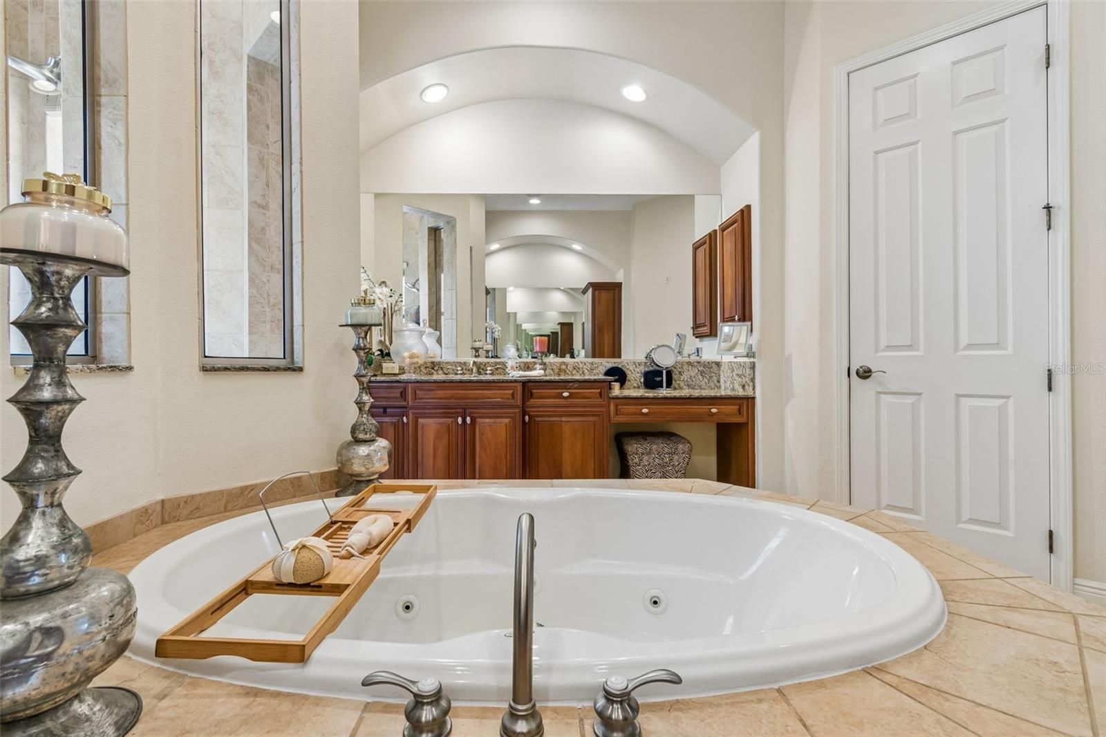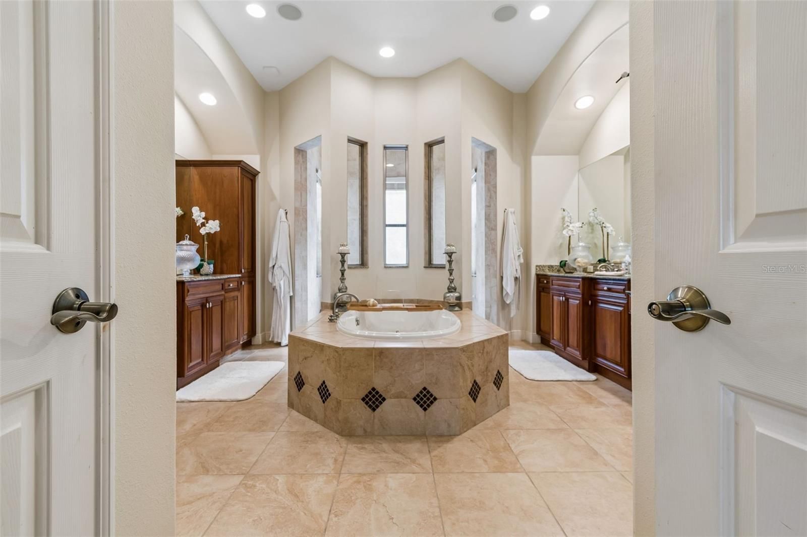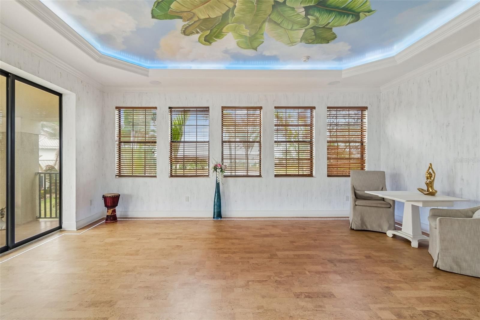 - Ceiling Fan(s), Crown Molding, Dry Bar, High Ceilings, Open Floorplan, Main Level Primary, Solid-Wood Cabinets, Split Bedrooms, Stone Counters, Thermostat, Tray Ceiling(s), Walk-In Closet(s), Window Treatments