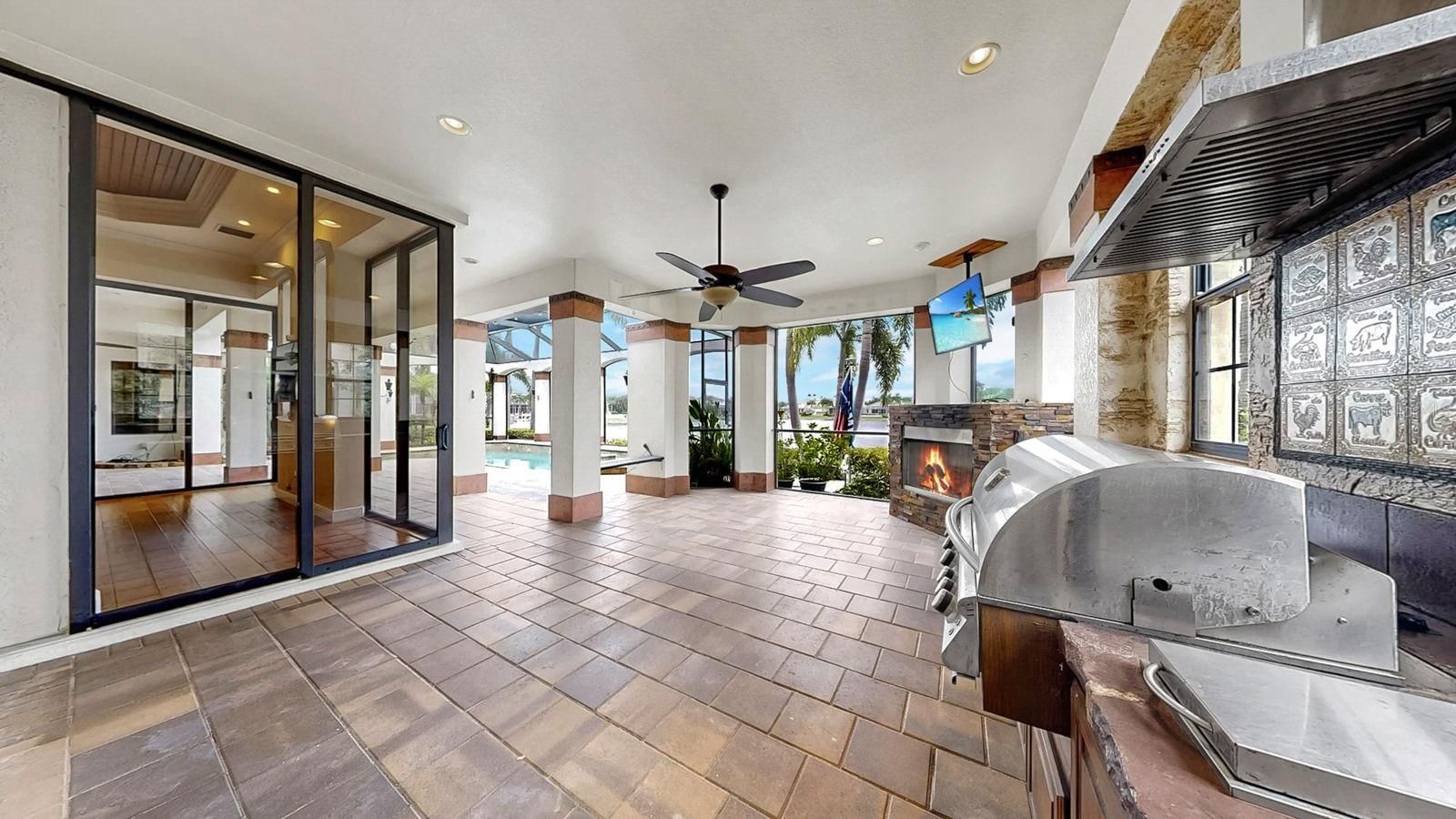 One or more photo(s) has been virtually staged. SELLER MUST SELL & HIGHLY MOTIVATED!! Seller will contribute 20k towards buyer’s closing cost if closing occurs by Feb 28. Experience the epitome of luxury living in this stunning waterfront Spanish Mediterranean home, meticulously crafted by John Cannon’s Executive Series. Nestled in the prestigious Bay Estate of Mirabay, this residence showcases breathtaking manicured landscaping featuring vibrant pink bougainvilleas, towering palms, and a grand pavered driveway that exudes an enchanting curb appeal. Step through the grand double doors and be transported to a Mediterranean charm and beyond. Every inch of this home is a masterpiece, with artistic hand-painted accents throughout. Soaring ceilings, classical columns, exposed wood beams, and intricate crown molding create an ambiance of timeless elegance. Rich Brazilian cherry hardwood floors and authentic Mexican terracotta tiles set a warm, inviting tone. Fully renovated gourmet kitchen is a culinary dream, boasting dark, luxurious cabinets, Brazilian granite countertops, a genuine copper sink, a massive island, state-of-the-art appliances, and a spacious coffee bar/pantry with a beautifully hand-carved Turkish wooden door. Large family room invites you to gather with loved ones, featuring a built-in bar ideal for crafting the perfect cocktail and creating joyful moments with guests. This space is designed for relaxed entertaining and memorable gatherings. Magnificent master suite, featuring a generous sitting area with bay windows, sliding doors to the covered lanai and pool, tray ceilings with double crown molding, and two expansive California closets. Spa-like master bath offers dual vanities, a garden tub as a focal point, and a large walk-around shower, creating a private sanctuary. On the opposite wing, discover two sizable bedrooms with elegant bathrooms, and a convenient laundry room. Notice the custom hand-carved risers as you head upstairs, where you will find a versatile bonus room with balcony access offers stunning views of the sprawling lagoon, while an additional guest suite with its own private balcony provides comfort and privacy for visitors. Other features include impact windows that offer panoramic views, while providing peace of mind during storms. Upgraded lighting and ceiling fans throughout creates a warm and inviting ambiance, accentuating the exquisite finishes and elegant architecture. Relax and unwind in the serene pool and jacuzzi overlooking the water, or enjoy the multiple outdoor sitting areas. Cozy up by the outdoor fireplace in cooler months or host unforgettable gatherings in the outdoor kitchen and grill area. Included with the property is a meticulously maintained 27-foot Crownline boat, a 2003 model that has recently undergone a complete rebuild. A powerful 10,000-pound boat lift is also included, providing secure and easy mooring for your vessel. Whether you’re hosting gatherings, enjoying mornings on the water, this property offers the perfect combination of elegance, functionality, and recreational opportunity. Located within the Mirabay community, you'll have access to a host of amenities for every family member—tennis, pickleball, resort-style pools, a large lagoon for water sports, dog parks, playgrounds, and more. This exquisite home offers the perfect blend of artistic elegance, modern luxury, and vibrant community life—an extraordinary place to call home.