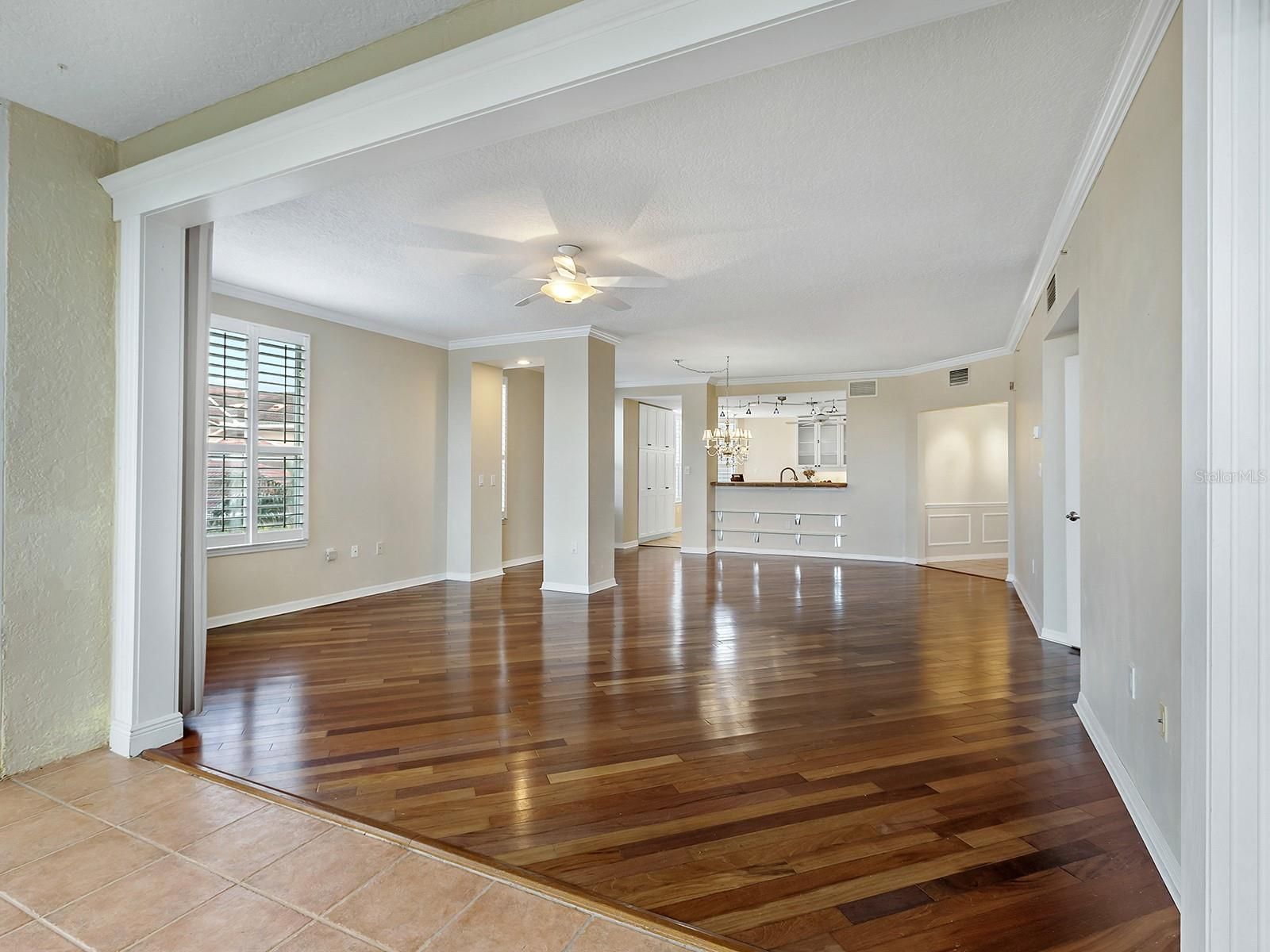 - Ceiling Fan(s), Crown Molding, Eat-in Kitchen, Living/Dining Room, Open Floorplan, Main Level Primary, Solid Surface Counters, Walk-In Closet(s), Window Treatments